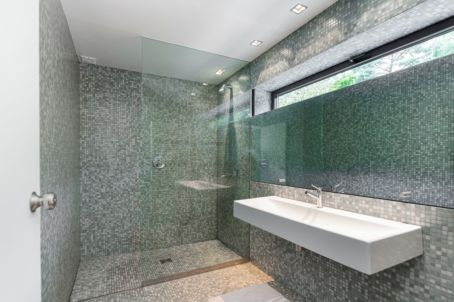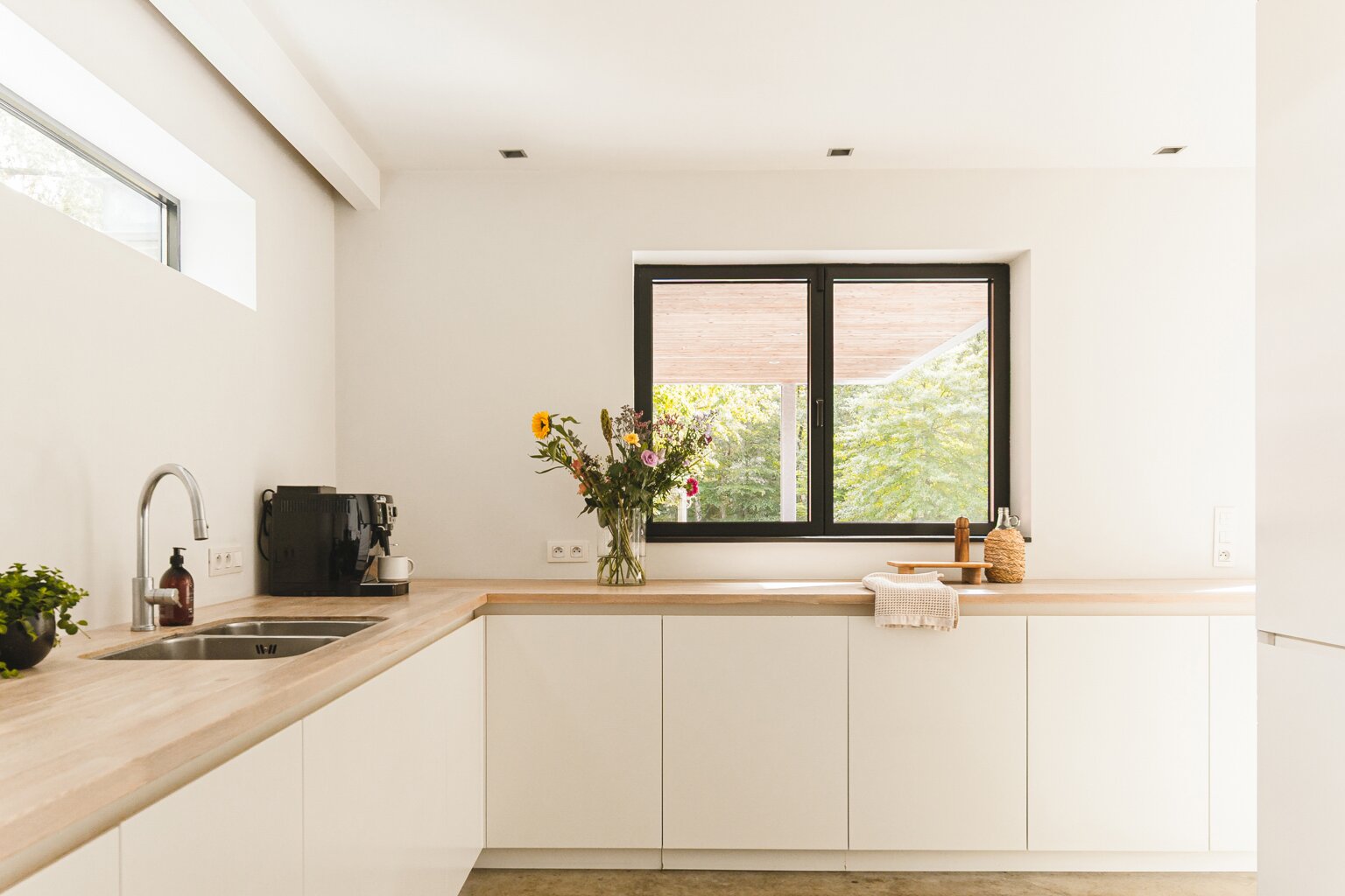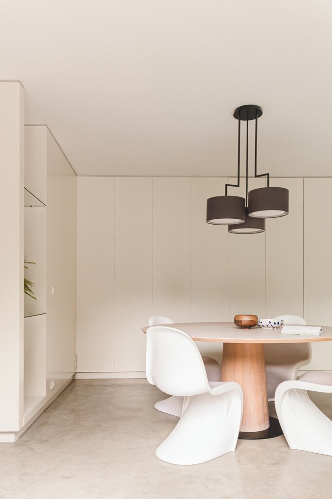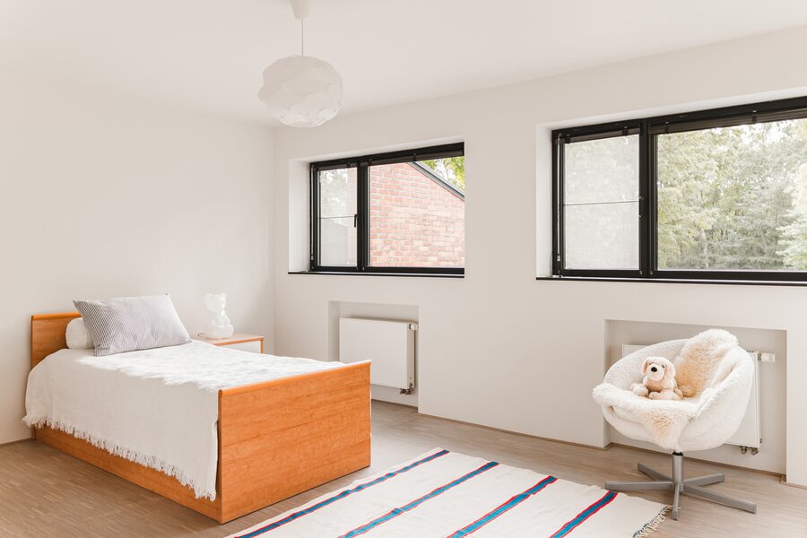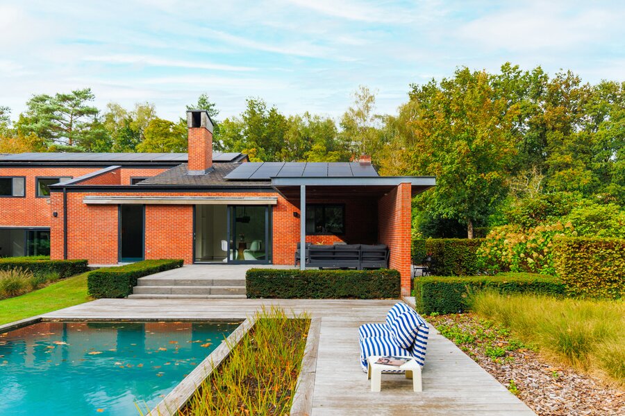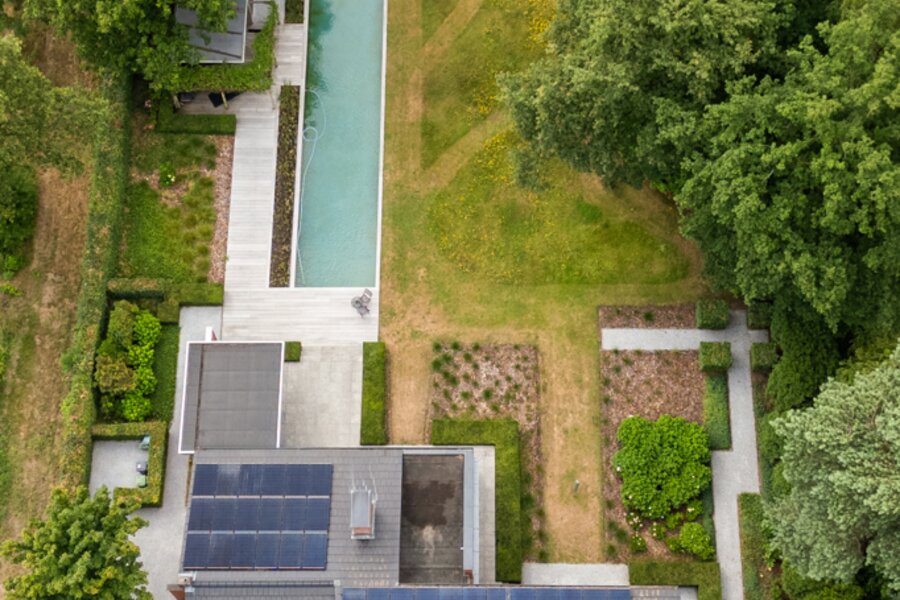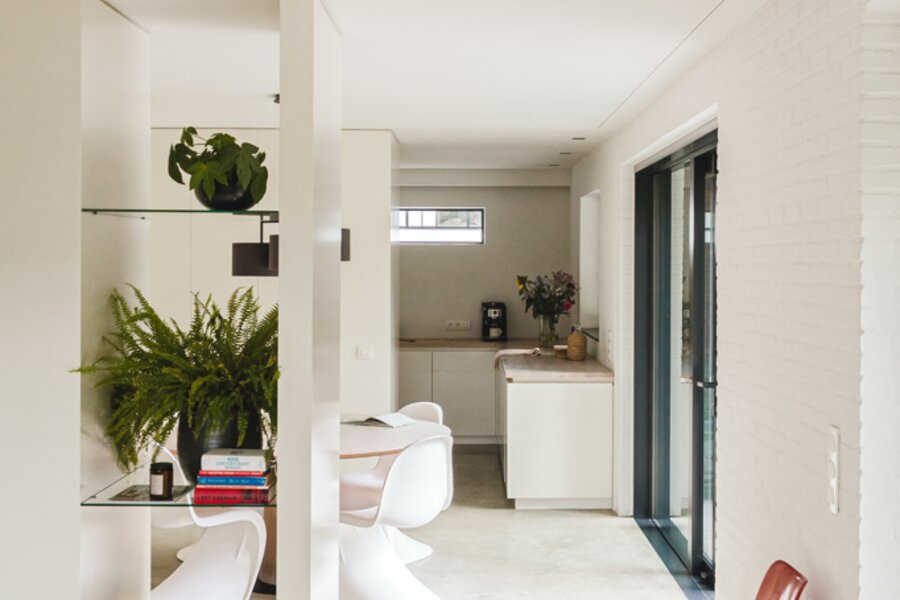 Le design épuré d'Albert Vanbelle, est renforcé par la façade en pierre rouge taillée à la machine. Les propriétaires ont acheté cette villa sur un terrain de 4042 m2 en 2003 au constructeur d'origine. Les murs intérieurs en pierre de taille blanche donnent un aspect brutal. Après la rénovation, les installations techniques ont été renouvelées et l'enveloppe du bâtiment a été isolée au maximum, tandis que le caractère architectural a été préservé de manière optimale. Nouveautés : sol en béton coulé avec chauffage par le sol au rez-de-chaussée.