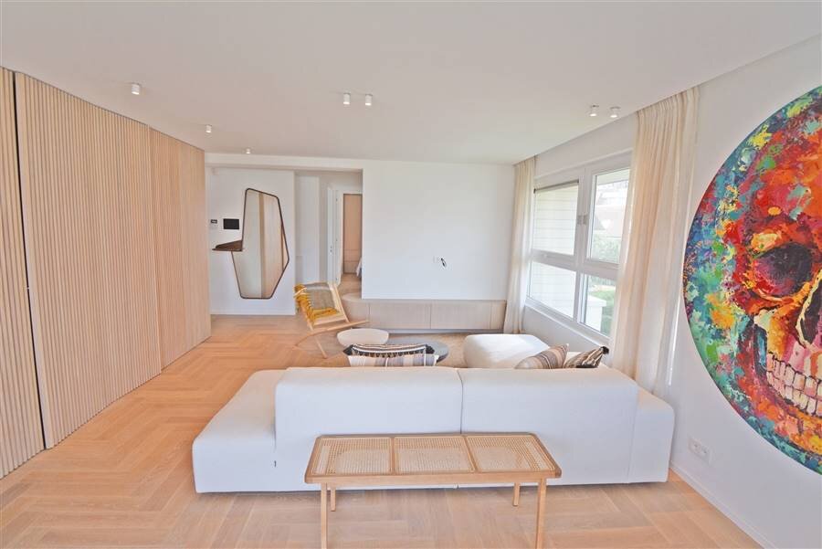 Bij binnenkomst wordt u verwelkomd door een ruime en lichte leefruimte. De grote ramen zorgen voor een overvloed aan natuurlijk licht en bieden een prachtig uitzicht op de omgeving. De strakke en moderne afwerking in de woonkamer gaat moeiteloos over in de eetruimte, ideaal voor gezellige diners met familie en vrienden.