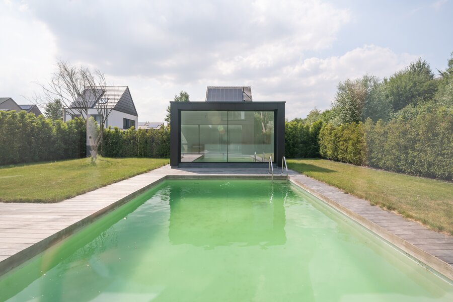 De woning wordt afgewerkt met een prachtig aangelegde tuin, voorzien van een zwembad met doorkijkraam naar de kelderverdieping, een zonneterras en een bijgebouw met kelder.