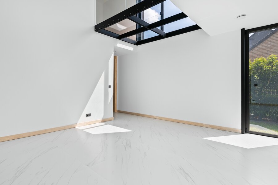 Bij het betreden van de villa kom je binnen in een stijlvolle inkomhal, gevolgd door een gastentoilet met handenwasser. De leefruimte van 85 m², afgewerkt met marmeren tegels, biedt plaats aan een gezellige zithoek, een ruime eetplaats en een open keuken. Aansluitend bevindt zich de inpandige garage van 19,6 m² met automatische poort.