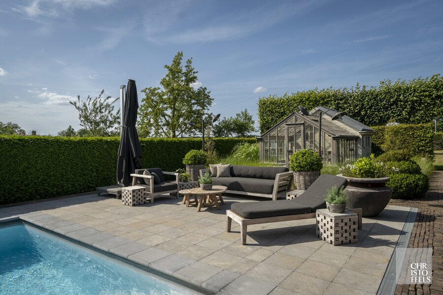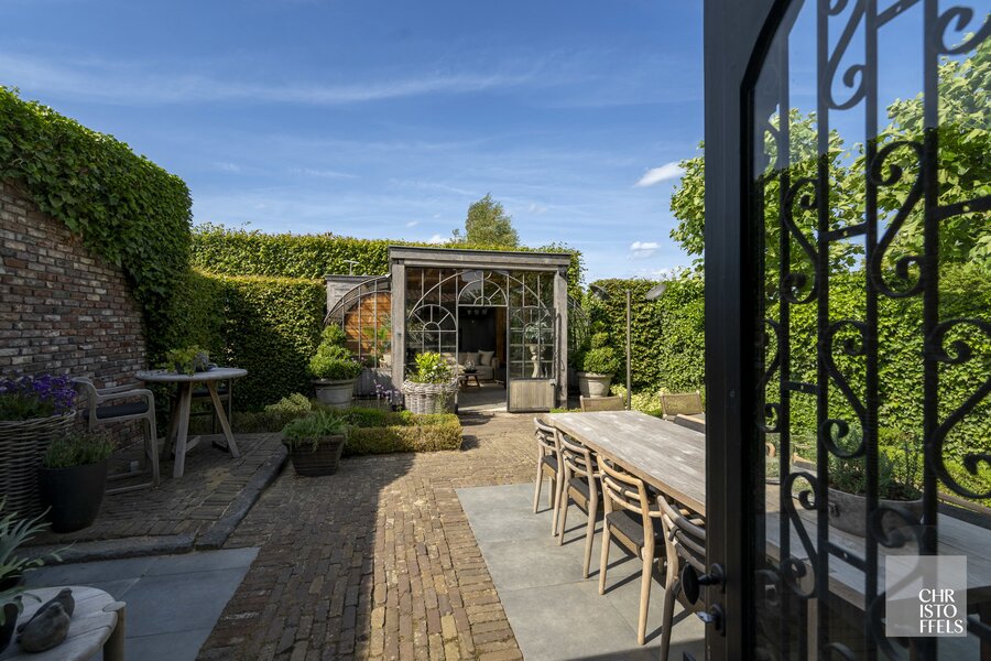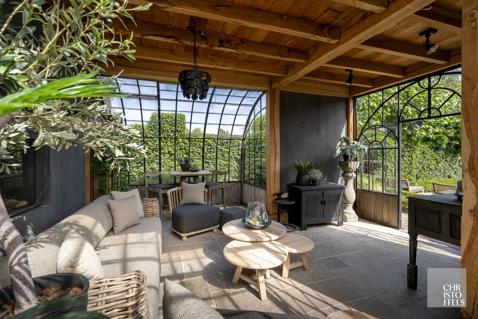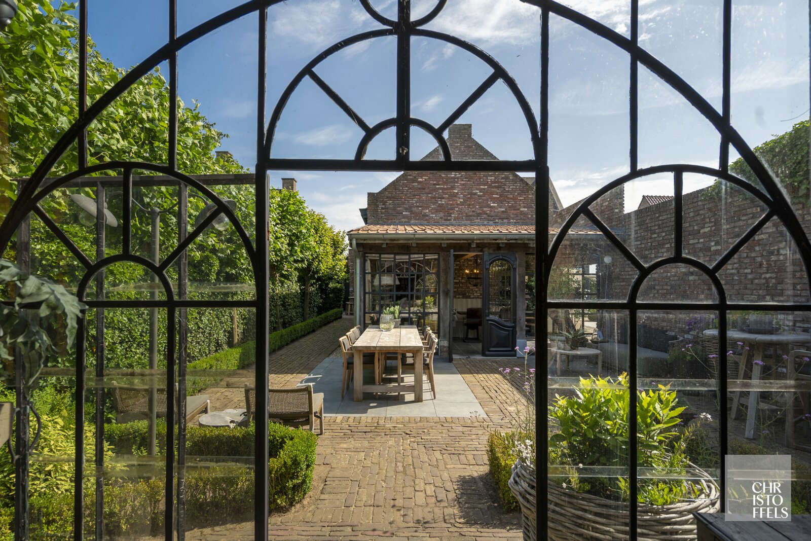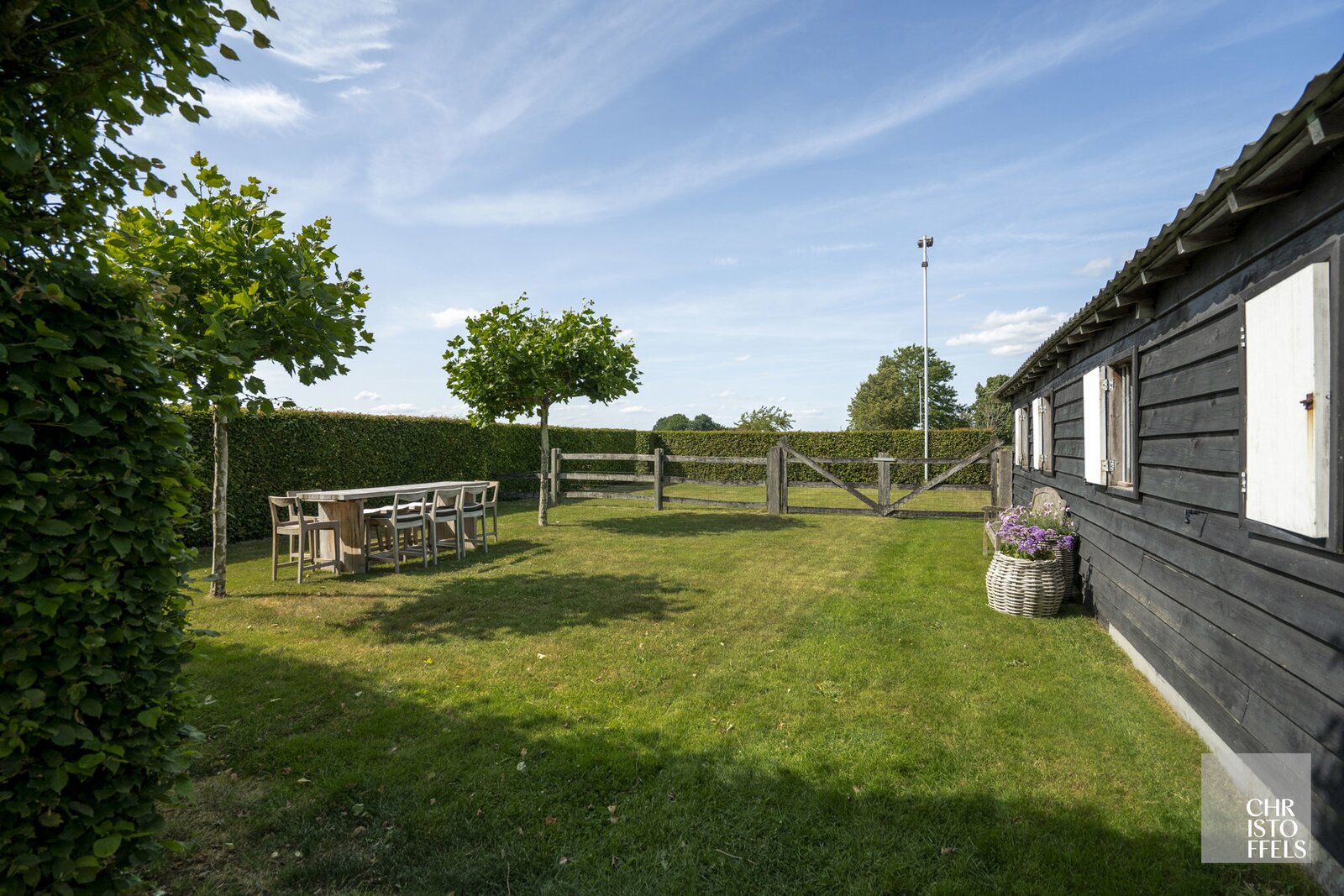 De aangelegde siertuin is volledig omheind en uitgerust met een automatische toegangspoort. Centraal in de tuin bevindt zich een ruim terras met buitenzwembad (5 × 10 m) en een vrijstaande serre. Aan de achterzijde sluiten weilanden aan, samen met een paardenpiste en een vrijstaand bijgebouw met paardenstallen.