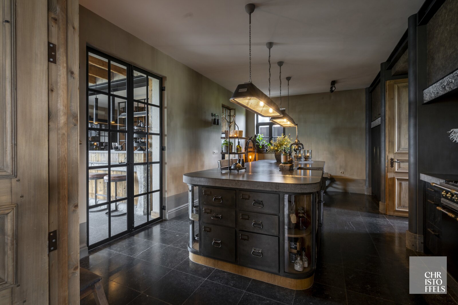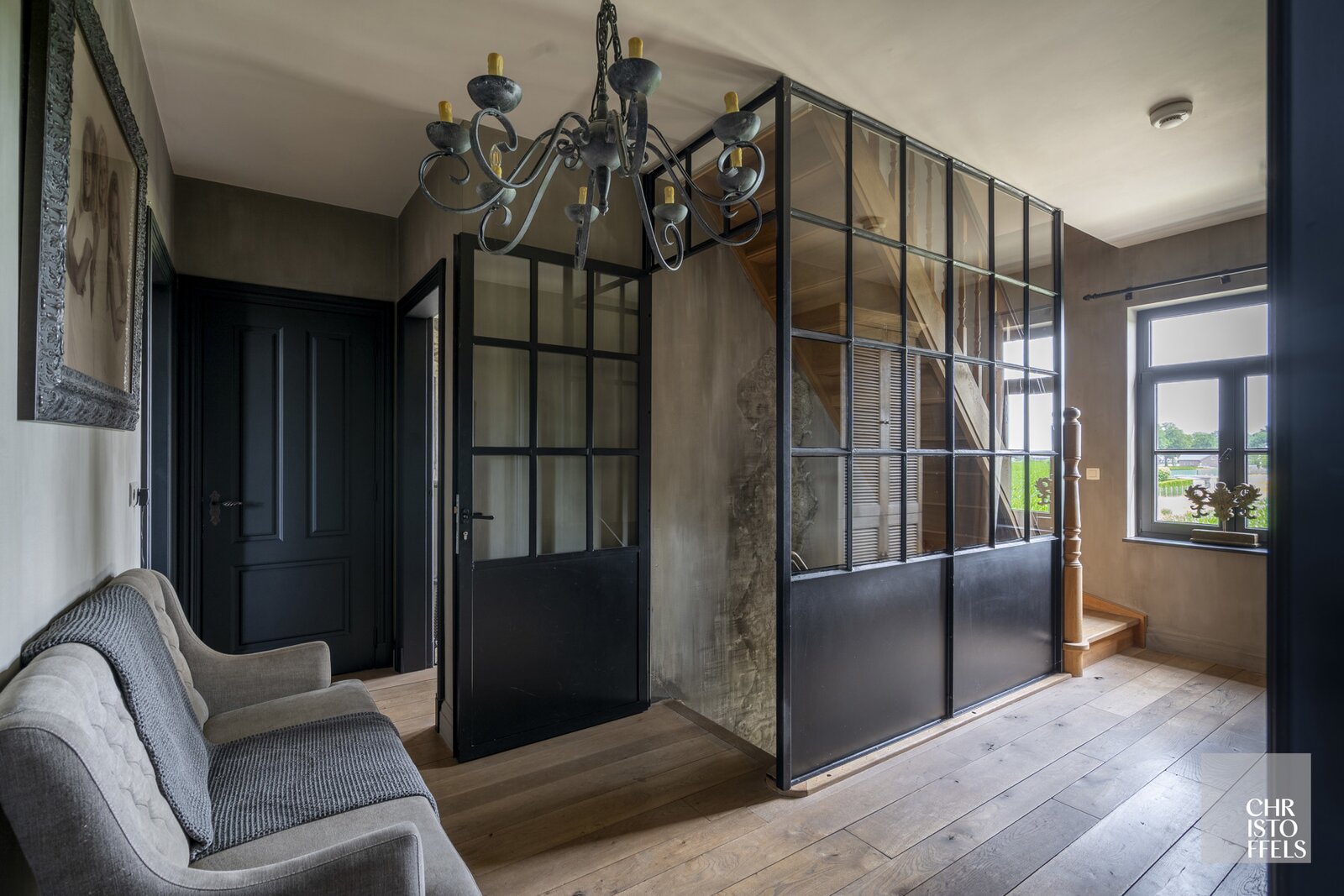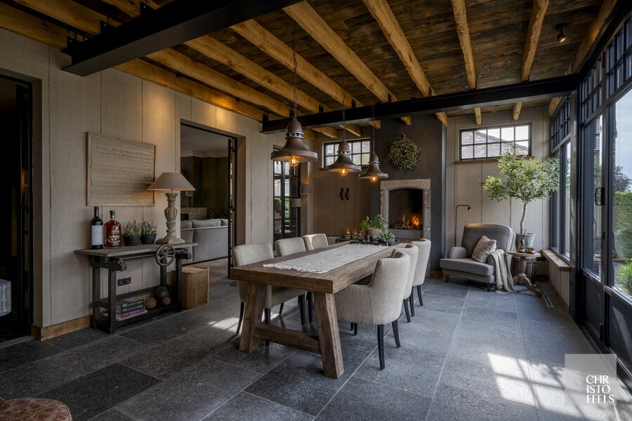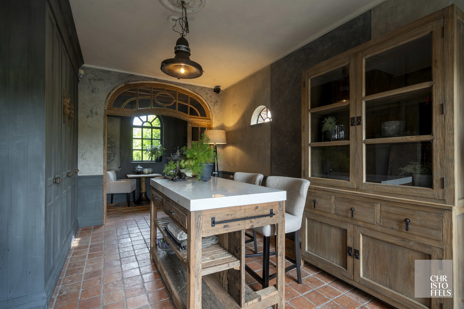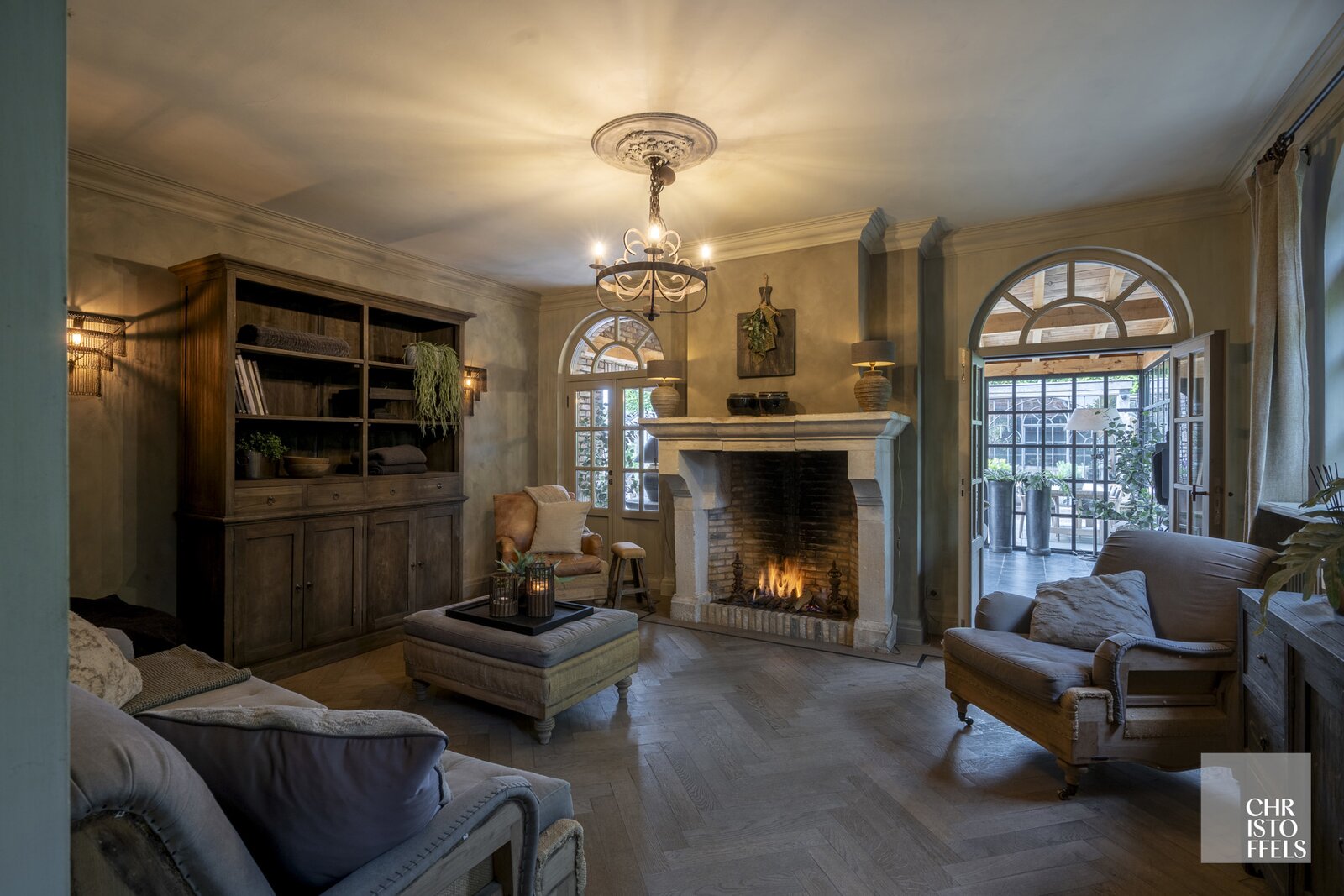 Op het gelijkvloers bevindt zich een ruime inkomhal met vestiaire en gastentoilet. Deze verleent enerzijds toegang tot een ruim bureel, anderzijds tot de riante leefruimte met gashaard. Aansluitend ligt de volledig uitgeruste keuken, die met de hand werd vervaardigd en als uniek maatwerk naadloos aansluit bij de stijl van de woning. Vanuit zowel de keuken als de leefruimte is de tuinkamer met bar toegankelijk, eveneens voorzien van een gezellige gashaard.