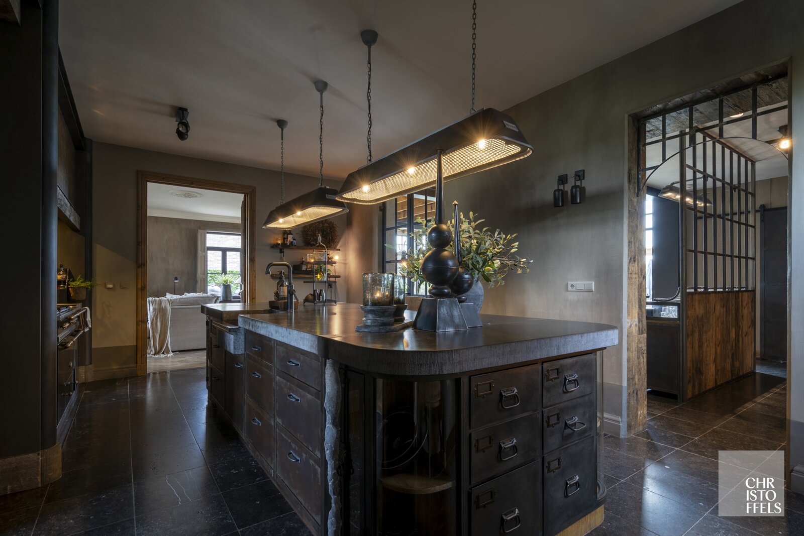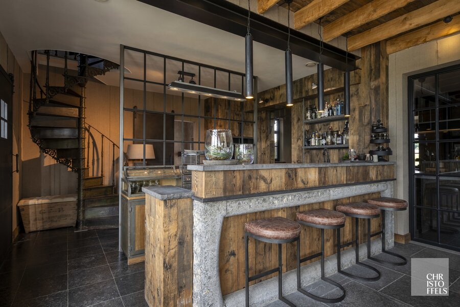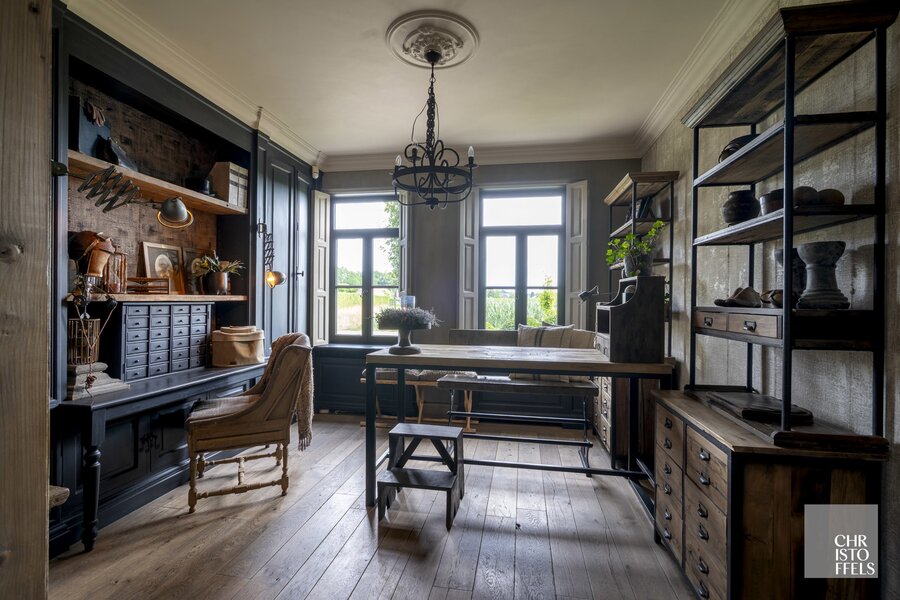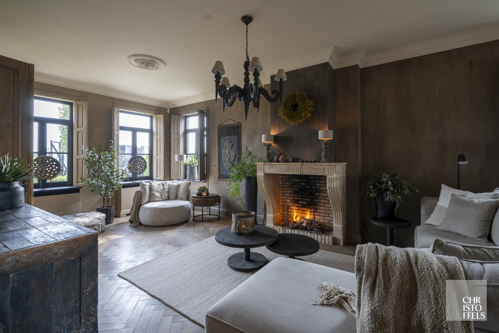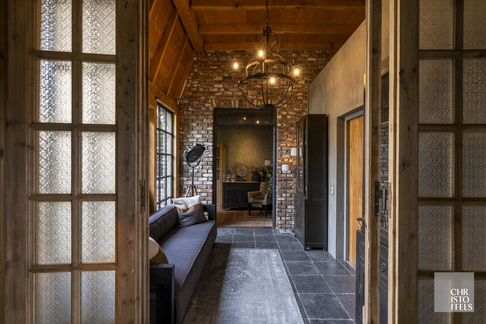 Op het gelijkvloers bevindt zich een ruime inkomhal met vestiaire en gastentoilet. Deze verleent enerzijds toegang tot een ruim bureel, anderzijds tot de riante leefruimte met gashaard. Aansluitend ligt de volledig uitgeruste keuken, die met de hand werd vervaardigd en als uniek maatwerk naadloos aansluit bij de stijl van de woning. Vanuit zowel de keuken als de leefruimte is de tuinkamer met bar toegankelijk, eveneens voorzien van een gezellige gashaard.