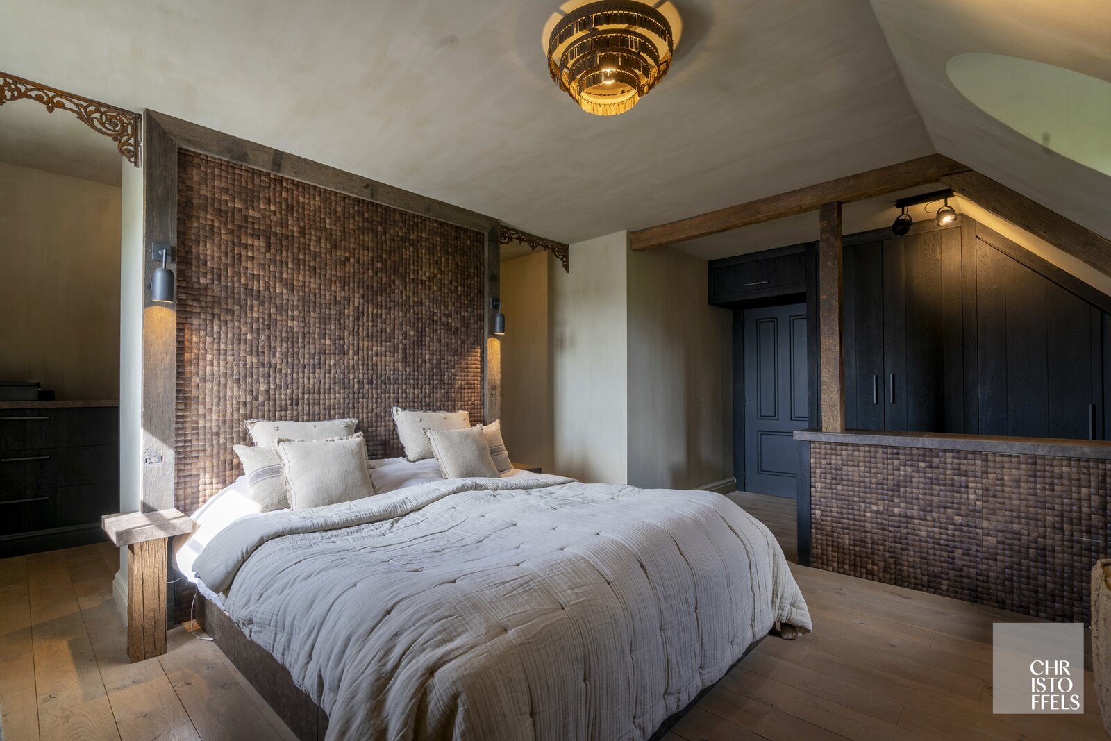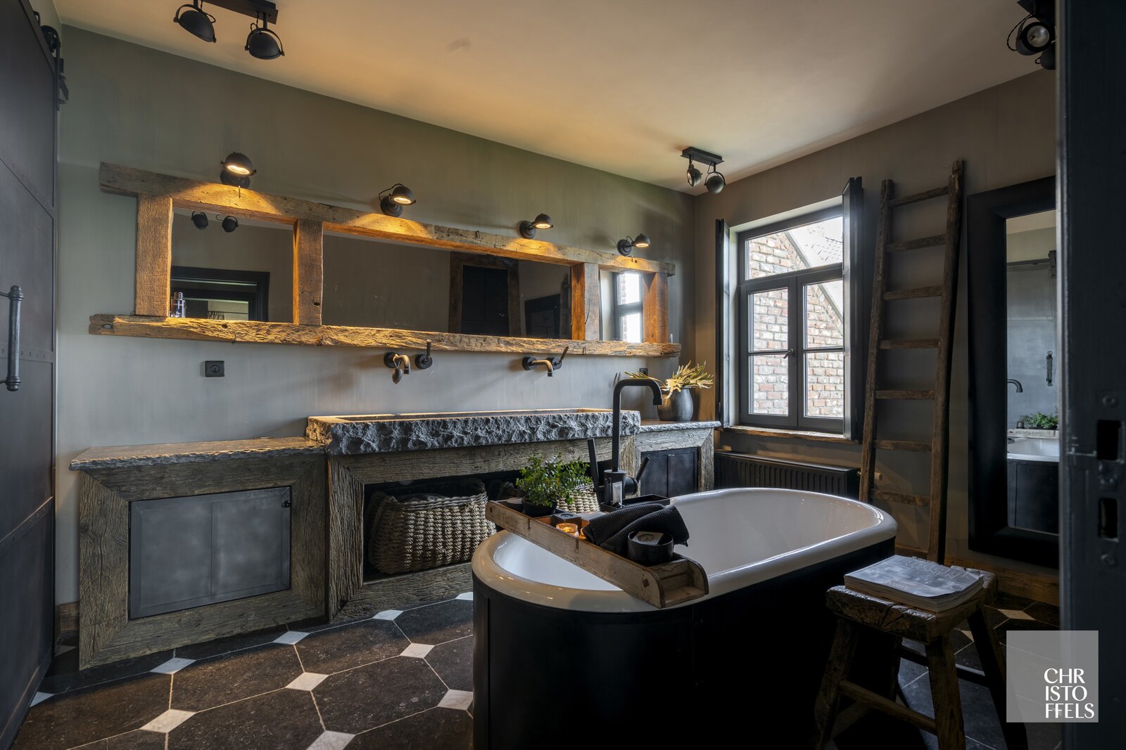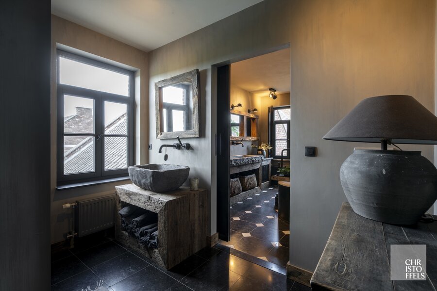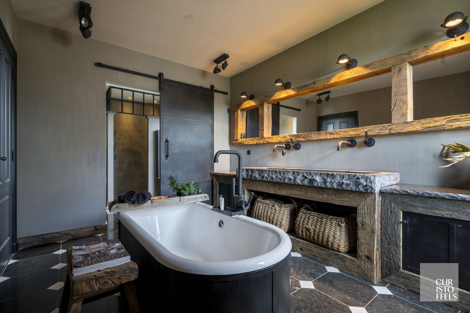 Op de eerste verdieping bevinden zich drie ruime slaapkamers, een apart toilet en twee onderling verbonden badkamers. De ene is uitgerust met een inloopdouche en dubbele wastafel, de andere met een vrijstaand ligbad en dubbele wastafel. Beide badkamers zijn afgewerkt in volledig maatwerk, met onder meer wastafels in blauwe steen en kraanwerk van Jee-O.
