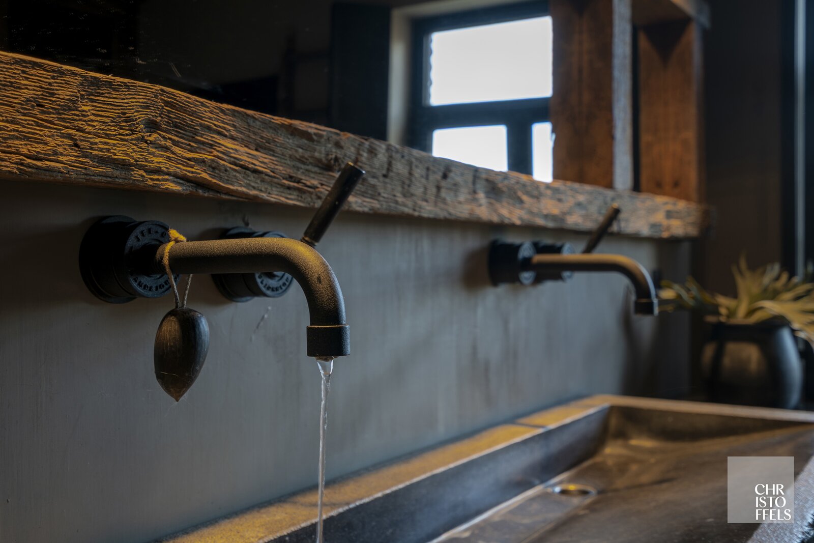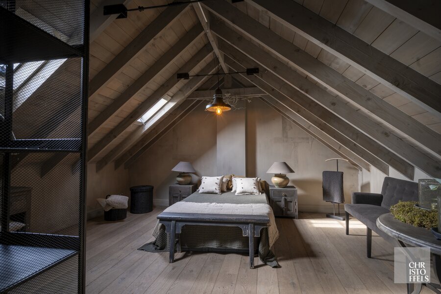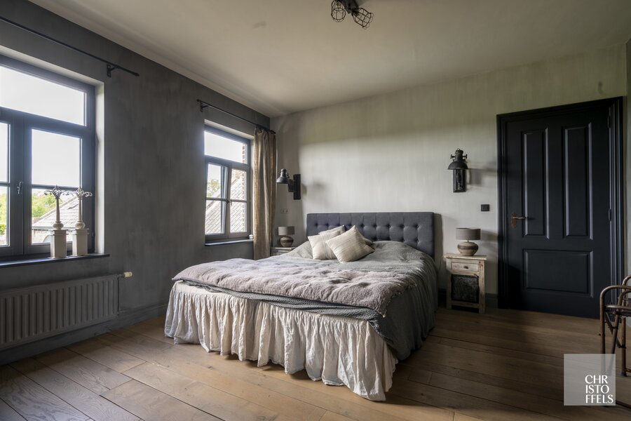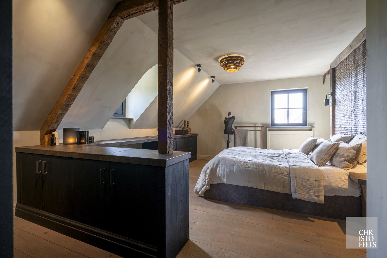 Op de eerste verdieping bevinden zich drie ruime slaapkamers, een apart toilet en twee onderling verbonden badkamers. De ene is uitgerust met een inloopdouche en dubbele wastafel, de andere met een vrijstaand ligbad en dubbele wastafel. Beide badkamers zijn afgewerkt in volledig maatwerk, met onder meer wastafels in blauwe steen en kraanwerk van Jee-O.