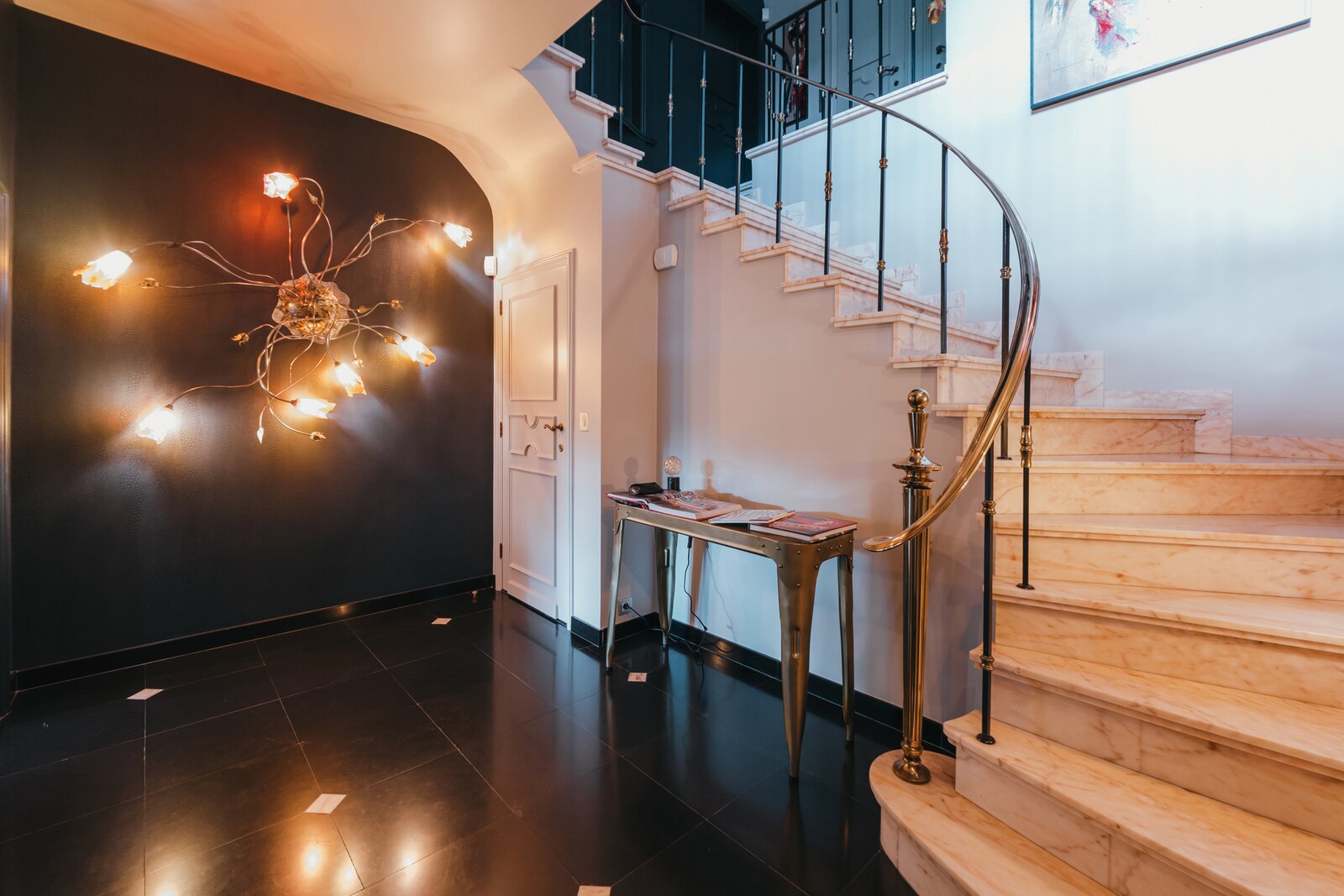 Hall d’entrée avec vestiaire et toilette : escalier en marbre de carrare