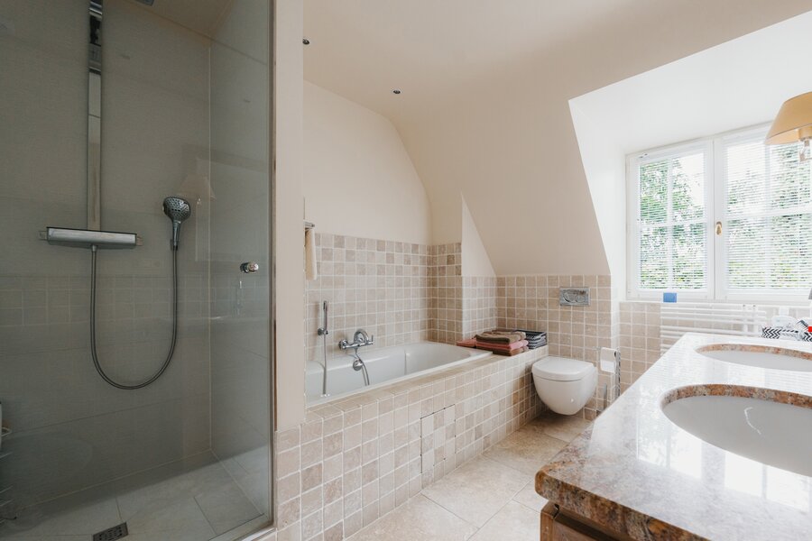 Salle de bain (baignoire, douche, 2x lavabo, toilette) marbre Botticino Anticato et Israeliana Grigio