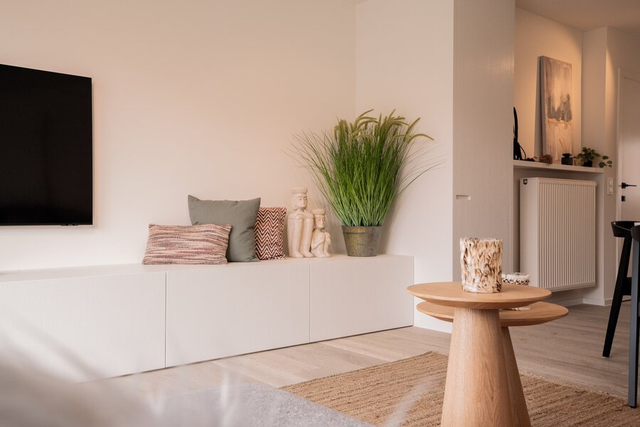 De lichtrijke leefruimte heeft toegang tot een tweede groot zuidgericht zonneterras. Ideaal om te genieten van de zon en frisse zeelucht.