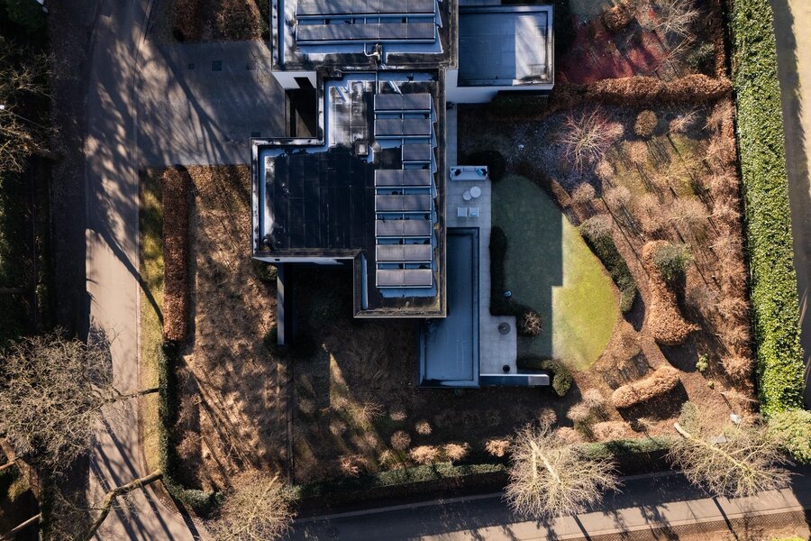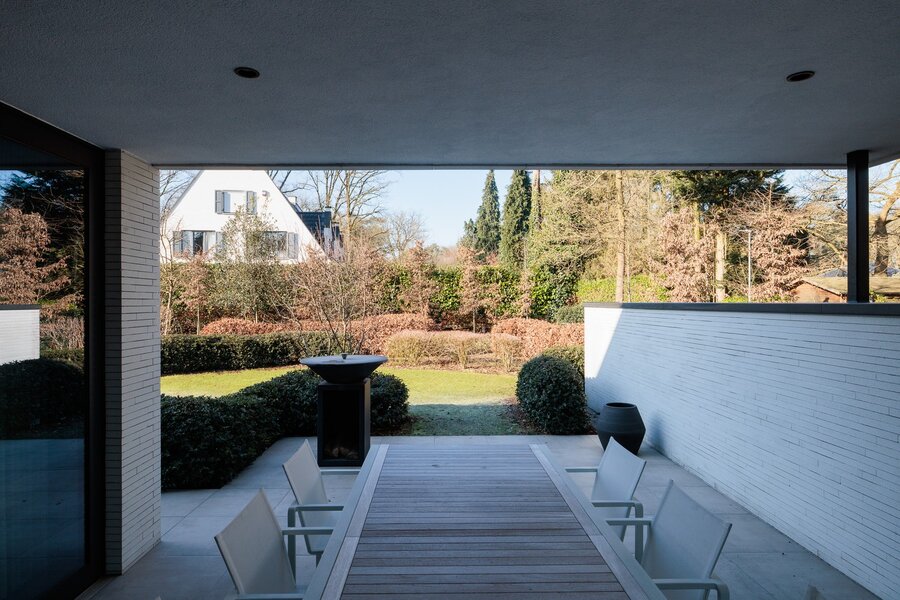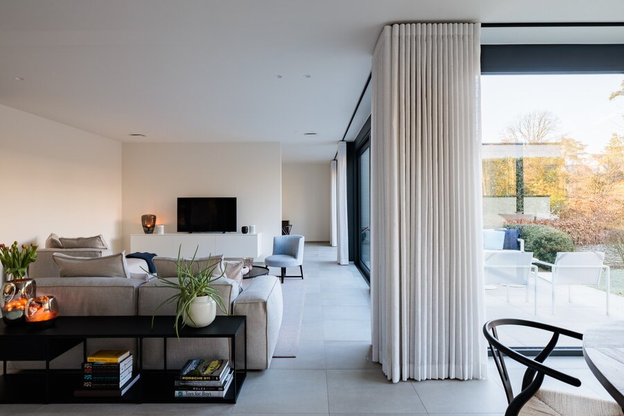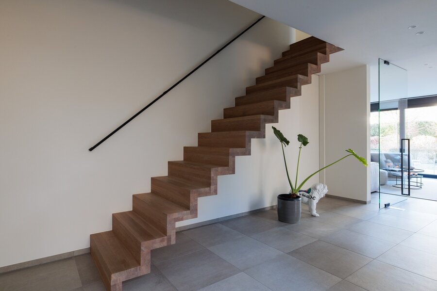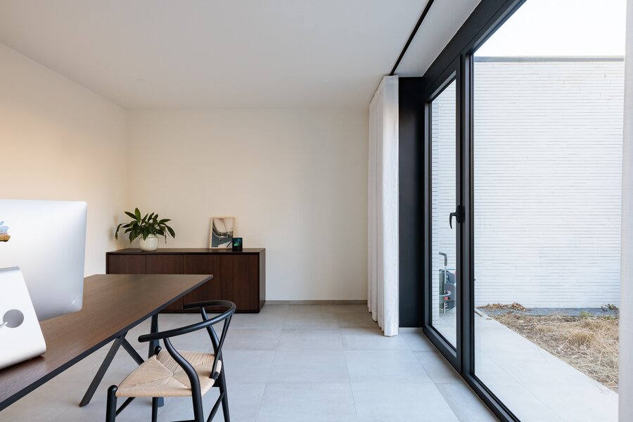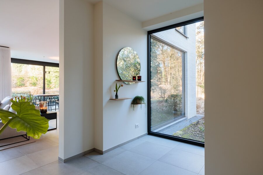 Bij binnenkomst ervaart u meteen het unieke karakter van de woning: een gesloten voorgevel biedt privacy, terwijl de inkomhal en het lichtrijke interieur een naadloze verbinding met de tuin en omgeving creëren. Grote raampartijen zorgen voor een panoramisch zicht op de tuin en laten het natuurlijke licht door de hele woning stromen.