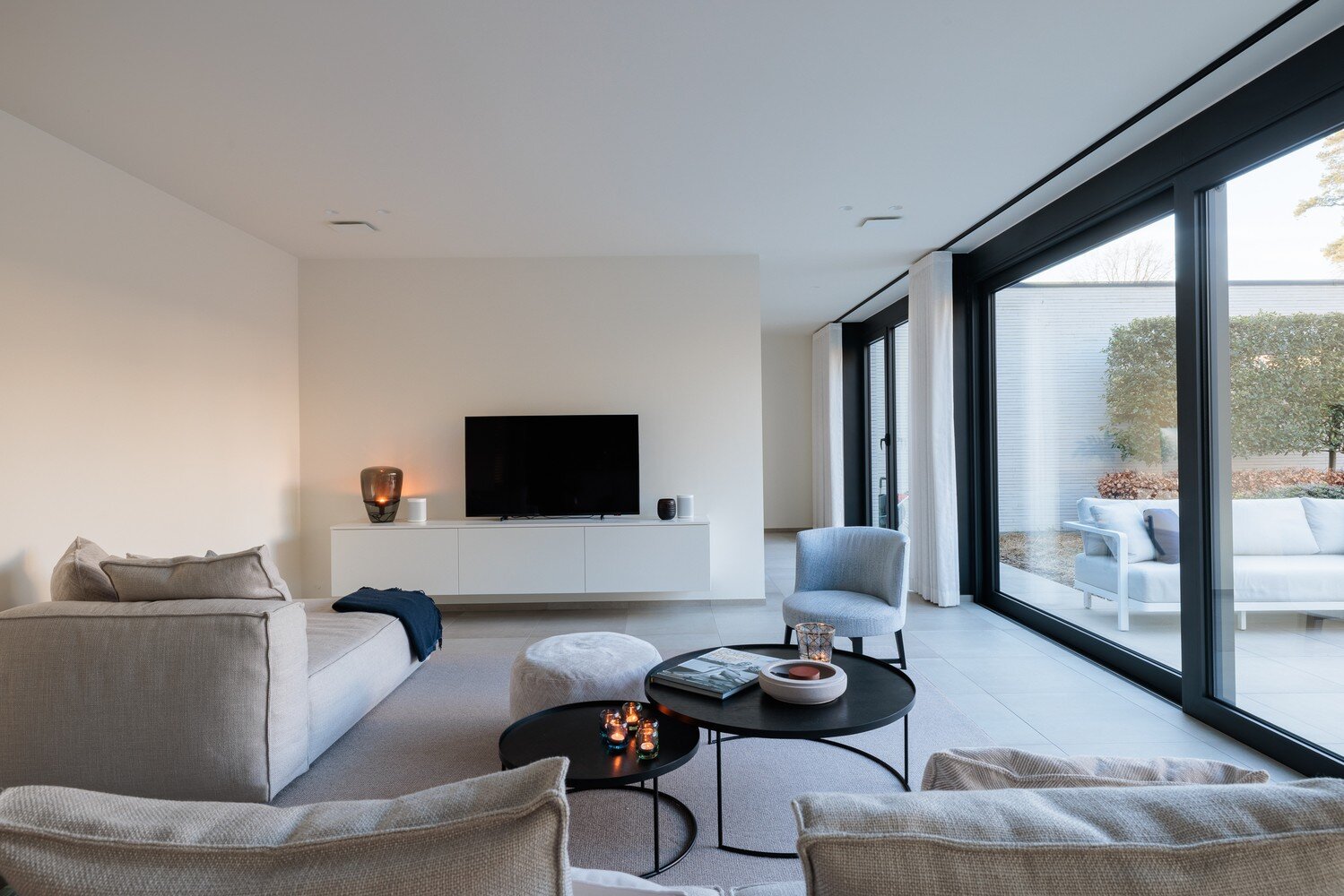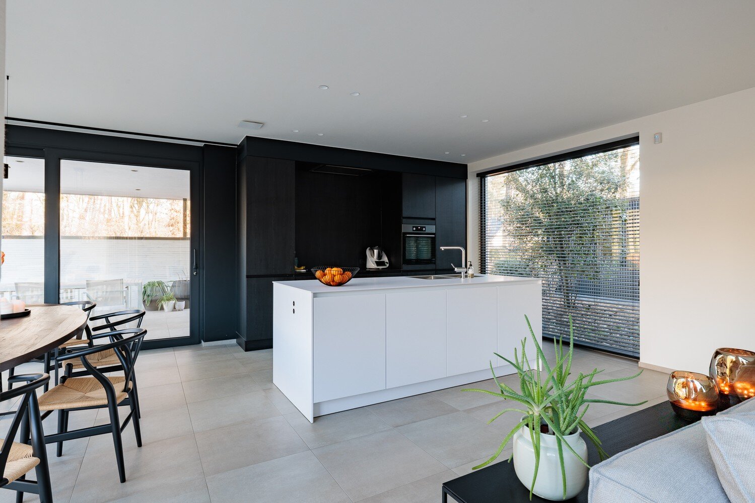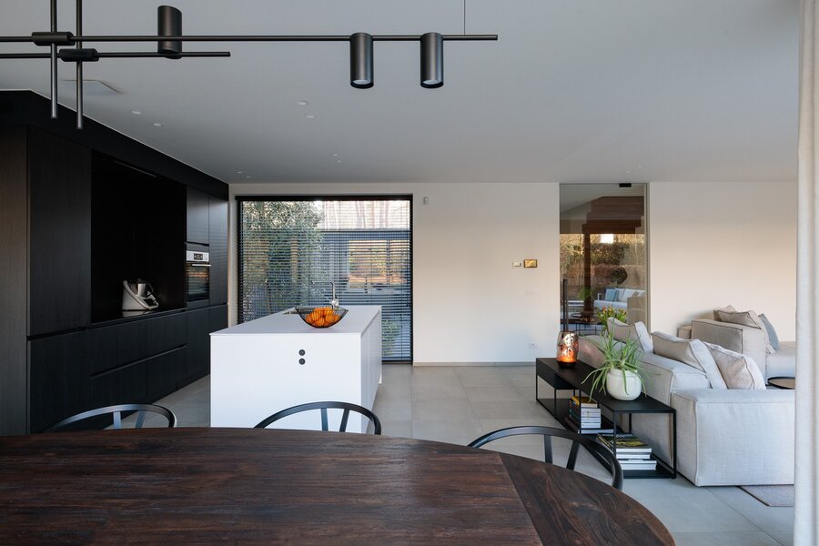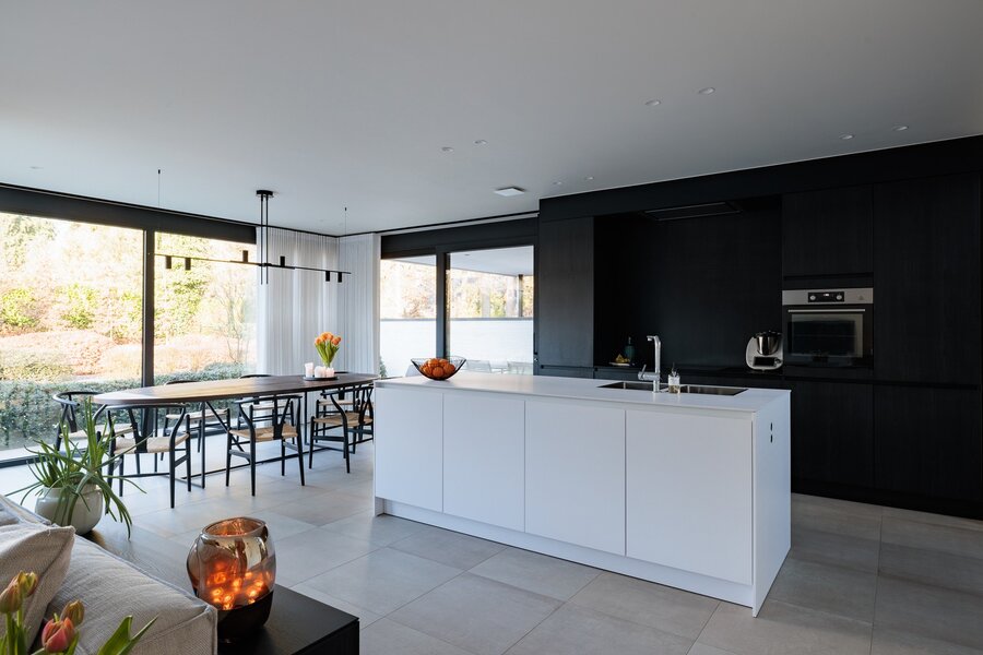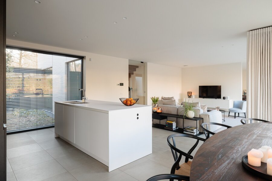 De open SieMatic-keuken sluit perfect aan op de eethoek en het zeer ruime, deels overdekte terras. Aan de andere zijde van de woonkamer vindt u een apart bureau of tv-hoek, ideaal voor werk of ontspanning. Op de benedenverdieping bevinden zich bovendien een ruime berging met praktische ingemaakte kasten en een riante garage, geschikt voor één wagen plus fietsen of tuingerief.