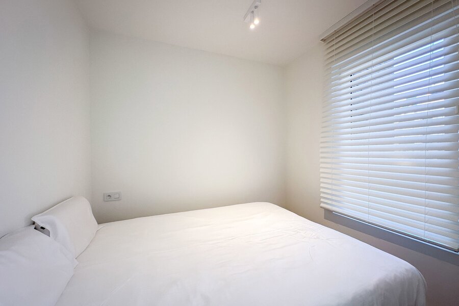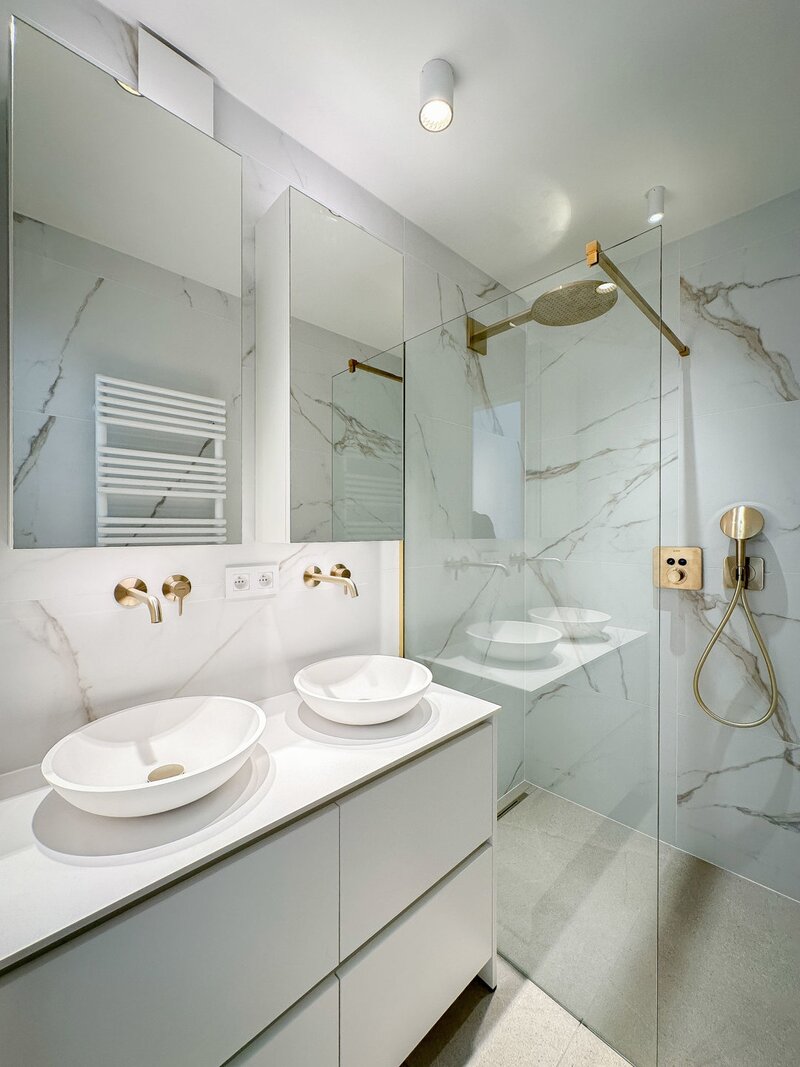À l'arrière, il y a 2 chambres paisibles, équipées de placards intégrés. Il y a 1 salle de douche séparée, luxueusement aménagée avec double lavabo et douche.