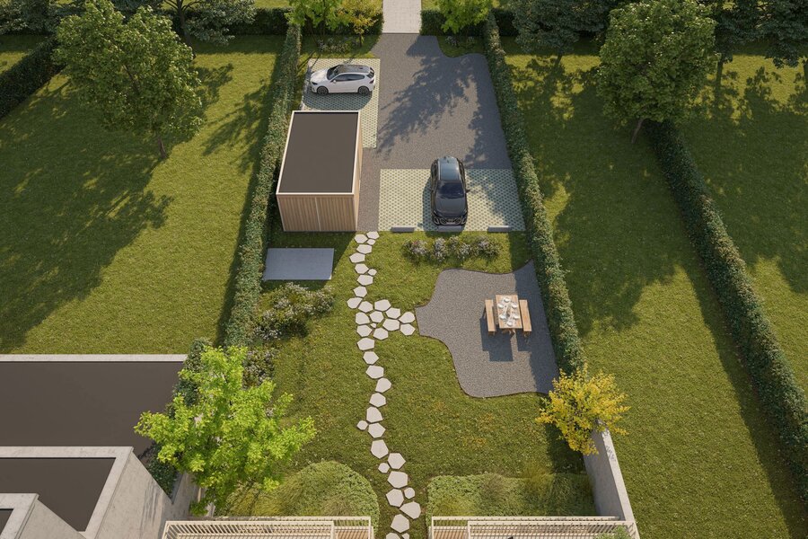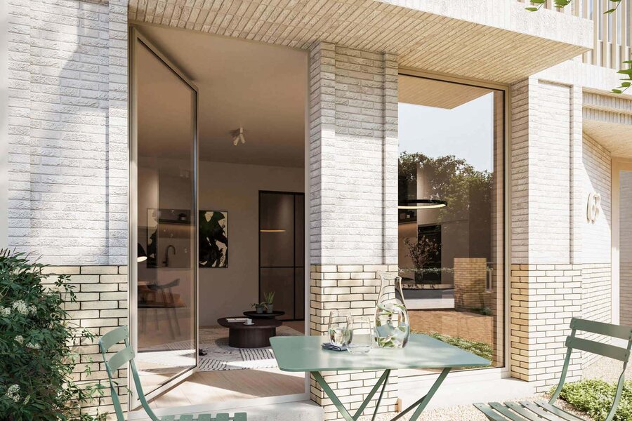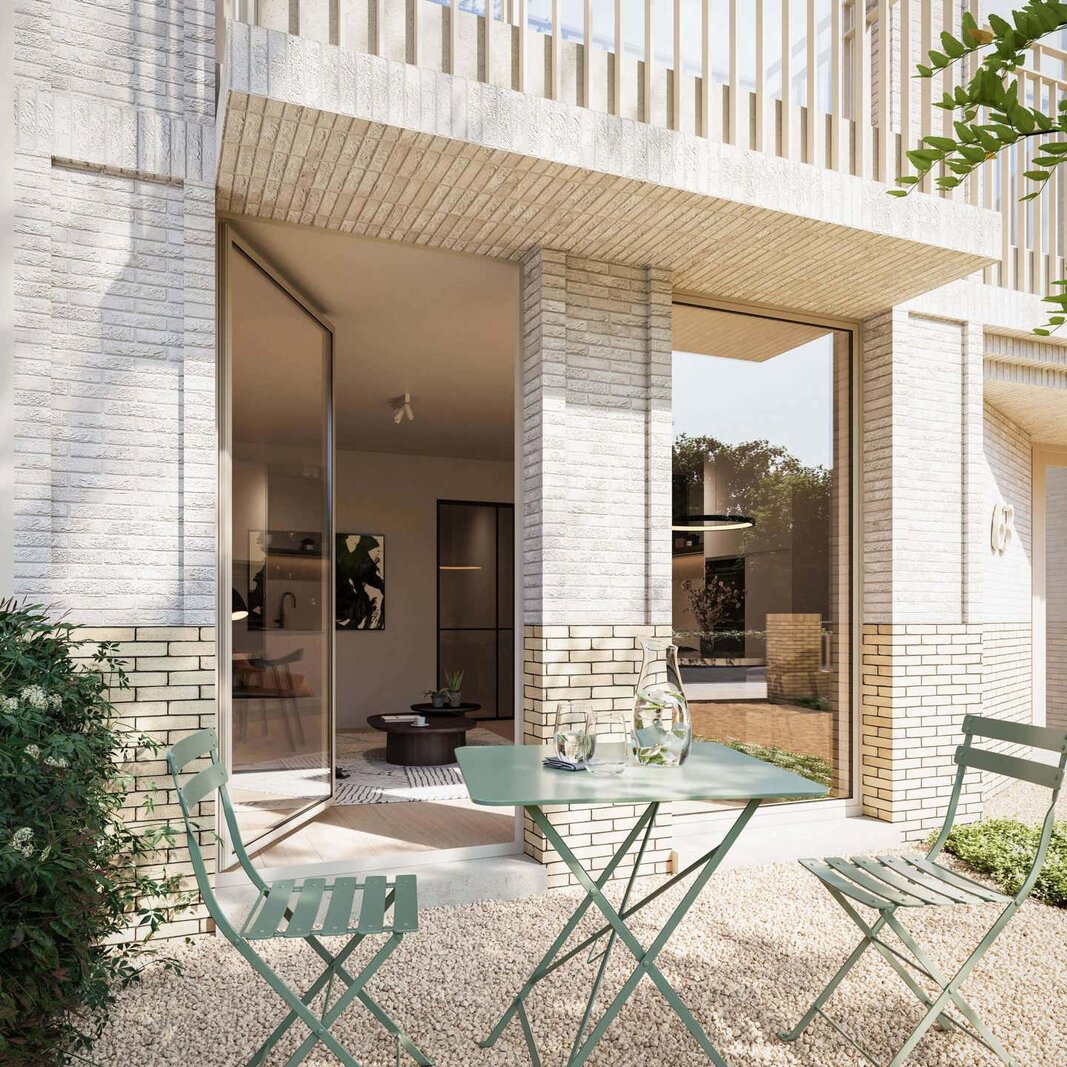 De residentie telt vijf exclusieve appartementen met bewoonbare oppervlaktes van 68m² tot 149m², telkens voorzien van royale terrassen. Op het gelijkvloers en de eerste verdieping bevinden zich twee appartementen met twee slaapkamers, terwijl de bovenste verdieping een unieke penthouse met drie slaapkamers biedt. Uitzonderlijke troef van dit project is de gemeenschappelijke tuin achter het gebouw waar zich tevens de autostaanplaatsen bevinden.