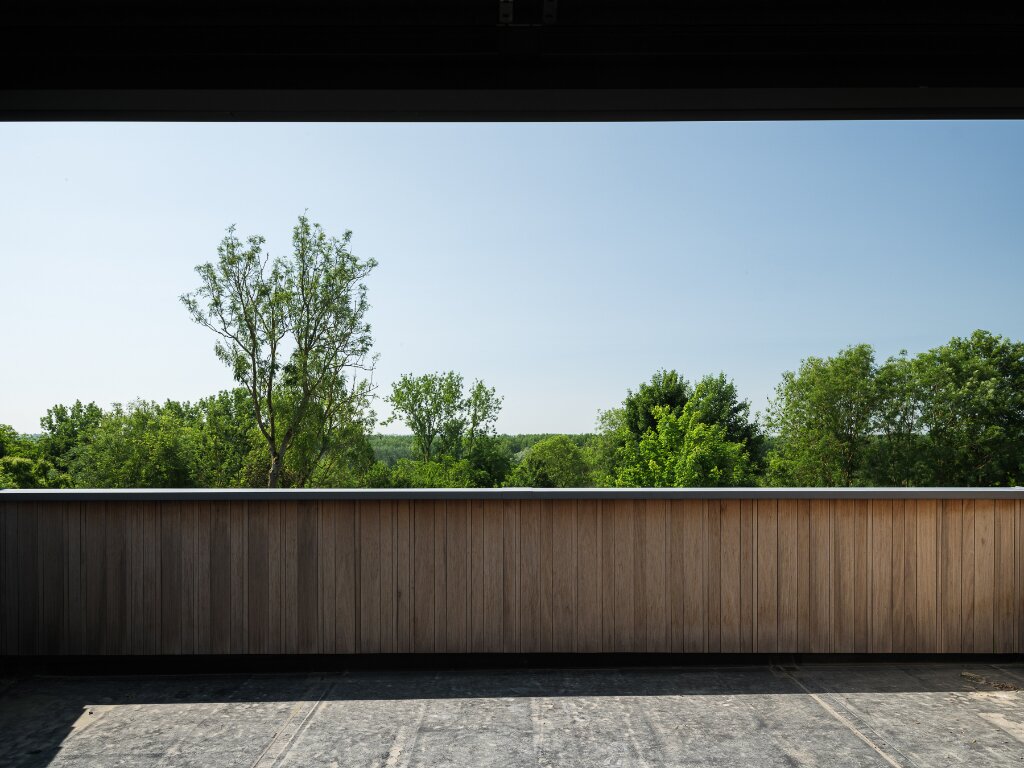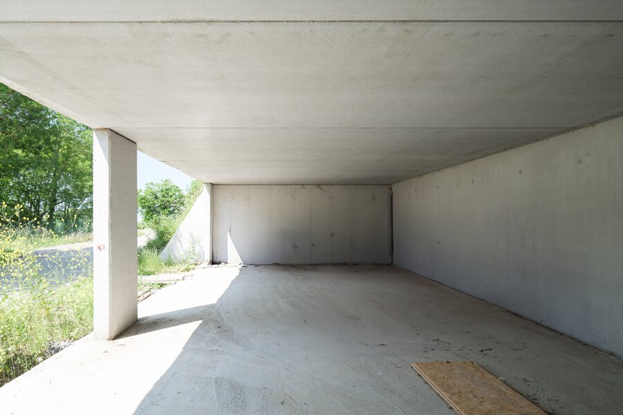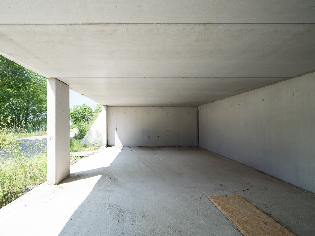 Aan de achterzijde van het perceel, langs de lagergelegen straatzijde, bevindt zich een multifunctionele garage met plaats voor vier wagens — discreet ingebed in het landschap en toegankelijk zonder afbreuk te doen aan de privacy of esthetiek van de hoofdvolumes.