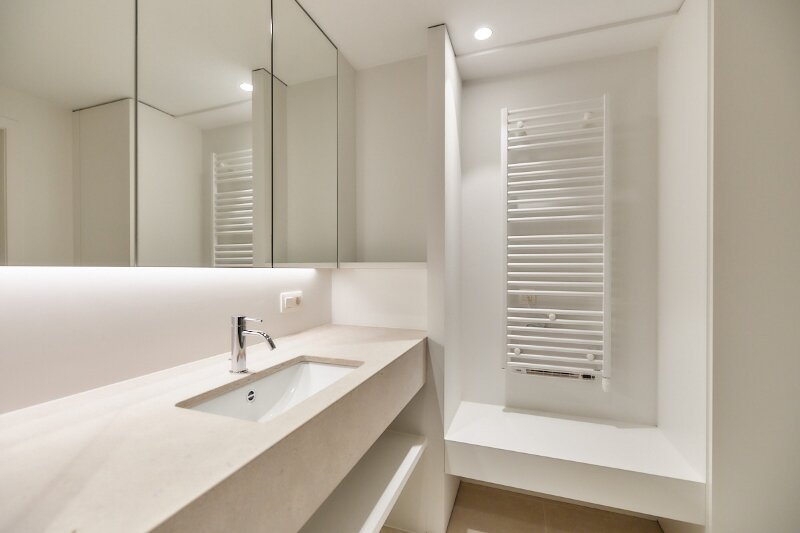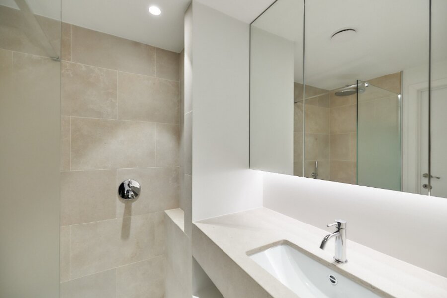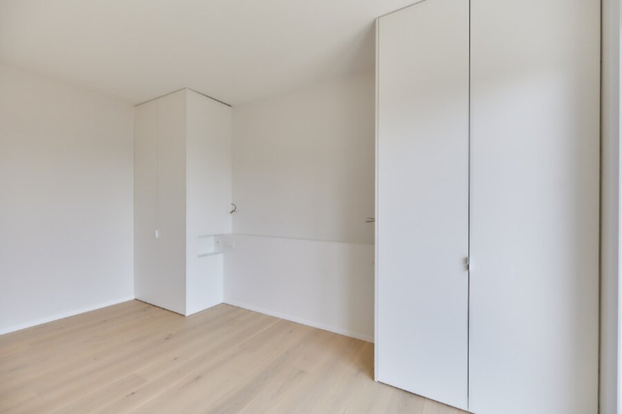 Trois chambres à coucher à l'arrière avec armoires encastrées, dont deux donnent accès à un balcon ensoleillé. L'une des chambres possède son propre lavabo intégré.