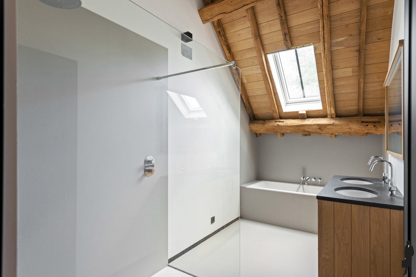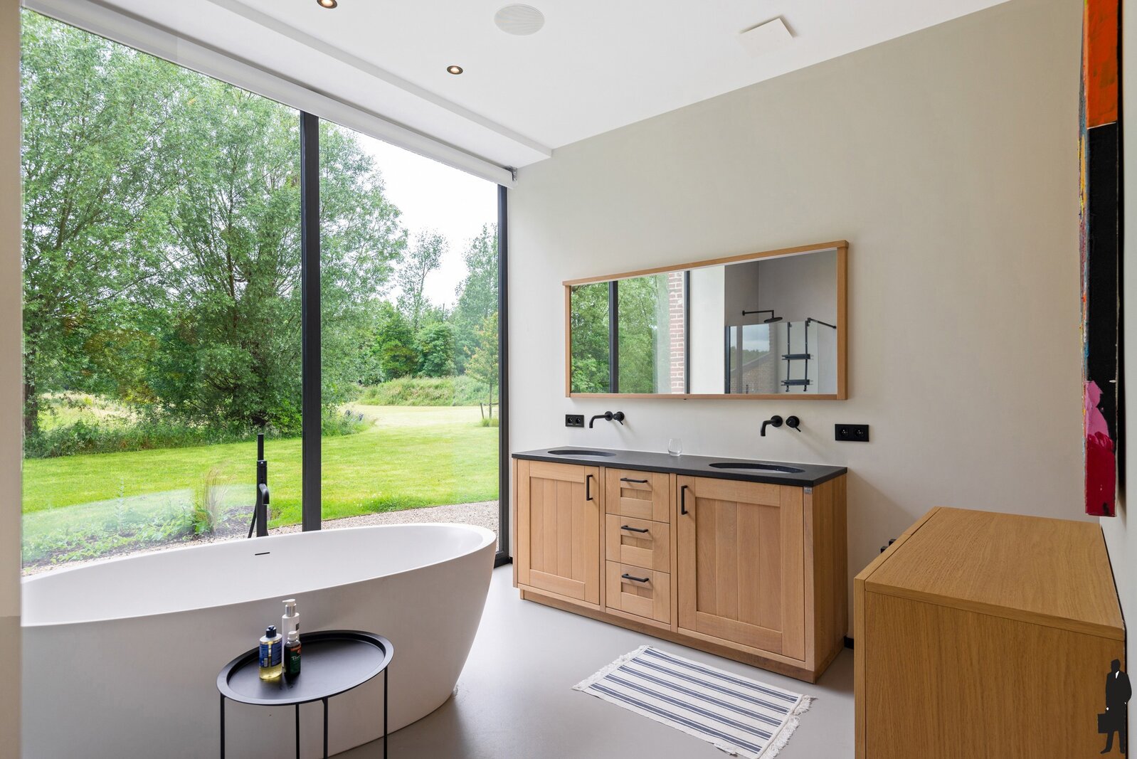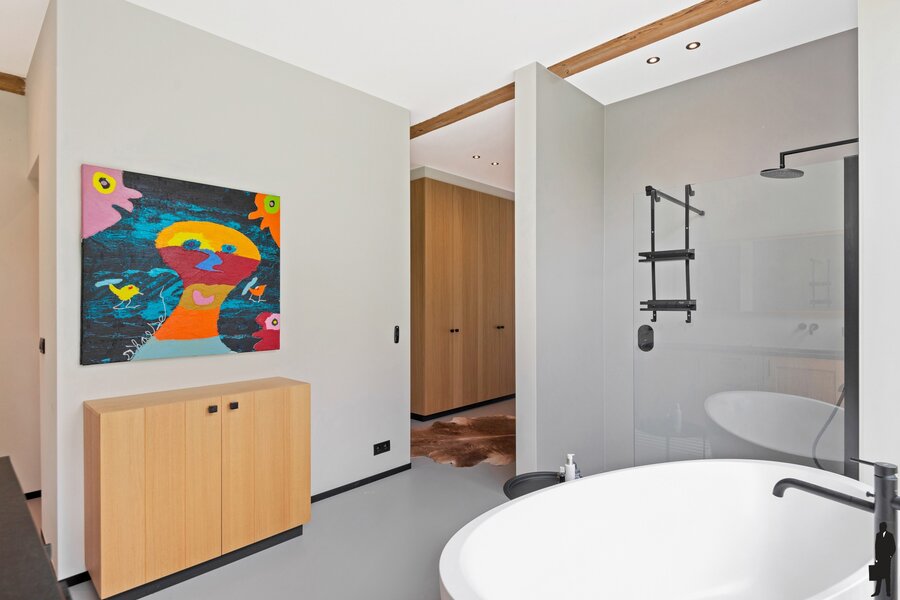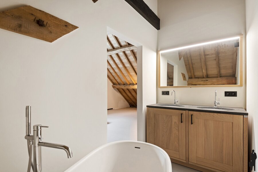 - Badkamer met grote inloopdouche, ligbad en 2 wastafels (ca. 13m²)