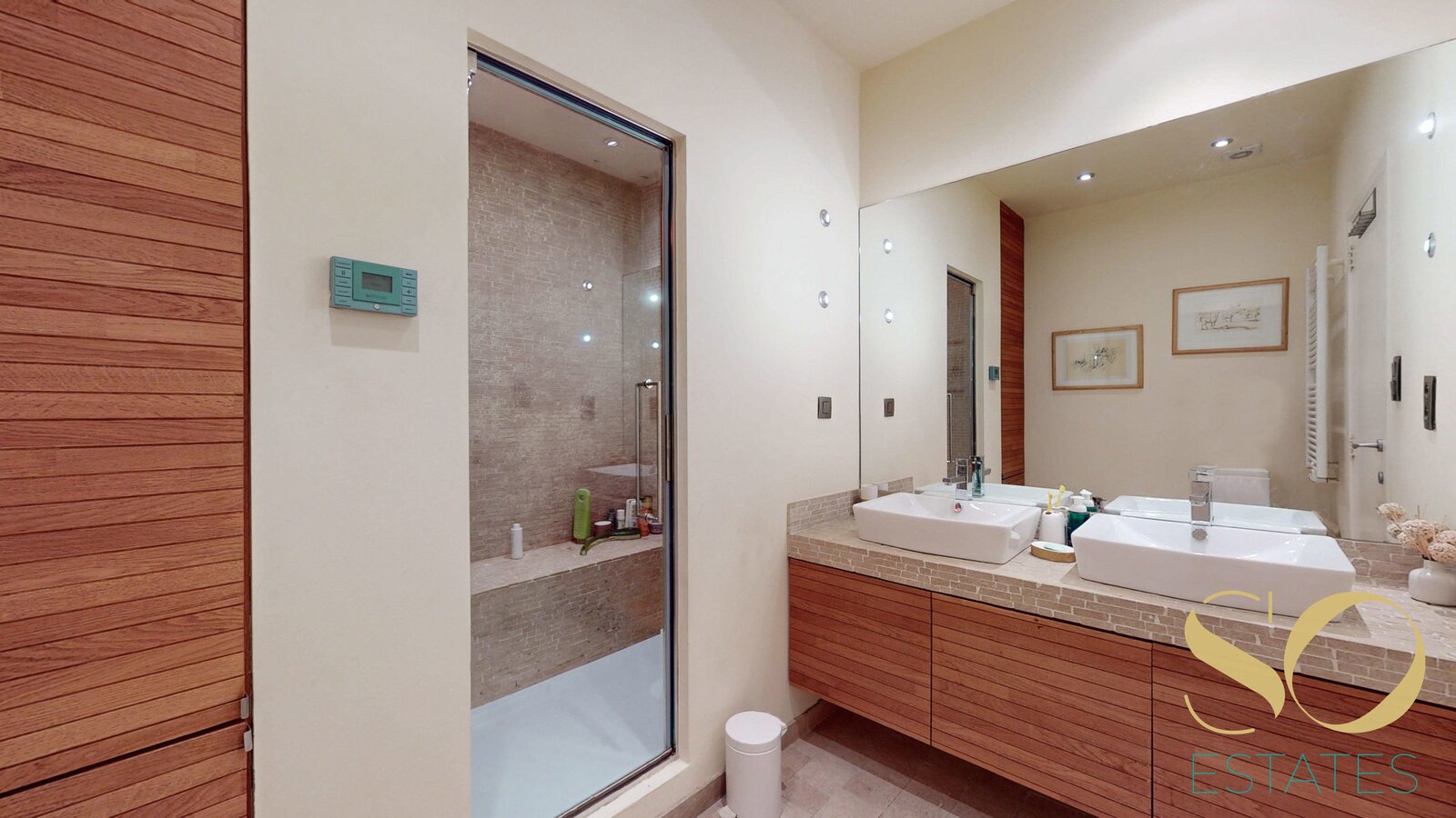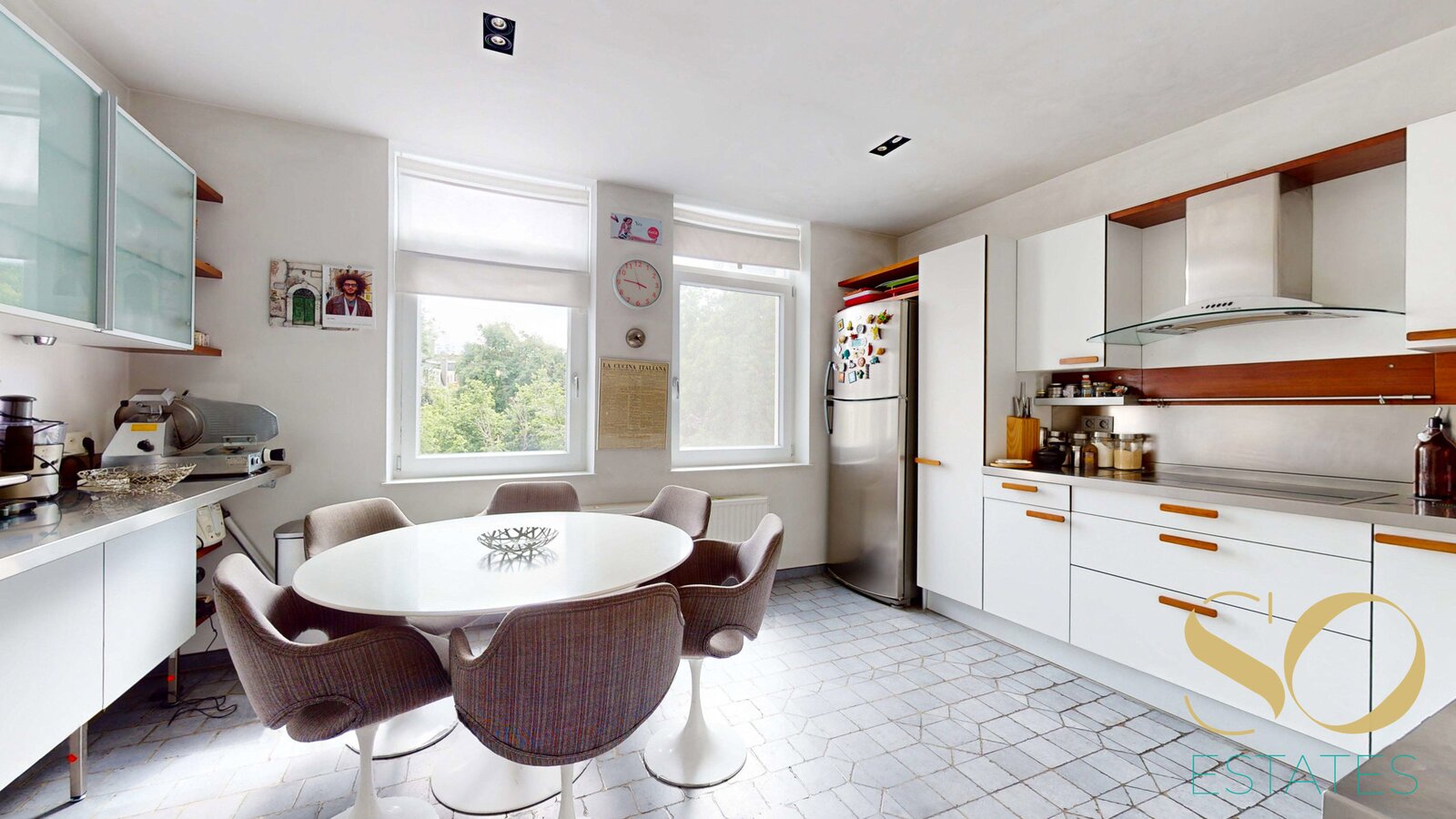 Ce bien se compose d'un hall d'entrée avec WC invité, d'une cuisine super équipée, d'une chambre d'invité avec dressing menant à une salle de bains avec hammam/sauna, de trois superbes pièces en enfilade très lumineuses pour le salon et la salle à manger, et d'un bureau pouvant servir de chambre. Le tout avec des hauteurs sous plafond impressionnantes et des puits de lumière.
