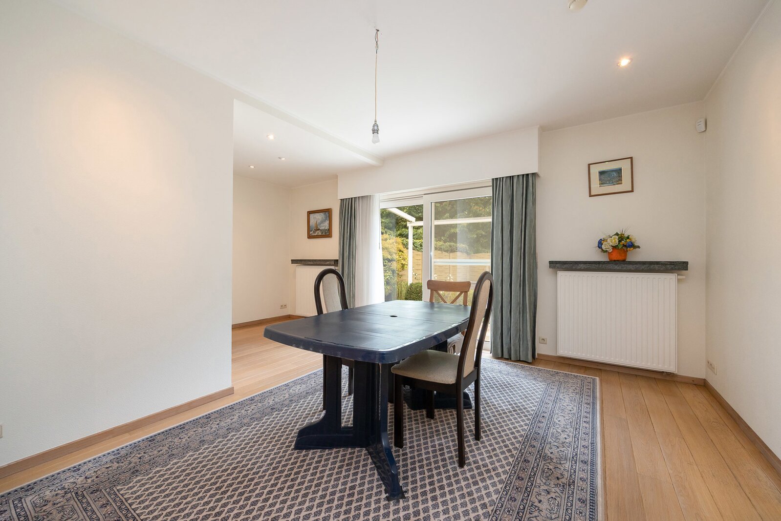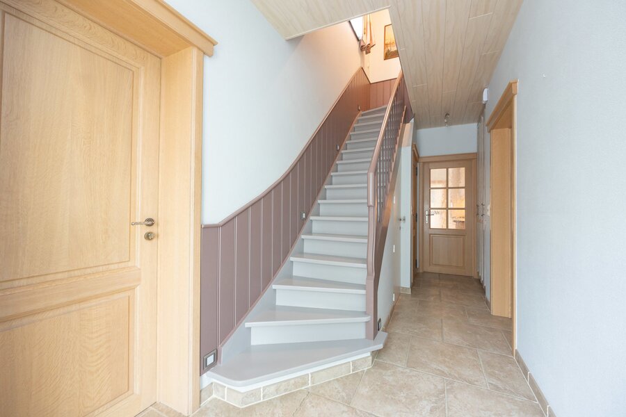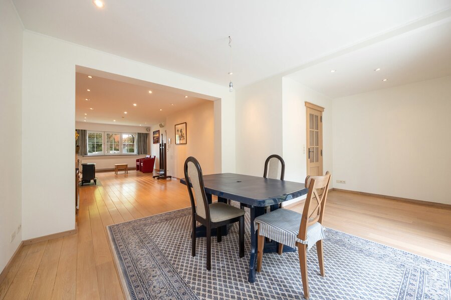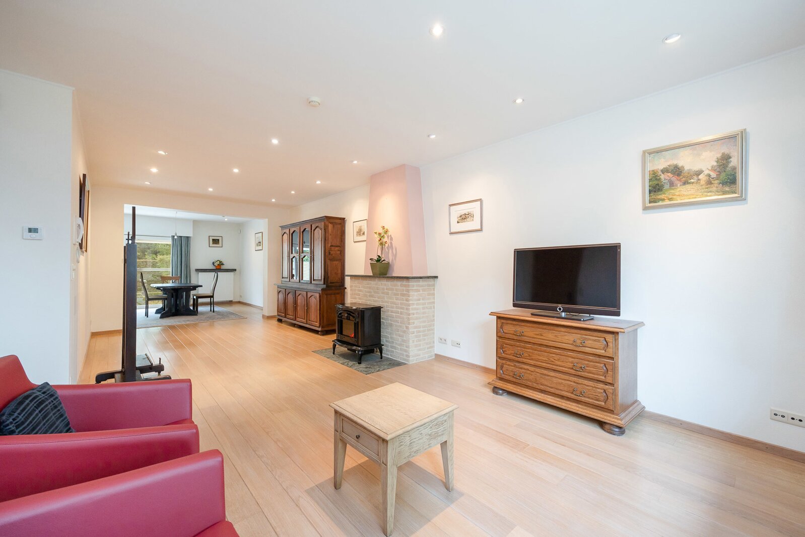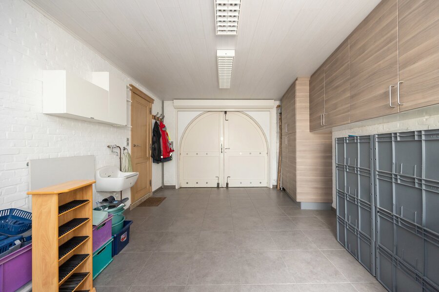 - Gelijkvloers: inkomhal, gezellige leefruimte op parket, aangrenzende keuken, grote garage/wasplaats, gastentoilet, overdekte koer, patio met uitschuifbare luifel