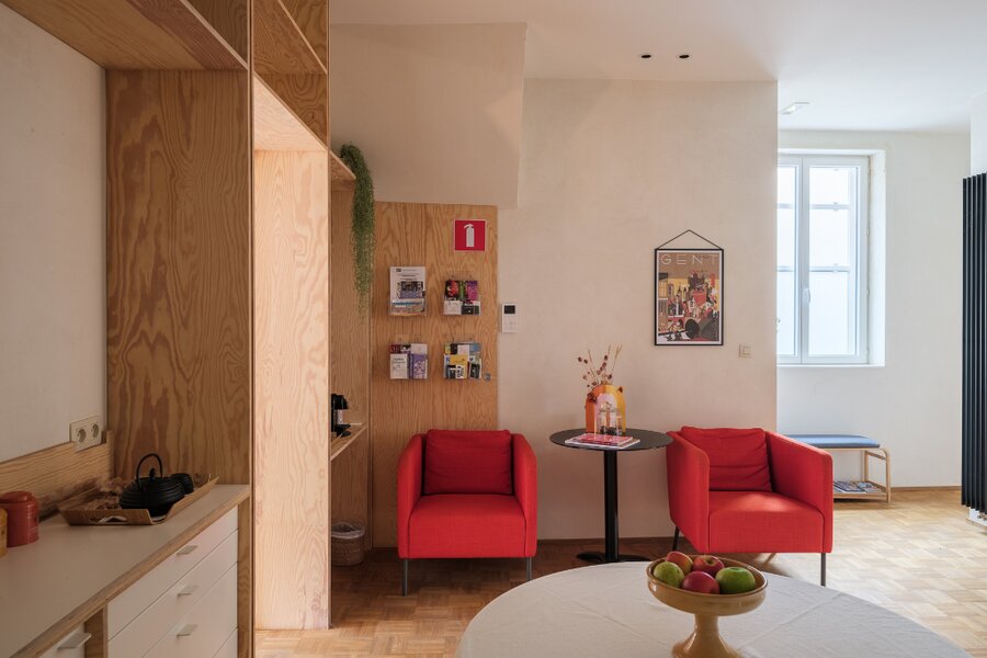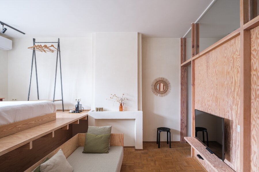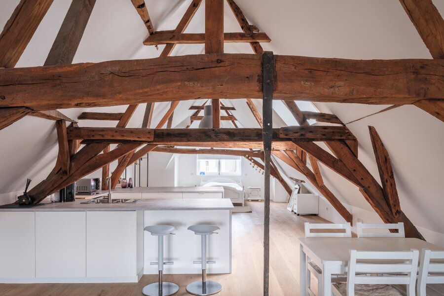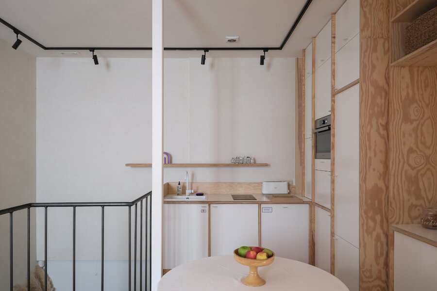 Het tweede verdiep beschikt over een tweede keuken en leefruimte, evenals een open slaapkamer met ensuite badkamer. Hierdoor kan dit niveau volledig autonoom functioneren, wat de opdeling in meerdere wooneenheden of een gemengde woon- en verhuurformule bijzonder aantrekkelijk maakt.