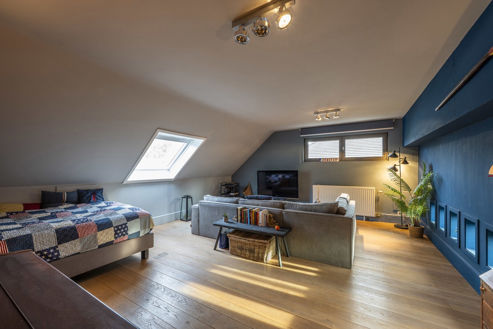 Zesde slaapkamer of hobbyruimte/aparte studio, … met toegang tot een heerlijk groot dakterras achteraan en een gezellig ingesloten terras vooraan.