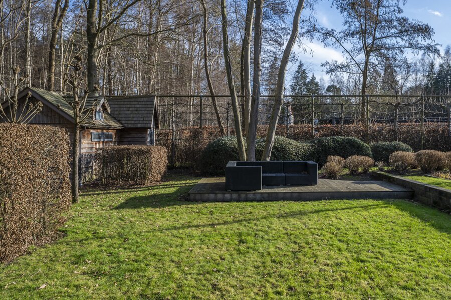 Verzorgde tuin met verschillende terrassen en origineel, knap tuinhuis gebouwd rond een prachtige boom.