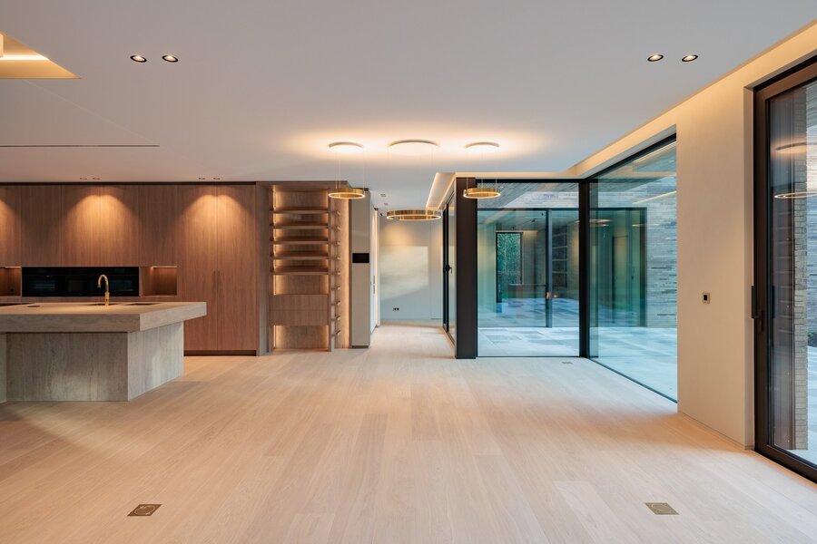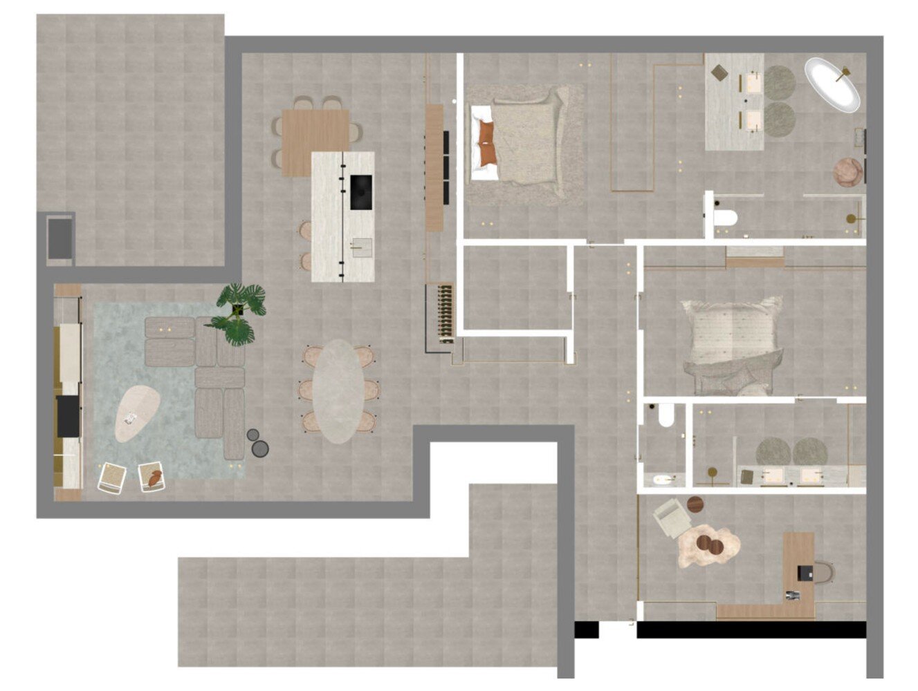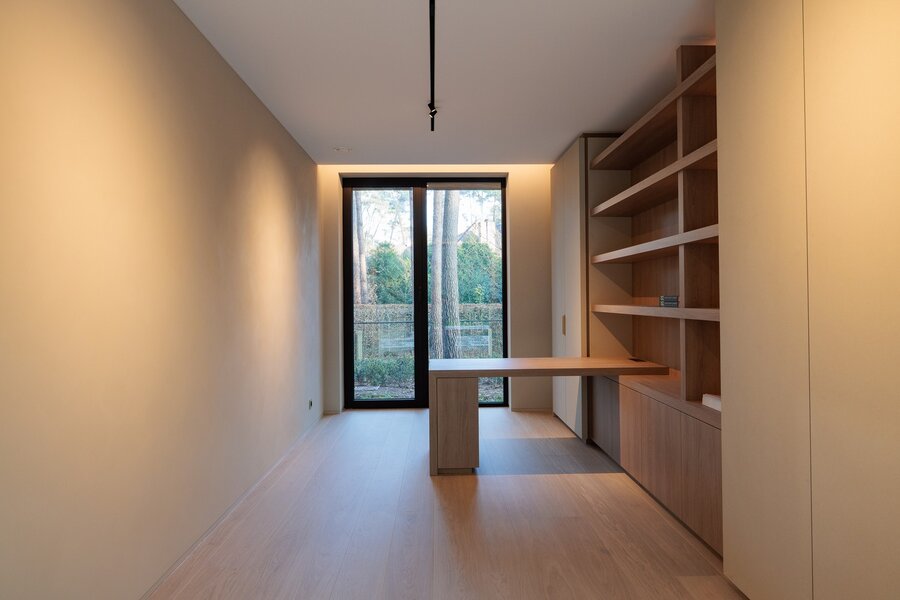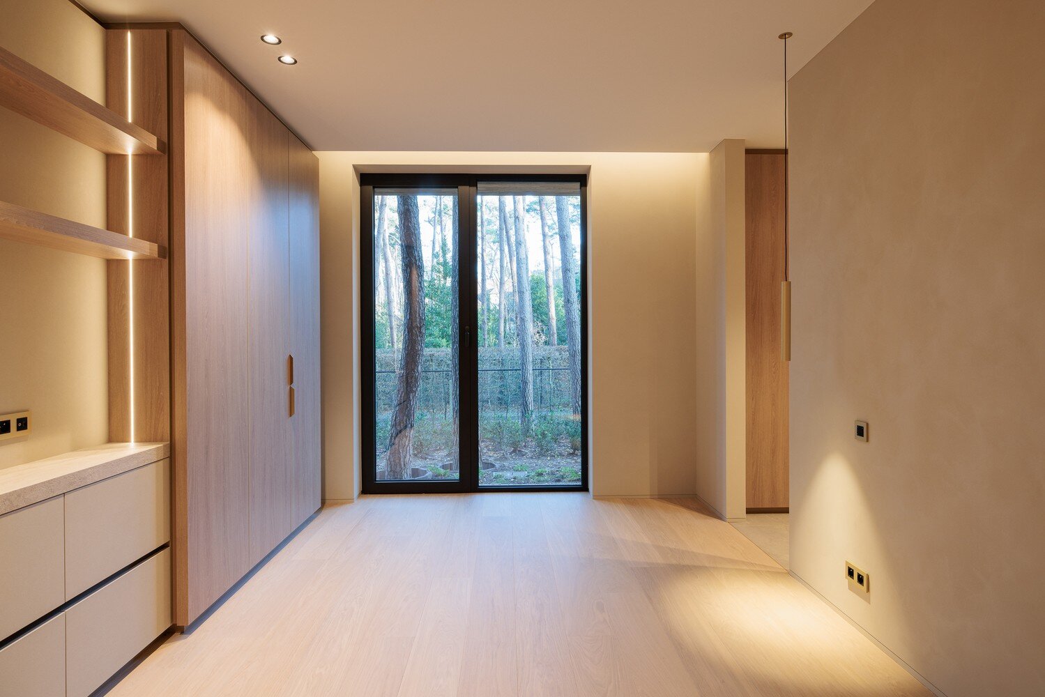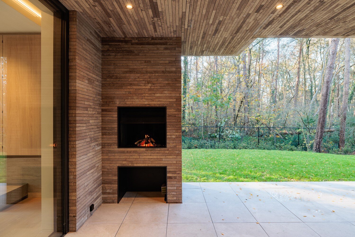 De royale leefruimte met elegante haardwand sluit naadloos aan op de luxueuze open keuken, volledig uitgerust met Miele-toestellen, een Bora-kookplaat en een Quooker-kraan. Deze leefzones vloeien over in twee deels overdekte terrassen van samen 41 m², met prachtig uitzicht op de riante gemeenschappelijke tuin en de groene omgeving. Eén van de terrassen beschikt bovendien over een gezellige ingebouwde buitenhaard – ideaal voor sfeervolle avonden in elk seizoen.