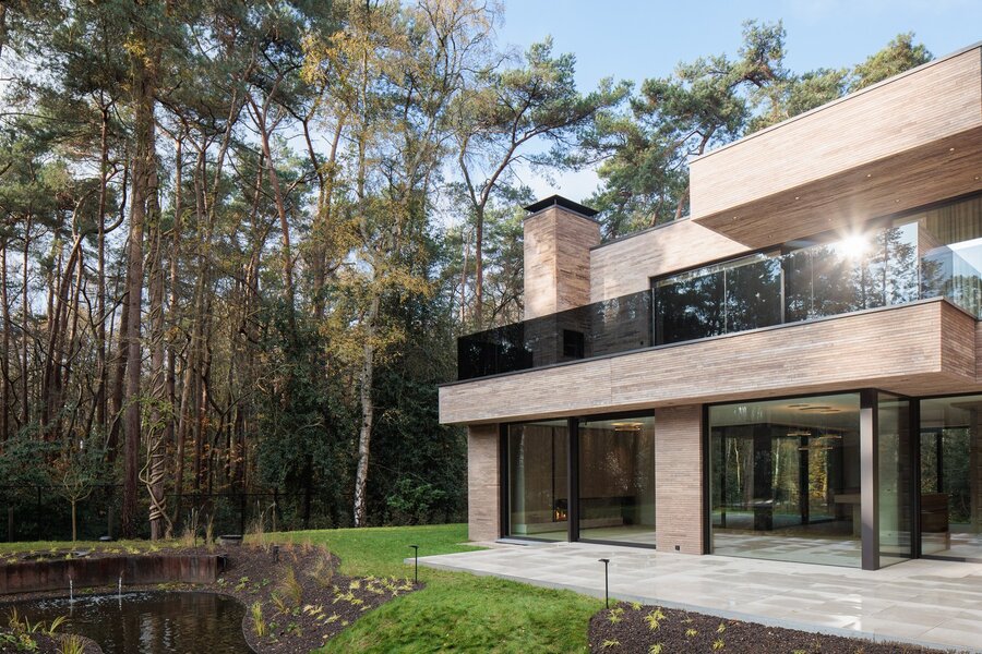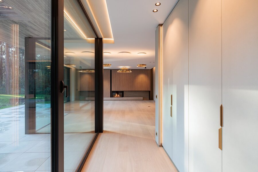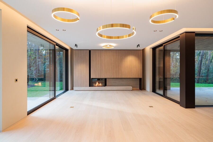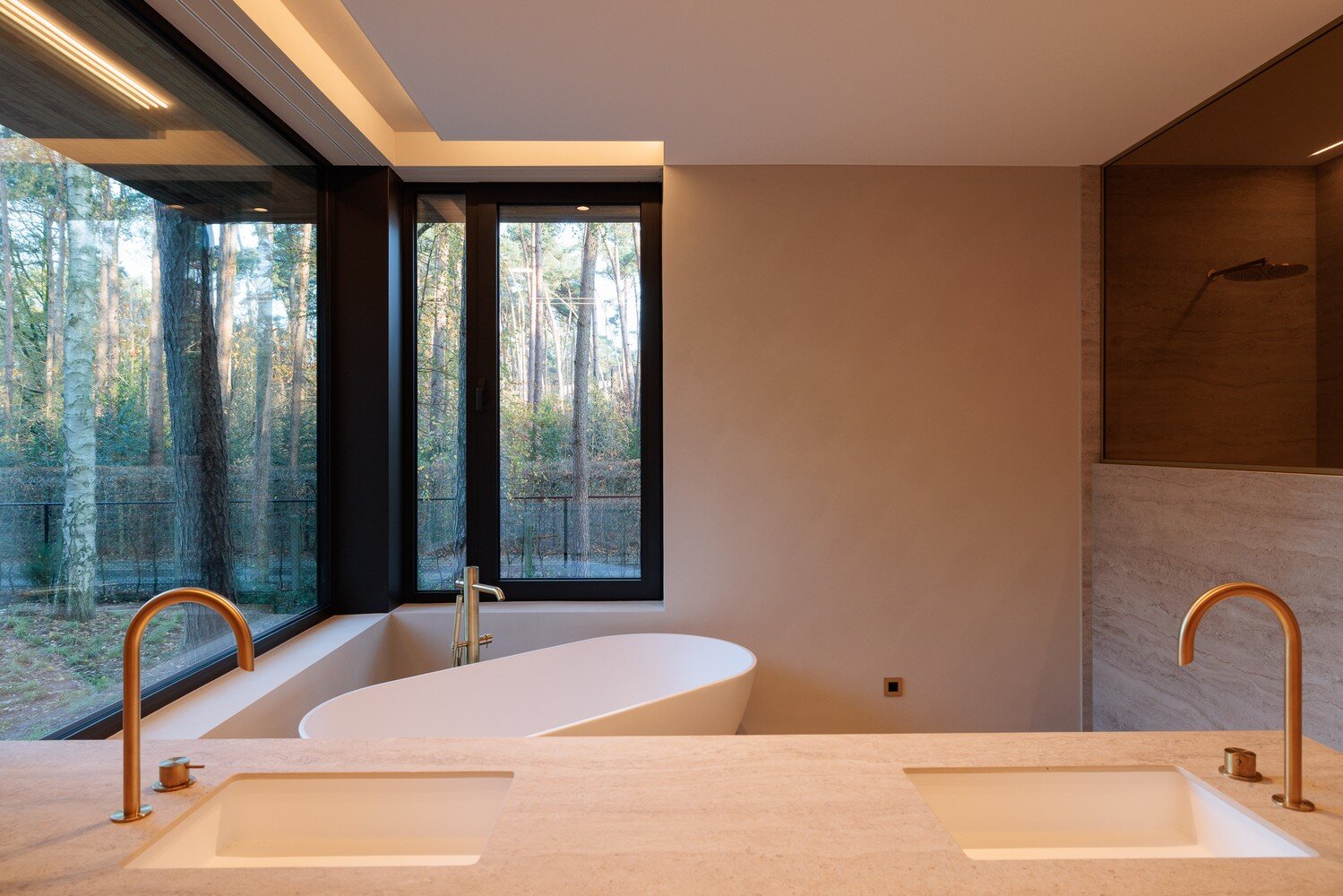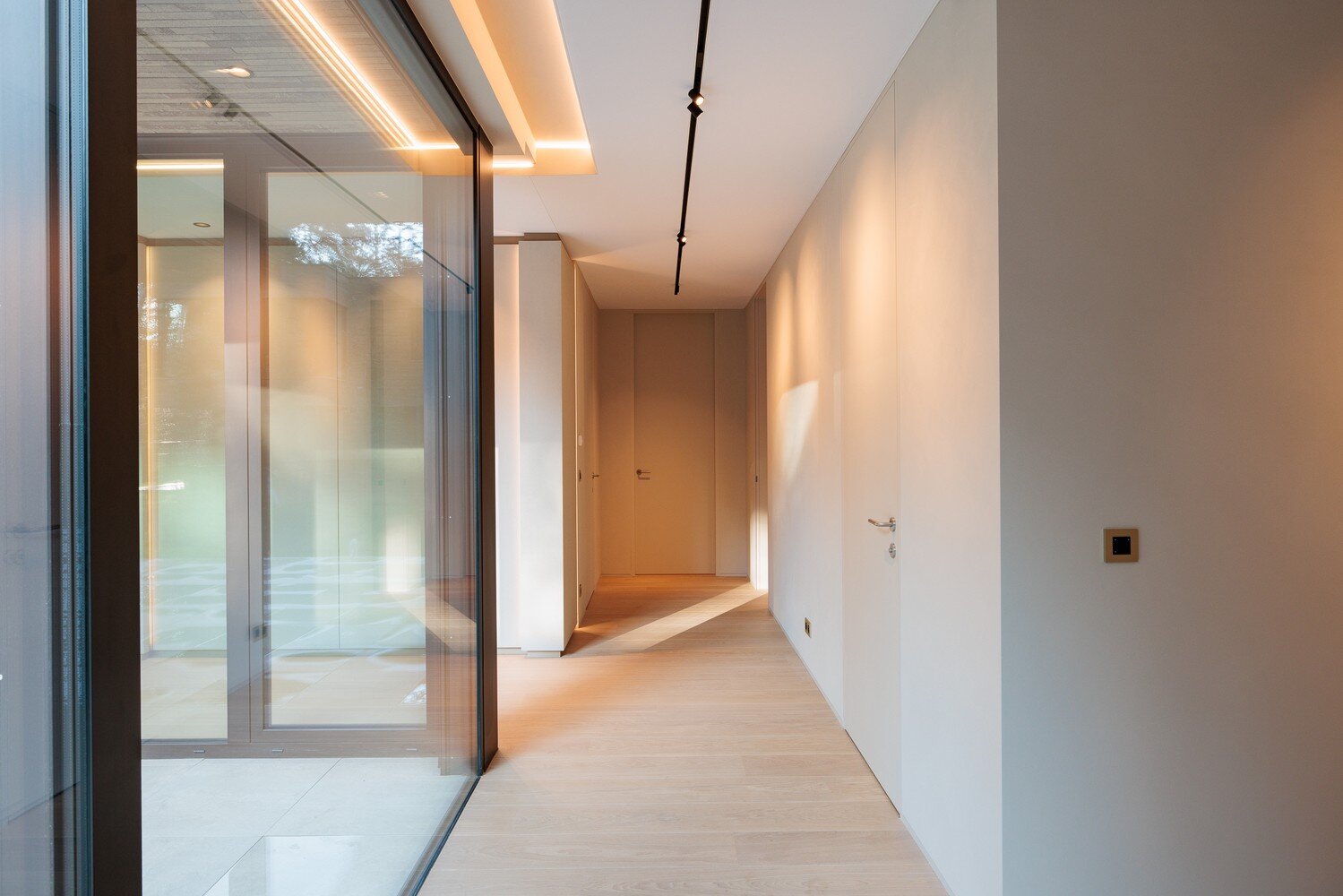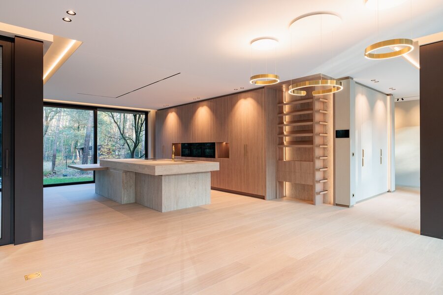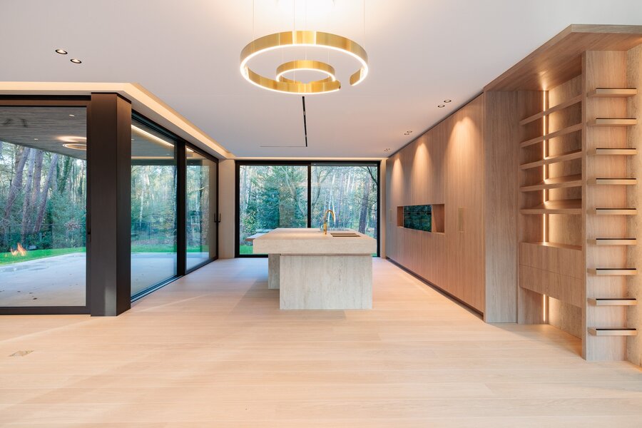 De royale leefruimte met elegante haardwand sluit naadloos aan op de luxueuze open keuken, volledig uitgerust met Miele-toestellen, een Bora-kookplaat en een Quooker-kraan. Deze leefzones vloeien over in twee deels overdekte terrassen van samen 41 m², met prachtig uitzicht op de riante gemeenschappelijke tuin en de groene omgeving. Eén van de terrassen beschikt bovendien over een gezellige ingebouwde buitenhaard – ideaal voor sfeervolle avonden in elk seizoen.
