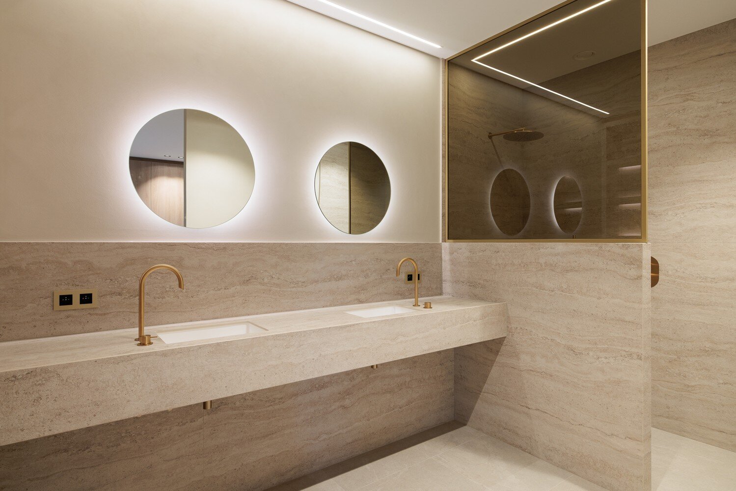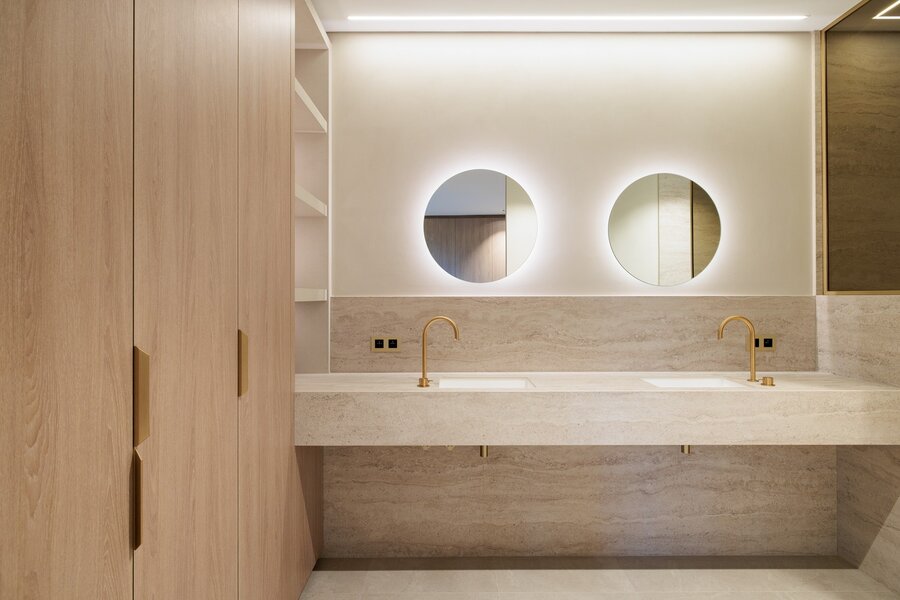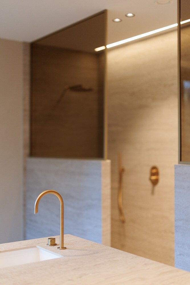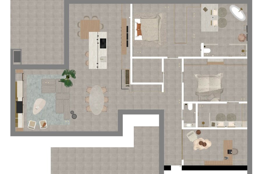 Aan de rustige zijde van het appartement bevindt zich de masterbedroom met dressing en ensuite badkamer, voorzien van ligbad, dubbele lavabo, inloopdouche en toilet. Daarnaast is er een tweede slaapkamer met eigen badkamer, een ruim bureel dat eventueel als derde slaapkamer kan worden ingericht, een apart gastentoilet en een praktische berging.