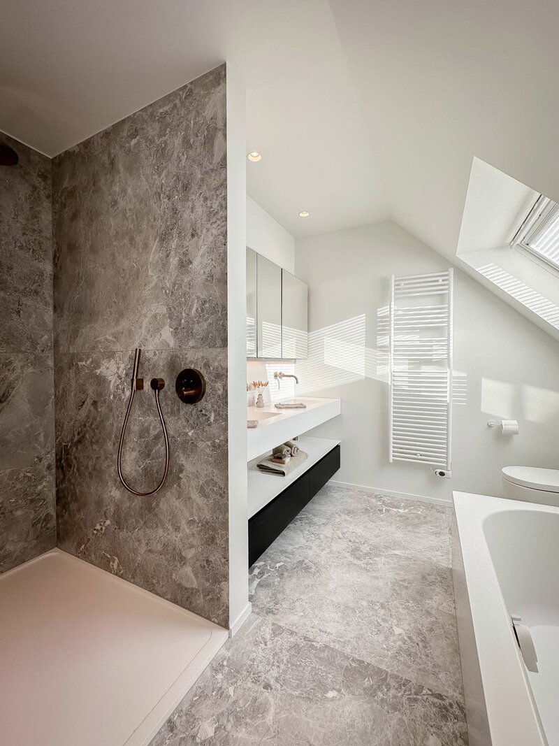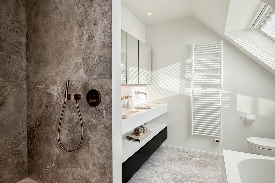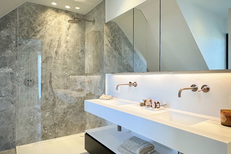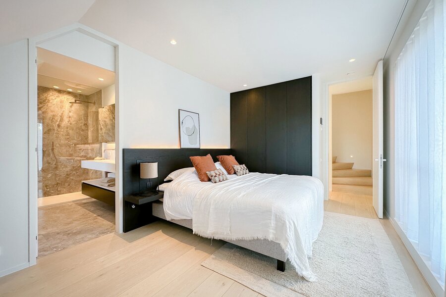Niveau 2: Deux chambres avec chacune leur propre salle de bains/douche et toilettes. Cet appartement en duplex est également équipé de placards encastrés et de chauffage par le sol.