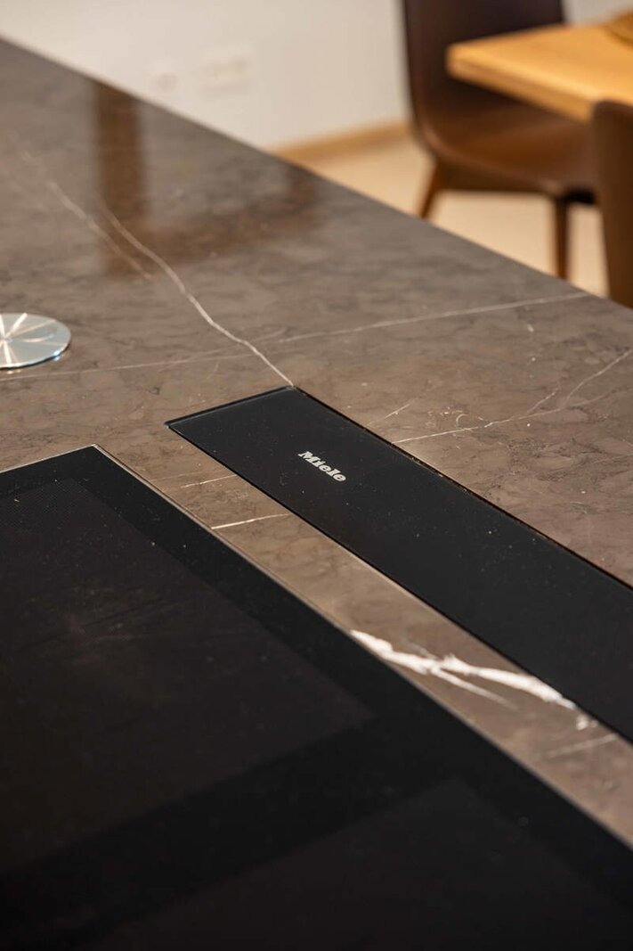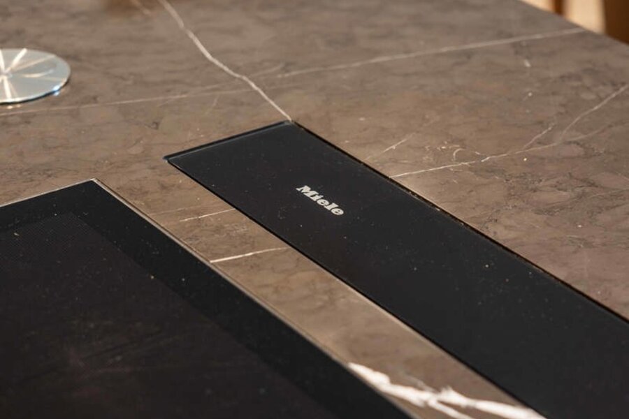 La cuisine ouverte est équipée d'appareils Miele de haute qualité. Le salon est baigné de lumière grâce à ses grandes baies vitrées et s'ouvre directement sur deux terrasses et un grand jardin ensoleillé.