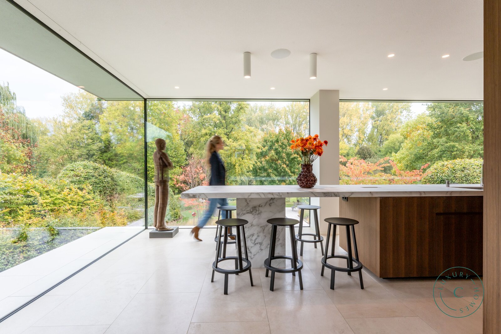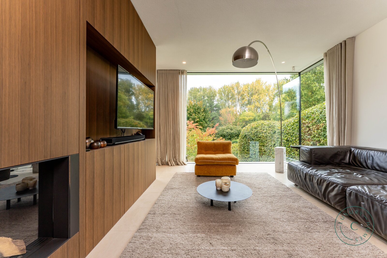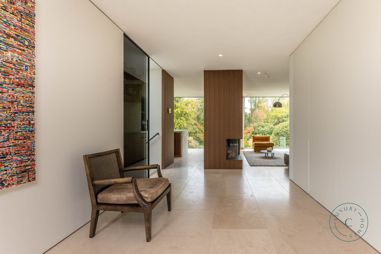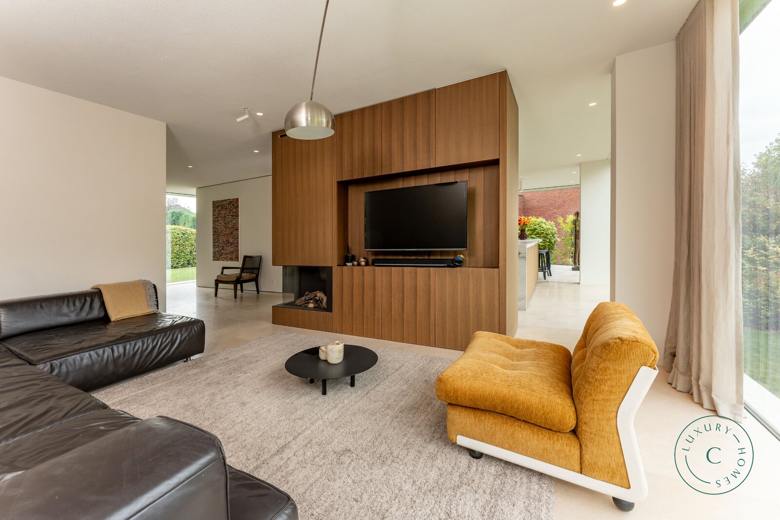 De villa, verdeeld over twee verdiepingen, werd ontworpen met bijzondere aandacht voor openheid, lichtinval en hoogwaardige afwerking. Vanaf de inkom wordt u verwelkomd in een ruime hal met een geïntegreerde garderobe en een apart toilet. De open leefruimte baadt in het licht dankzij de grote glaspartijen en de lichte trappartij met een bovenlicht. De zithoek met gasvuur vormt, samen met de volledig uitgeruste keuken, het kloppend hart van het huis. Vanuit beide ruimtes geniet u van een idyllisch zicht op de aangelegde tuin. Aangrenzend bevindt zich een aparte eetkamer die rechtstreeks toegang geeft tot het terras, uitgerust met een gezellige eettafel en ingebouwde verwarming — de ideale plek voor sfeervolle avonden, het hele jaar door.