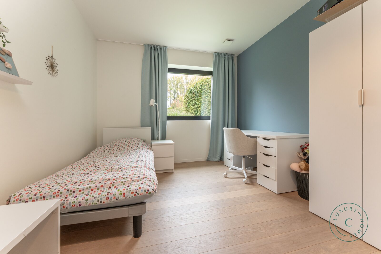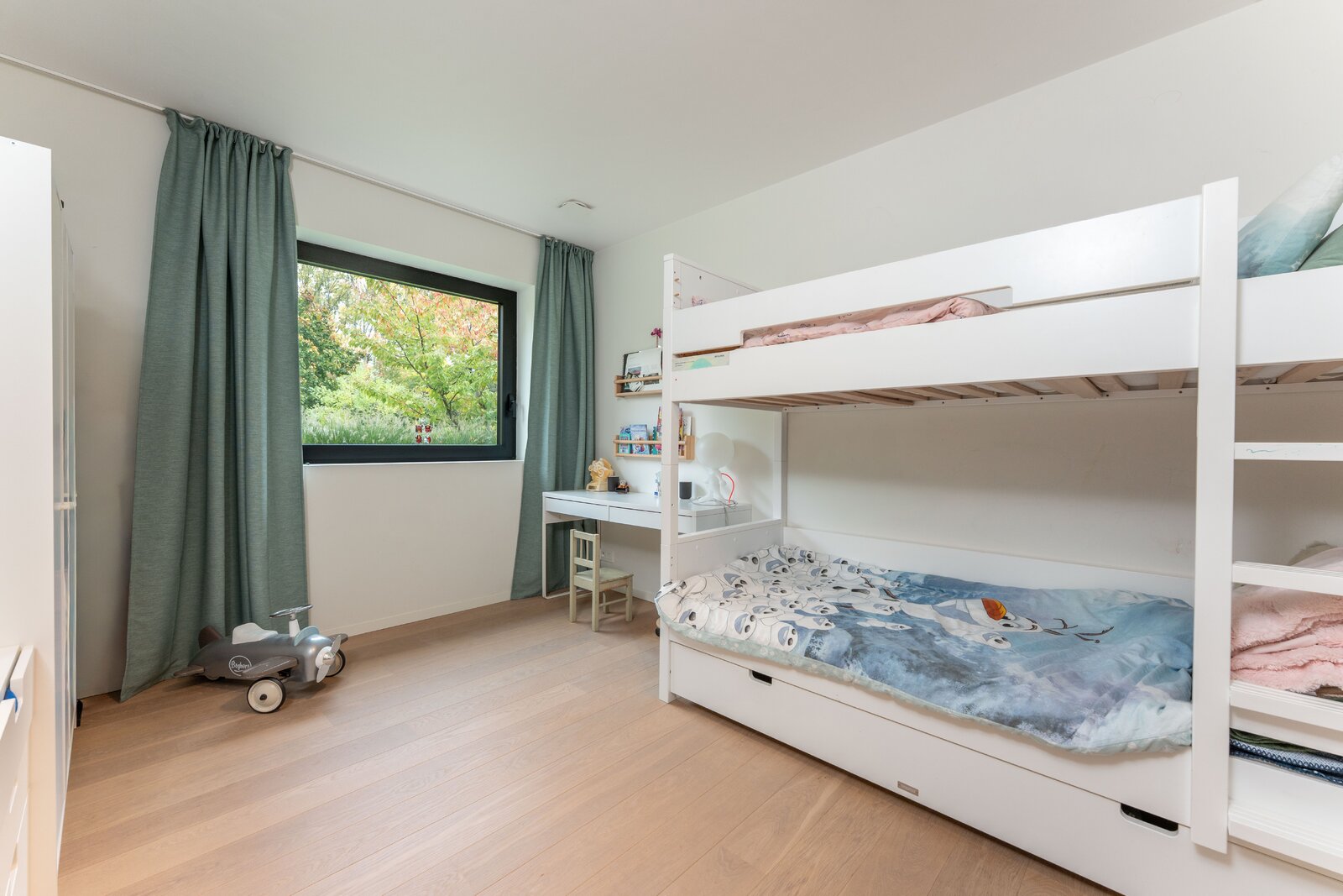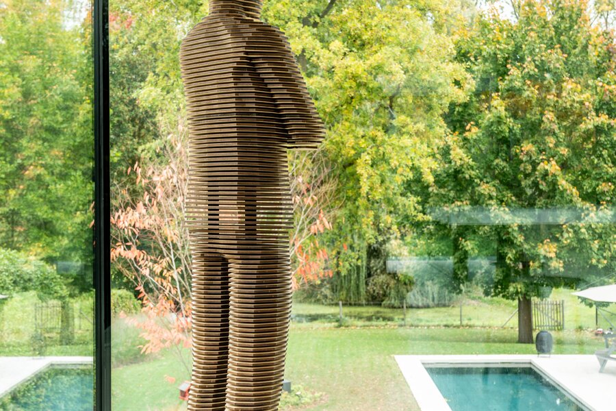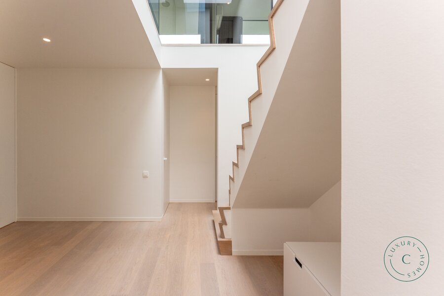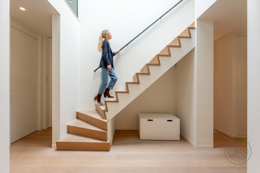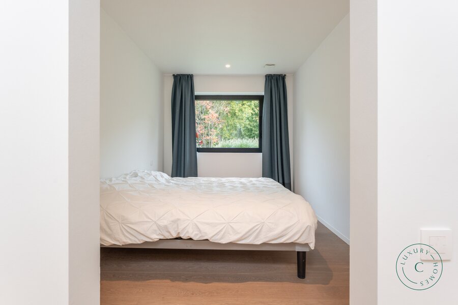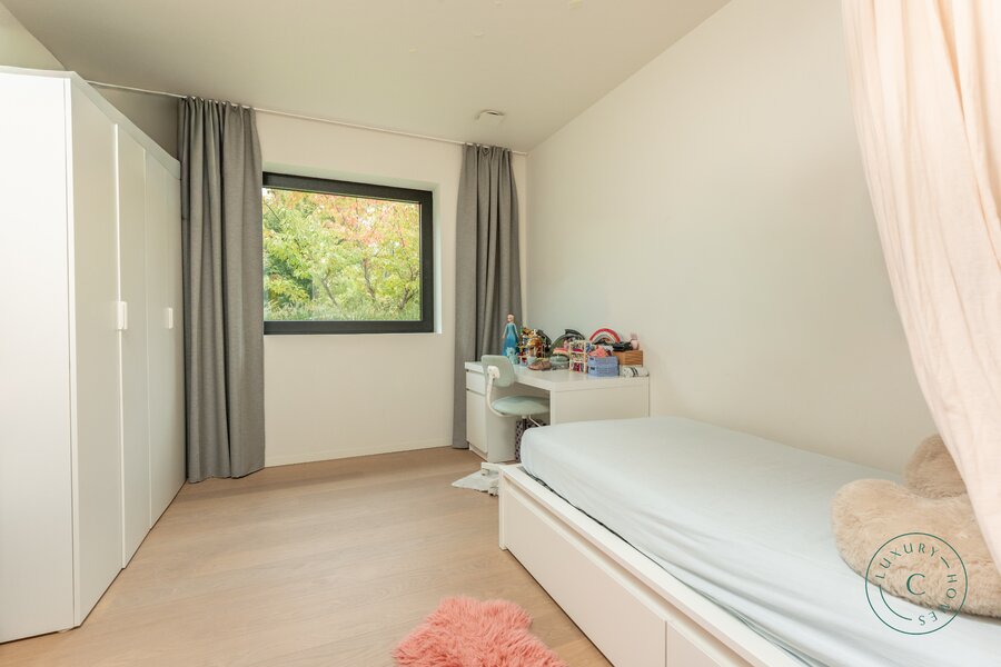 Het huis is gebouwd op licht hellend terrein, waardoor beide niveaus direct contact hebben met de tuin. Dit creëert een opmerkelijk ruimtelijk gevoel en maakt van elke verdieping een volwaardige woonlaag met uitzicht op het groen. Op maat gemaakte kasten van hoge kwaliteit zijn doorheen het huis geïntegreerd, wat zorgt voor een strakke en rustige afwerking. De trap leidt naar de slaapvertrekken, waar rust en comfort centraal staan. Hier bevinden zich vier slaapkamers, waaronder een luxueuze ouderlijke suite met aansluitende dressing en badkamer voorzien van een inloopdouche en dubbele wastafel. Een tweede badkamer met bad en douche, evenals een functionele berging/wasruimte, vervolledigen deze verdieping.