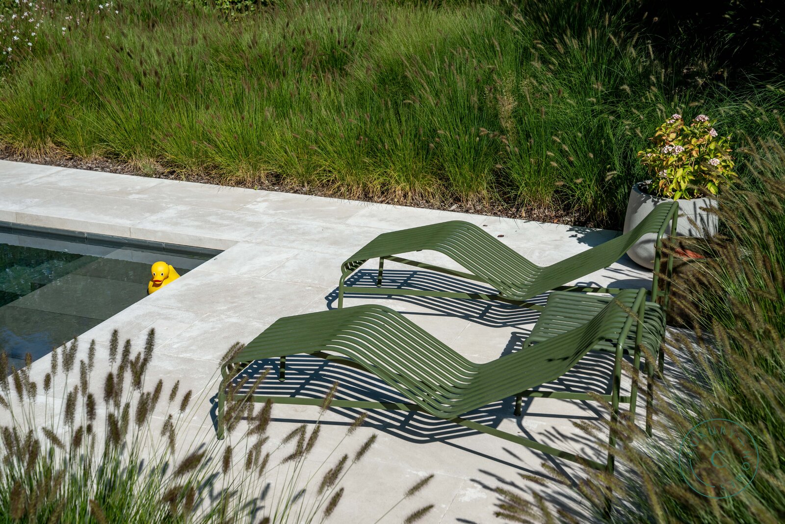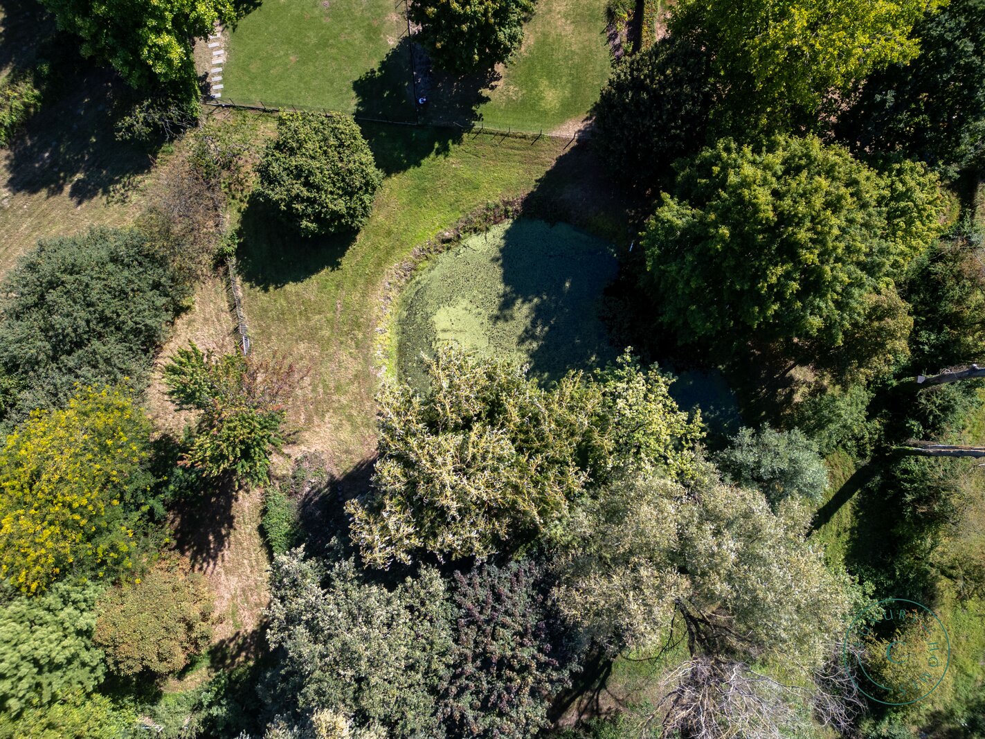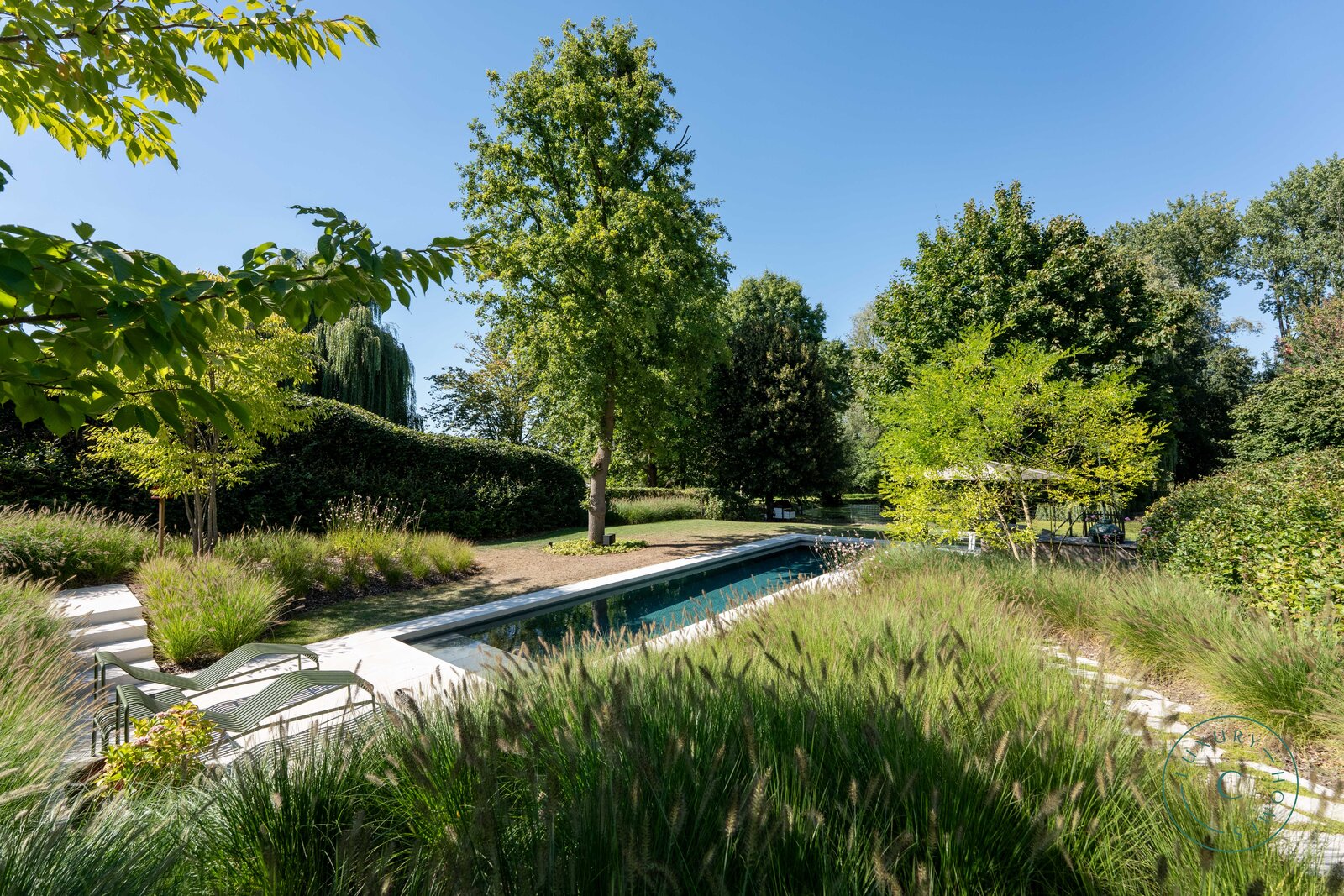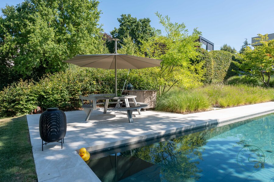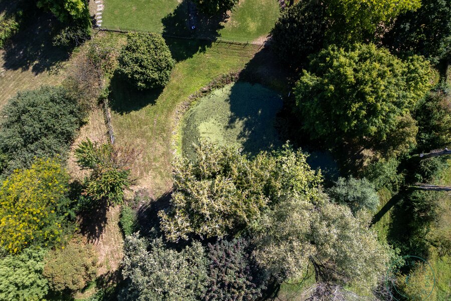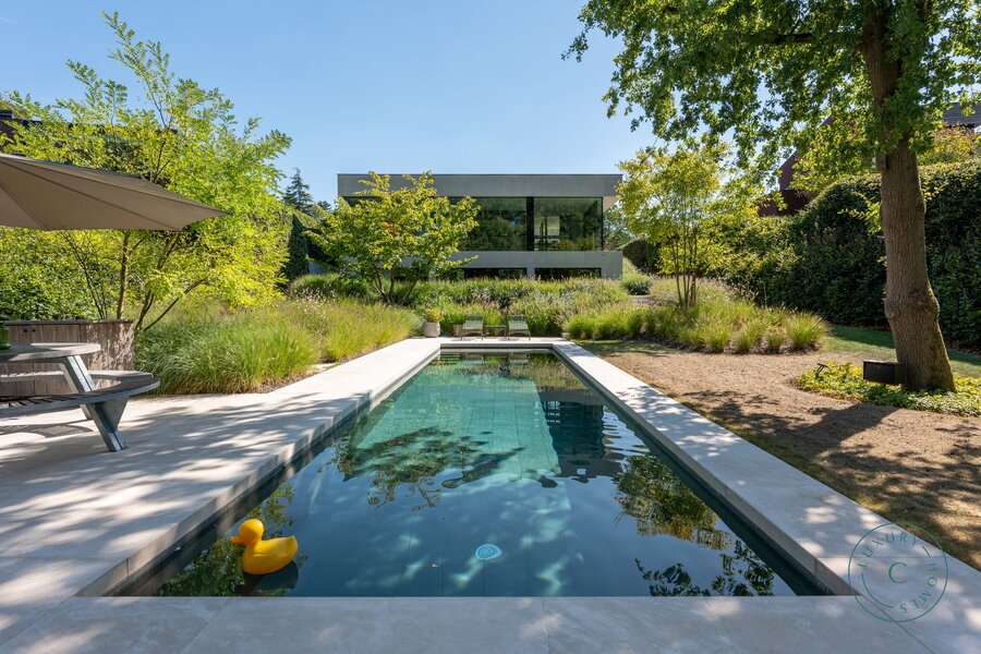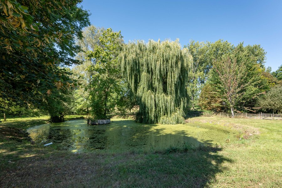 Het hoge afwerkingsniveau zet zich ook buiten voort. De door een professional aangelegde tuin staat vol natuurlijke beplanting en biedt dankzij meerdere terrassen een echte oase van rust en privacy. Het zwembad, verwarmd door een aparte warmtepomp, is omgeven door groen en zorgt voor aangename verfrissing op zonnige dagen. Achter in de tuin bevindt zich een charmante vijver die gedeeld wordt met de buurperceel — een pittoresk element dat het landelijke karakter van de plek versterkt.