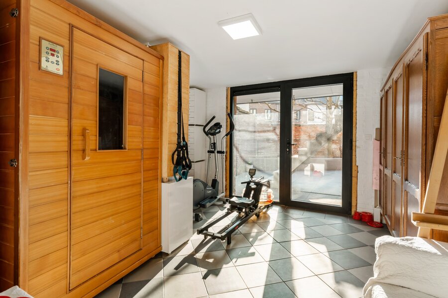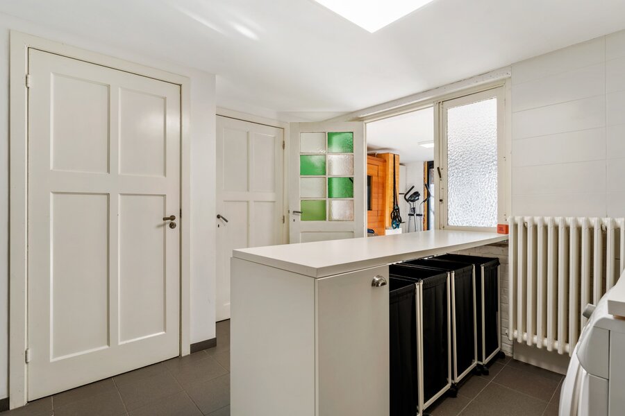 Gelijkvloers: inpandige garage, wasplaats, hobby-/fitnessruimte, apart toilet, muziekstudio, ruim ommuurd terras, kelder