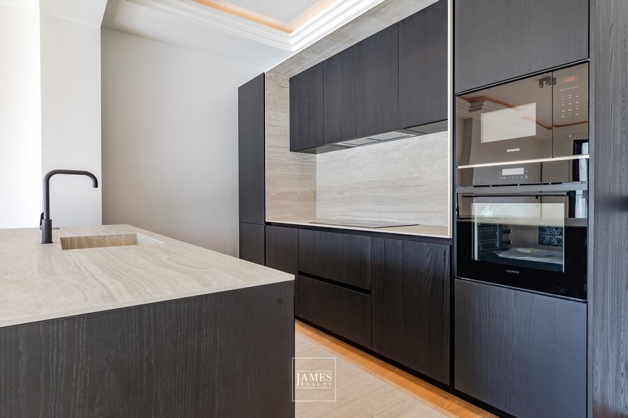 Les espaces de vie se composent d’un beau séjour lumineux avec cuisine américaine hyper-équipée réalisée sur mesure. La partie salon s’ouvre sur une agréable terrasse orientée plein sud, offrant un prolongement extérieur particulièrement apprécié et une belle luminosité tout au long de la journée.