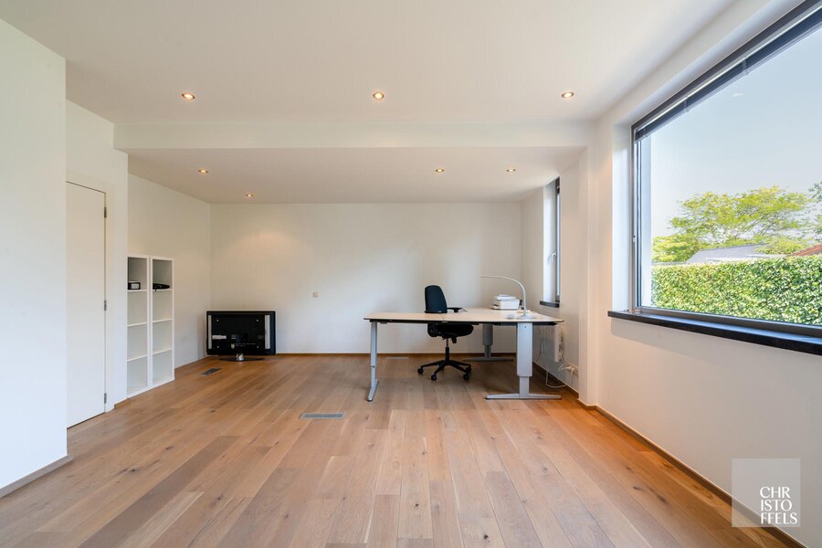 Op het gelijkvloers is er inkomhal en de leefruimte ingericht met een zit- en eethoek met vide. Verder is er een bureelruimte met archief, mogelijk opnieuw in te richten als gelijkvloers slaapkamer. Daarnaast is er een wasruimte met inbouwkasten en aansluitingen voor wasmachine en droogkast en ten slotte de volledig geïnstalleerde leefkeuken.