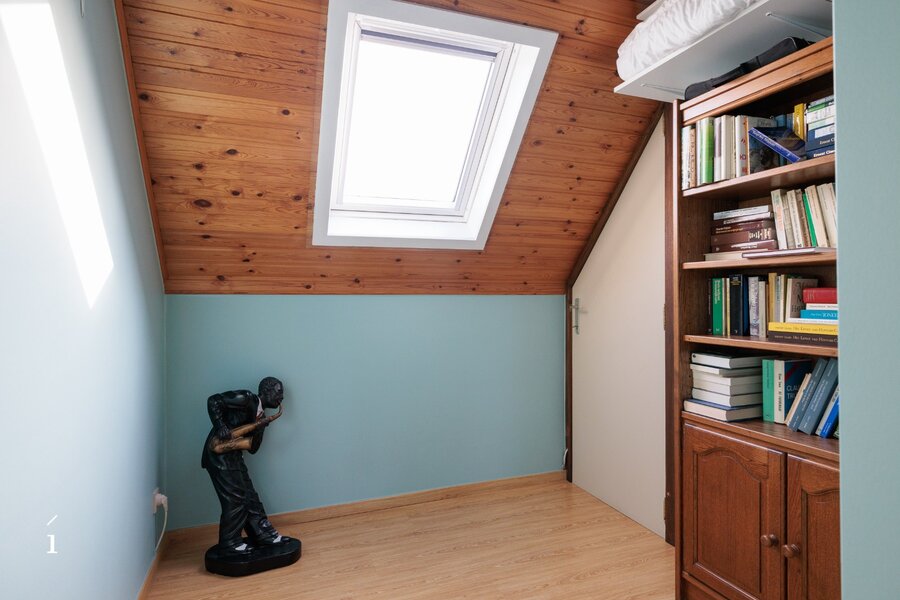 Op het gelijkvloers verwelkomt de inkomhal u in een ruime en lichtrijke leefruimte met pelletkachel, waar het open bureau naadloos aansluit en zorgt voor een aangename werk- en leefomgeving. De vernieuwde keuken sluit praktisch aan op de garage en wordt aangevuld met een polyvalente ruimte en veranda. Verder zijn er drie volwaardige slaapkamers, een hobbykamer, een badkamer en een bijkomende bergruimte.
