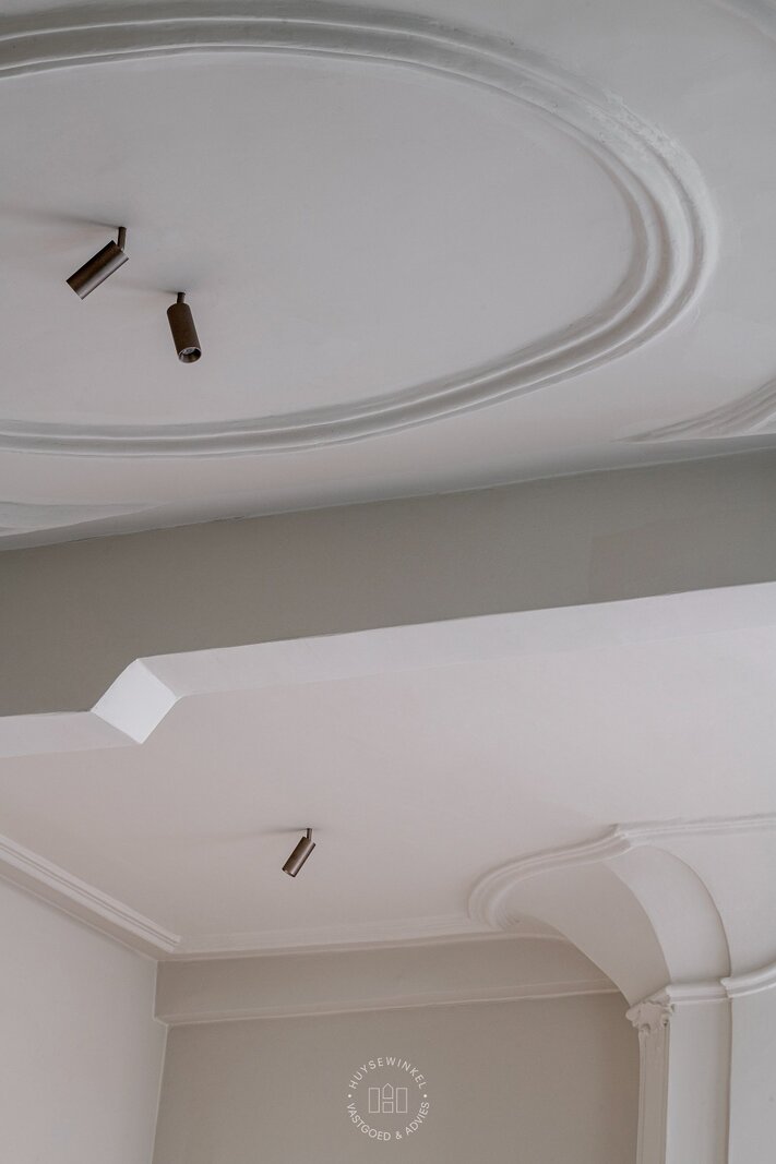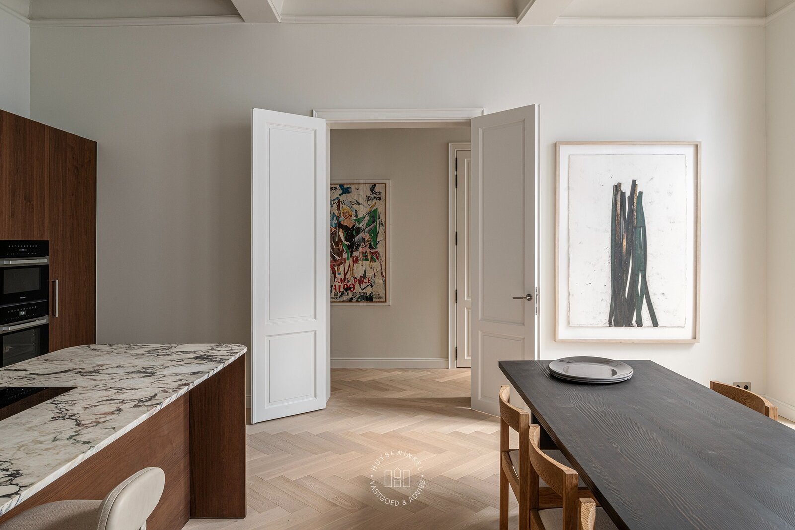Authentieke elementen zoals klassieke schouwmantels en kwalitatieve parketvloeren geven het interieur een warme, tijdloze uitstraling. De strak vormgegeven keuken en badkamers zorgen voor een verfijnd hedendaags accent en creëren een mooi evenwicht met het historische karakter van de woning.