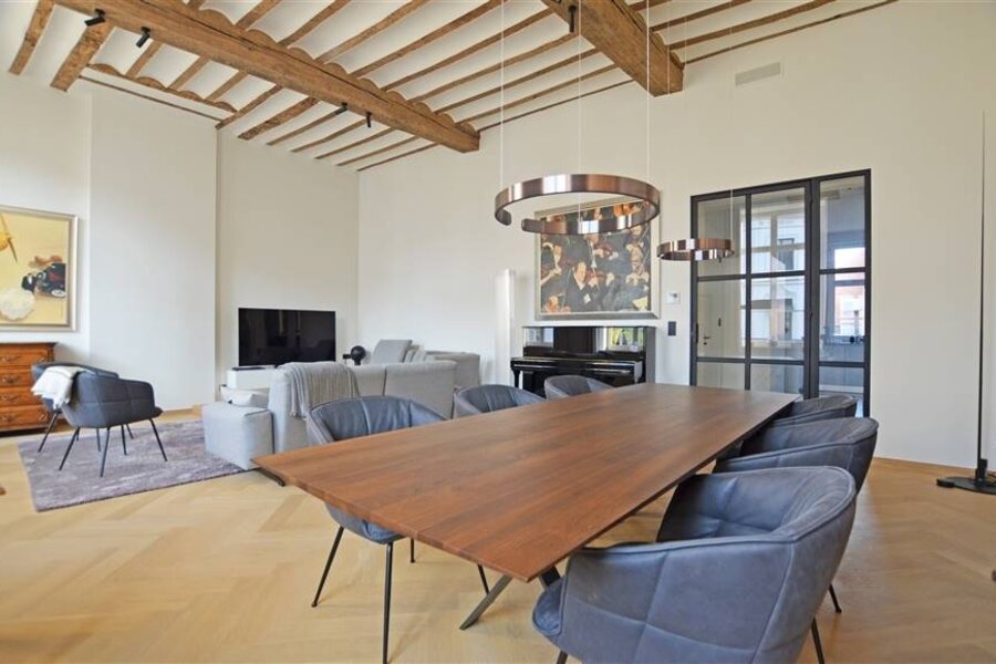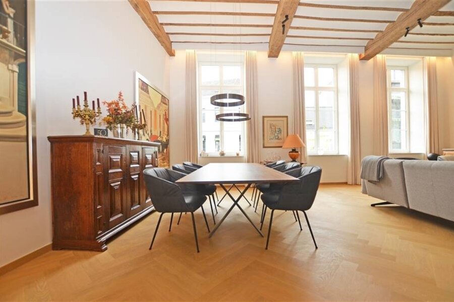 De grote leefruimte met parket omvat een living en-eetplaats en biedt uniek zicht op de Havermarkt met het oude gerechtsgebouw. Dit zorgt voor een statige beleving!
