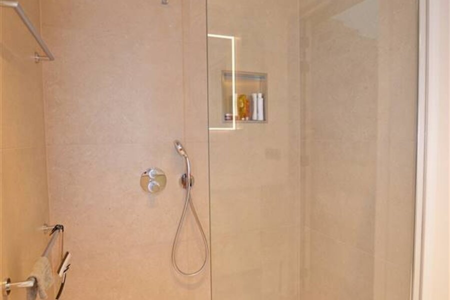 Via de nachthal bereiken we de masterbedroom, de douchekamer met verwarmde spiegel en een wasplaats met apart toilet.
