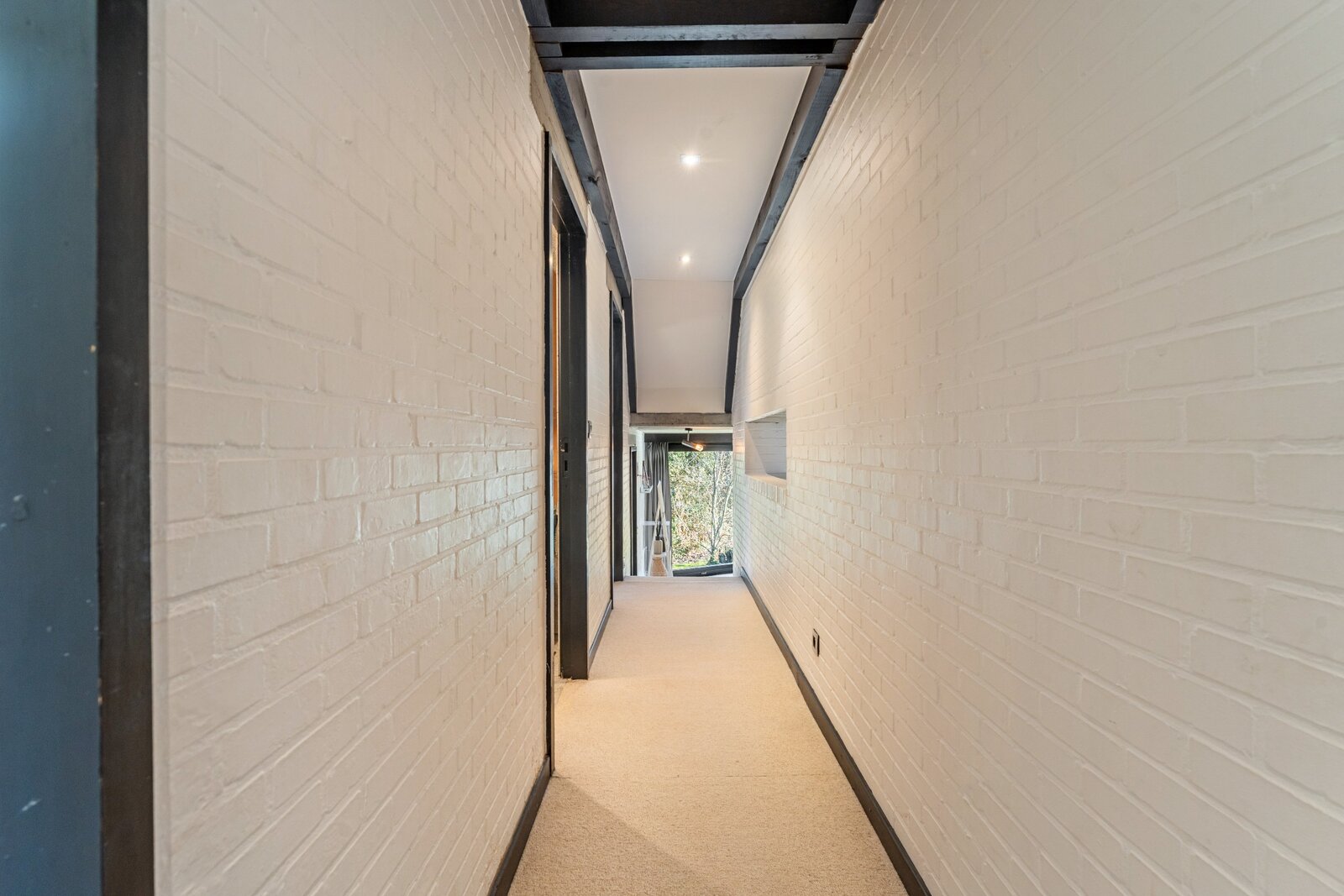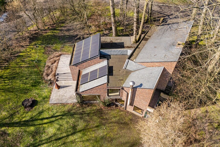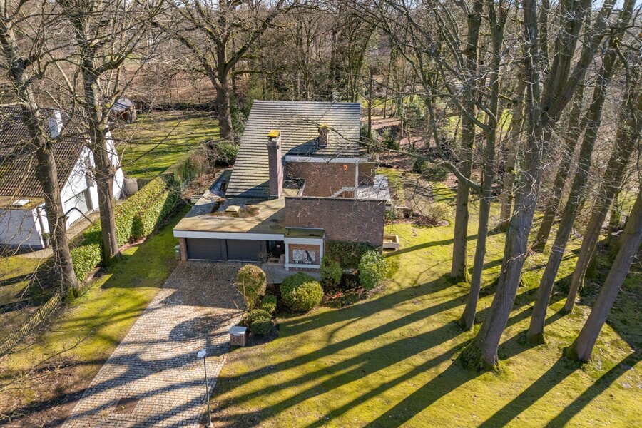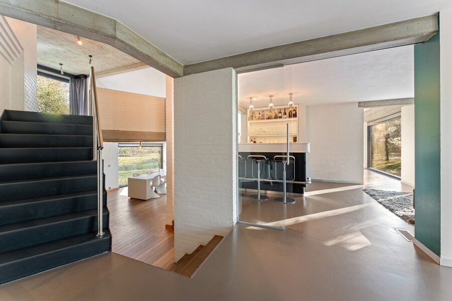 De woning werd architecturaal clean en asymmetrisch opgebouwd, met een sterke vormentaal die meteen indruk maakt. Het volledige concept is minutieus doordacht, zowel esthetisch als functioneel. Ontworpen in de typische seventies stijl, combineert deze eigendom verfijnd zichtbeton, uitgesproken raamvlakken en markante schuin aflopende dakpartijen tot een krachtig en tijdloos geheel.