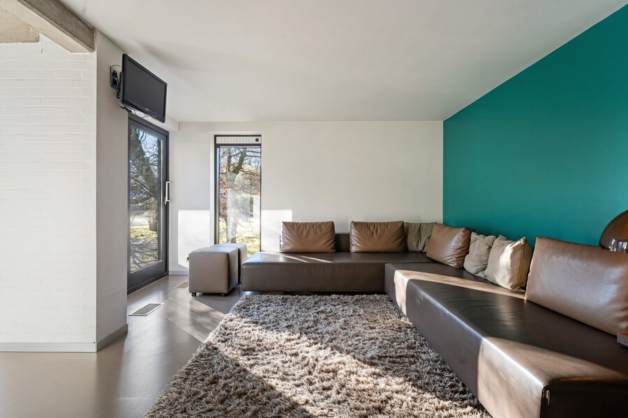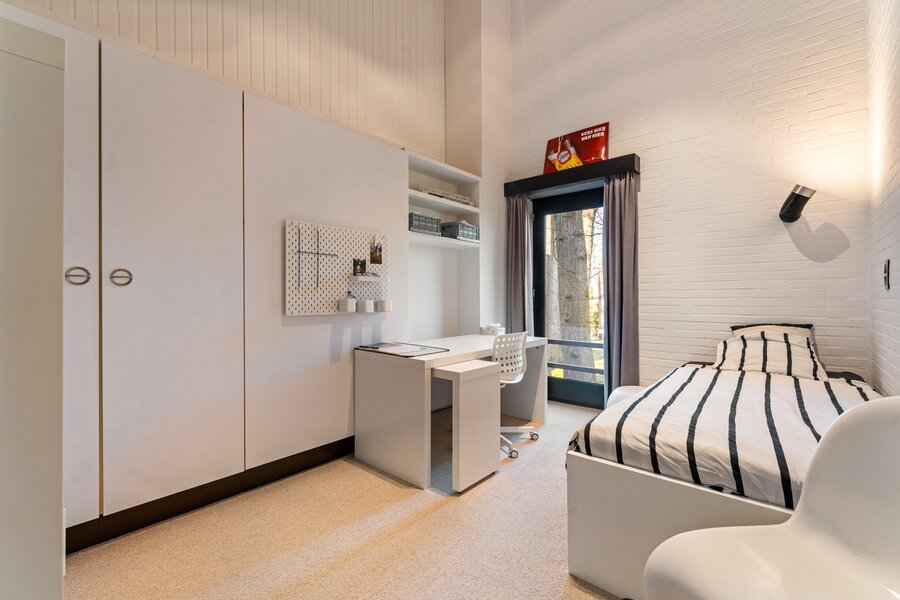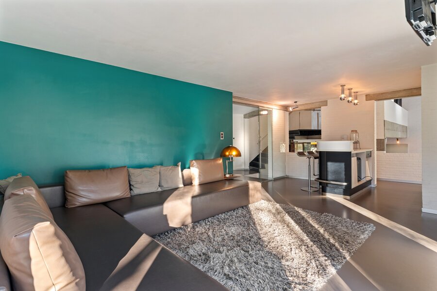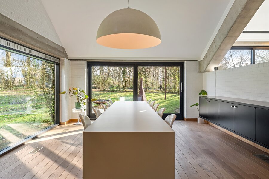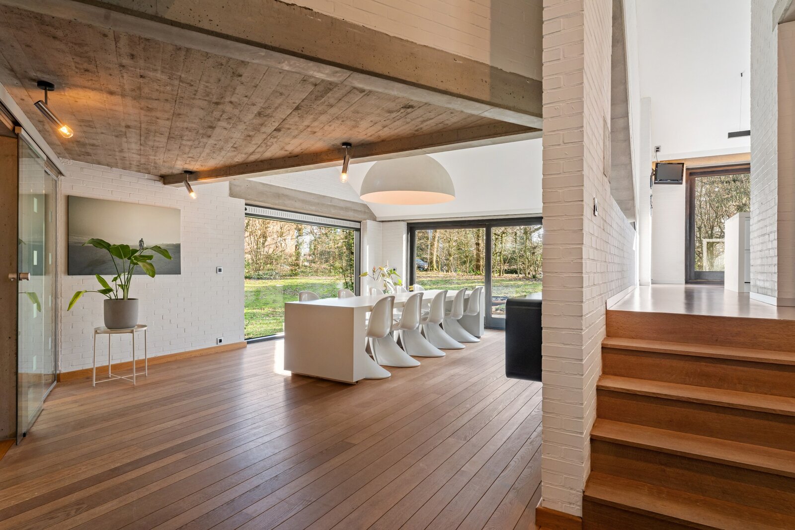 Binnenin ervaart u een bijzonder gevoel van ruimte en licht. De kamers zijn ruim, luchtig en uitzonderlijk aangenaam, met gestretchte perspectieven en overvloedig binnenstromend daglicht. De verschillende niveauverschillen zorgen voor een speels maar logisch ruimtelijk verloop, waarbij elke zone een eigen identiteit krijgt — verstandig ingedeeld en tegelijk warm en gezellig.