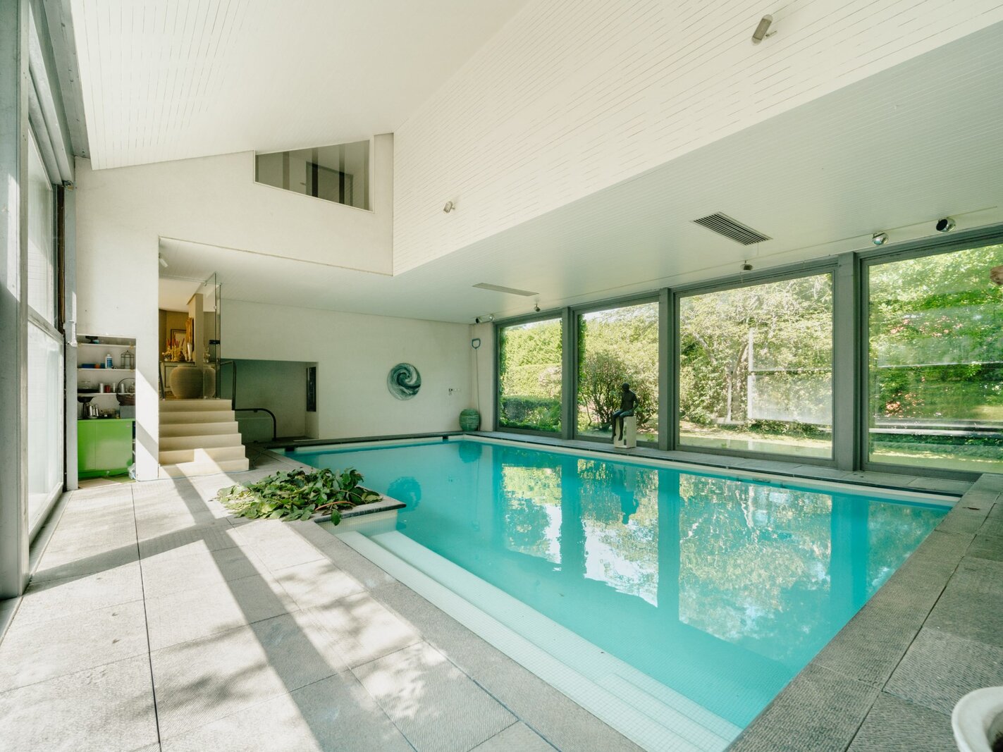 Le rez-de-chaussée (415 m²) s’ouvre sur un vaste hall d’entrée et comprend un double salon baigné de lumière avec cheminée, un bureau, une salle à manger, une cuisine séparée, ainsi qu’une somptueuse piscine intérieure ouverte sur le jardin.
