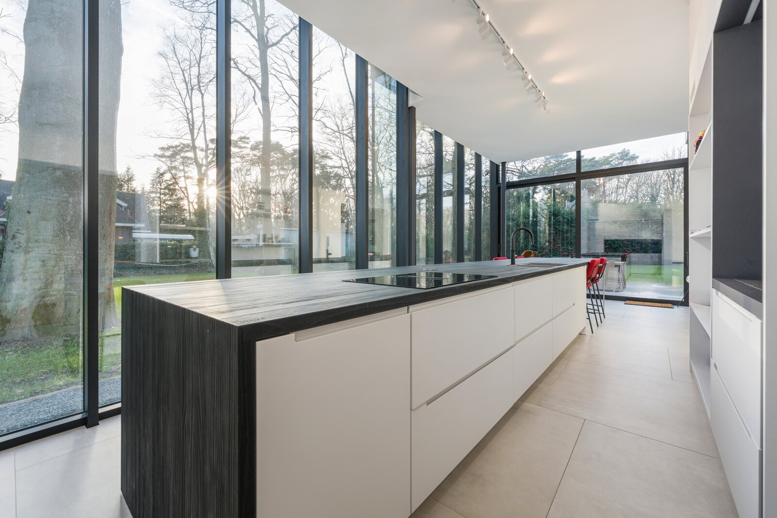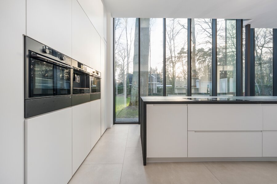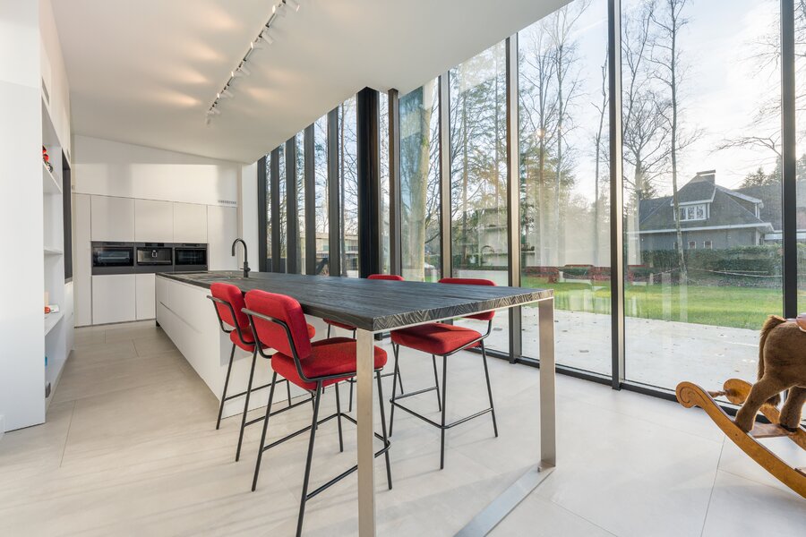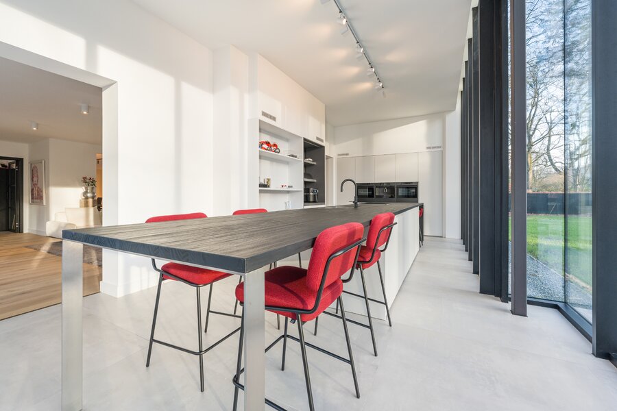L 'espace de vie spacieux jouit d'une vue ouverte sur le jardin et s'intègre parfaitement dans l'impressionnante cuisine, logée dans une élégante extension en verre. Équipée d'appareils électroménagers de haute qualité, cette cuisine est le cœur battant de la maison, avec une forte connexion entre l'intérieur et l'extérieur, idéale pour ceux qui aiment vivre de manière accueillante et confortable.