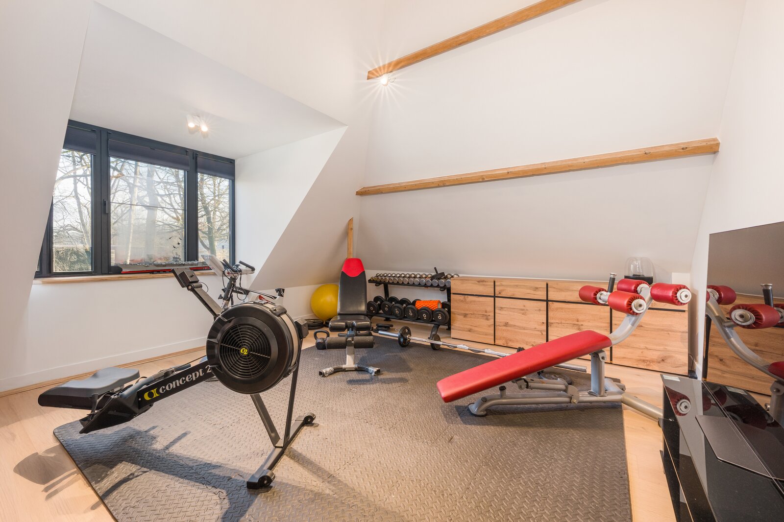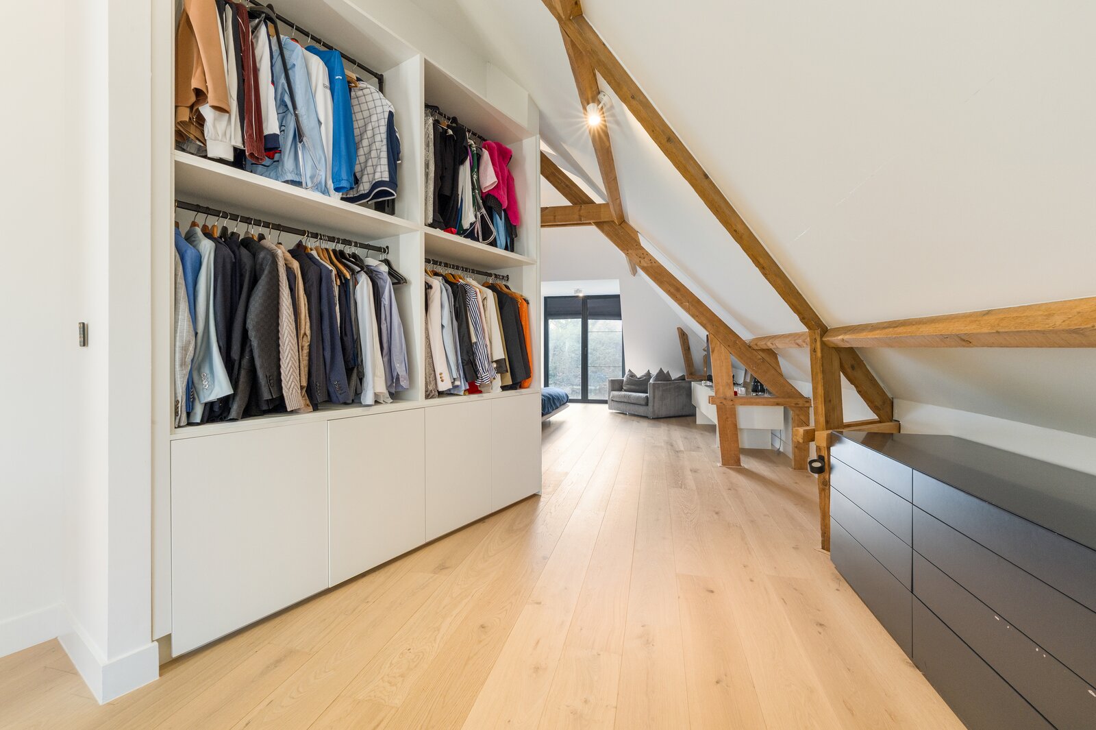L'élégant escalier en acier mène au premier étage, où quatre chambres de taille normale sont logées sous les structures de toit de caractère.