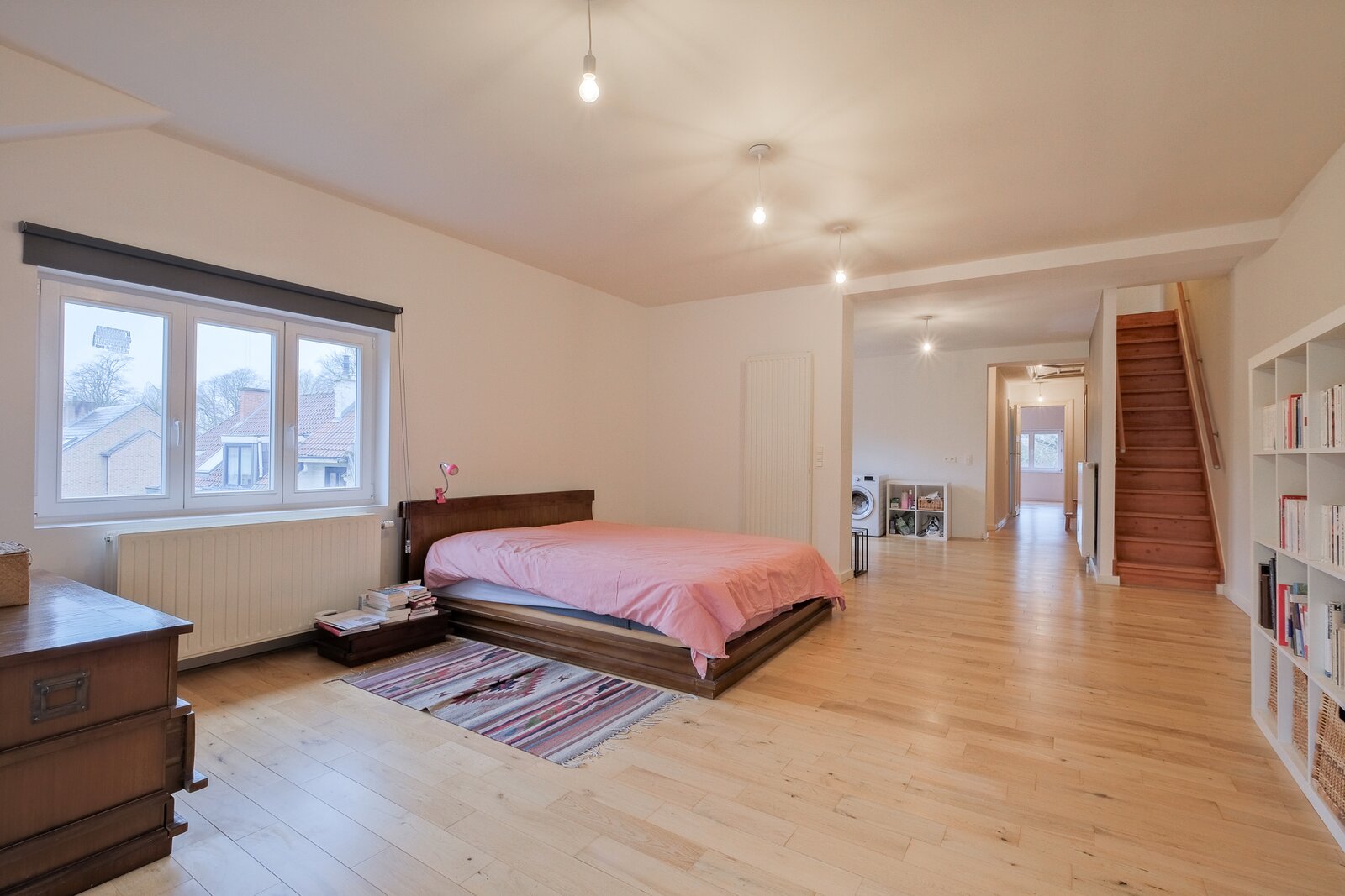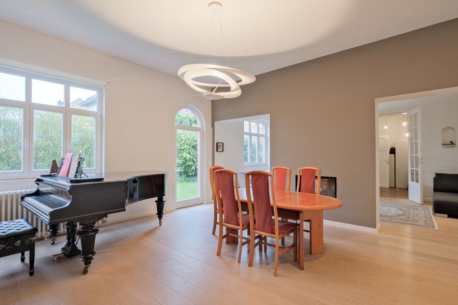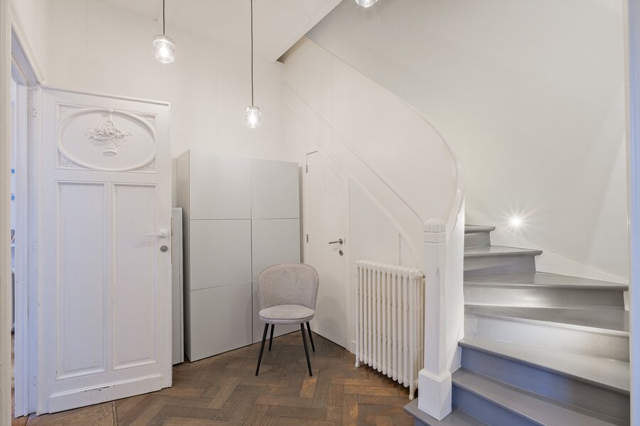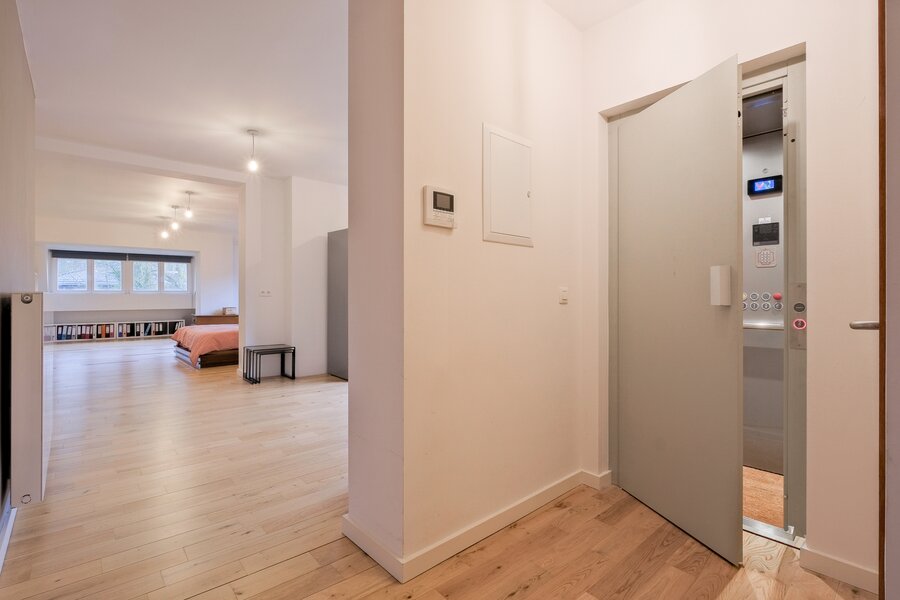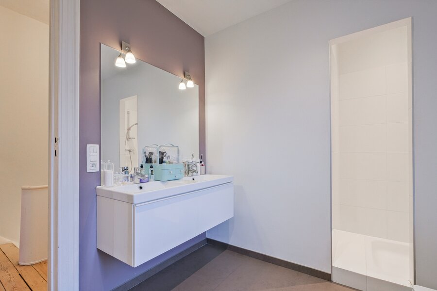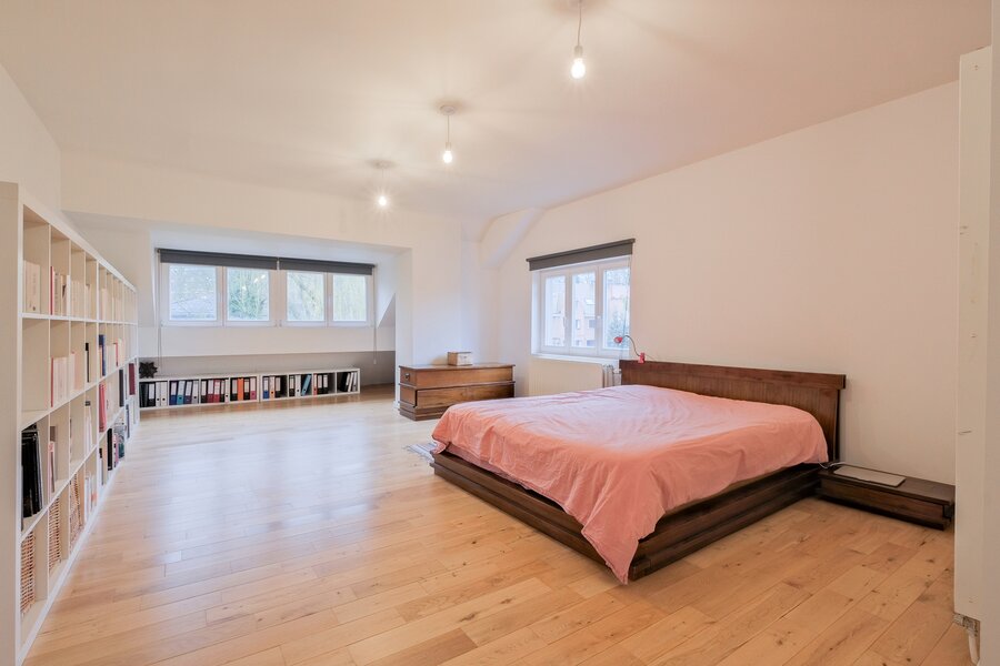 2e étage (± 110 m²) : hall de ± 7 m², 2 chambres de ± 30 et 17.5 m², toilette de ± 1 m², salle d’eau de ± 7 m², pièce polyvalente de ± 9 m²,
