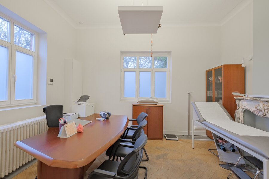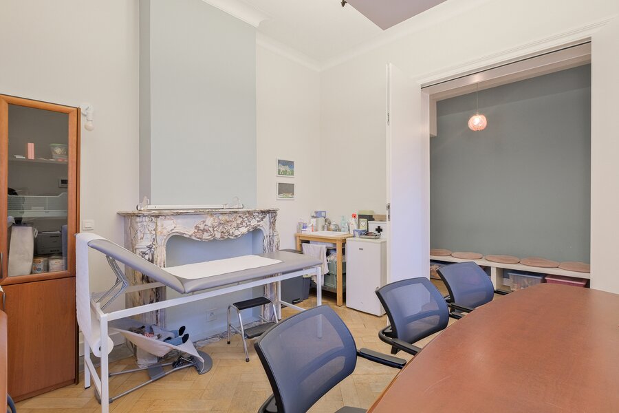 Rez-de-chaussée (± 131 m²) : hall d’entrée de ± 2 m², salle d’attente cabinet de ± 5 m², toilette de ± 1 m², cabinet de ± 18 m², hall maison de ± 7.5 m², toilette de ± 1 m², séjour de ± 52 m², cuisine de ± 12.5 m²,