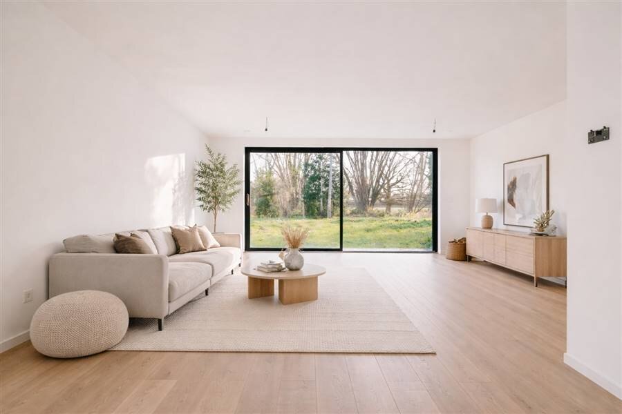 De grandes fenêtres apportent beaucoup de lumière et relient de manière transparente les espaces de vie spacieux aux jardins orientés au sud-ouest.