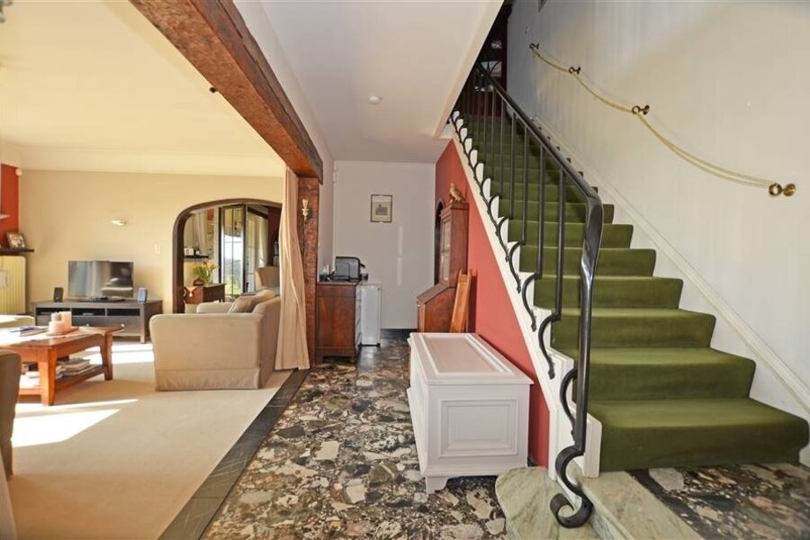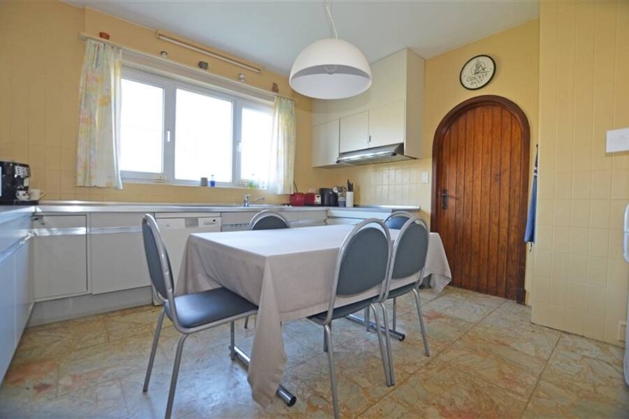 Deze klassieke villa werd gebouwd in ±1966 en resulteerde in een mooie gezinswoning. Via de inkomhal met gastentoilet bereiken we de aangename leefruimte. Deze bestaat uit een open aaneenschakeling van een zithoek, een ruime eetkamer met haard die een gezellige touch geeft aan deze ruimte en een tuinkamer met zicht op de achterliggende plantages. Aansluitend bevindt zich een leefkeuken en een bijkeuken/wasplaats.