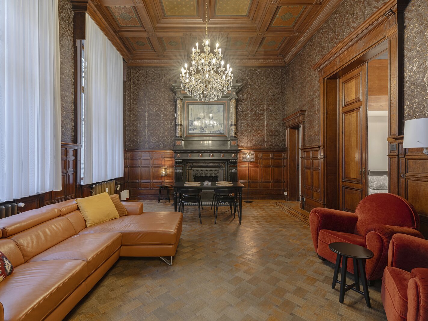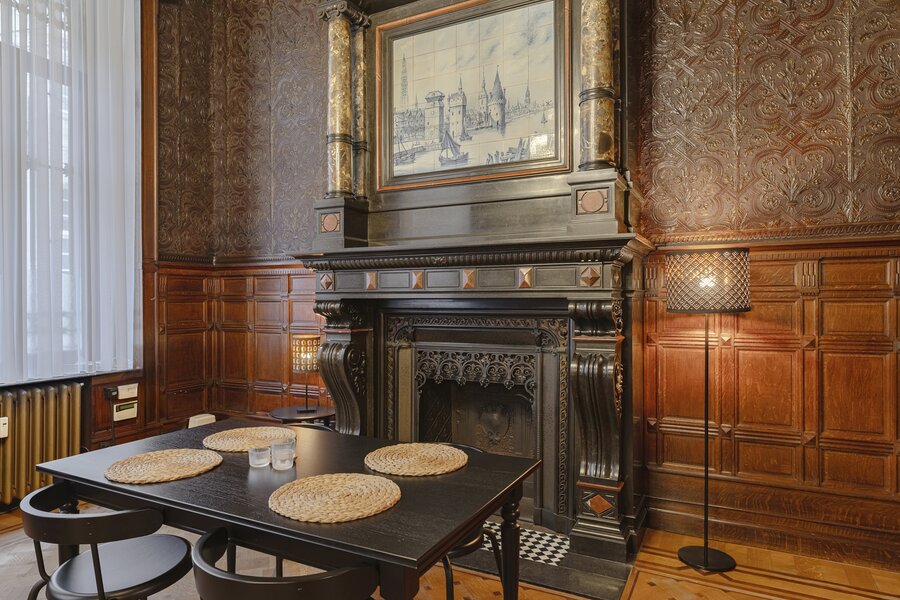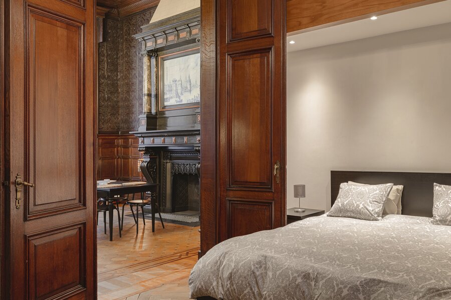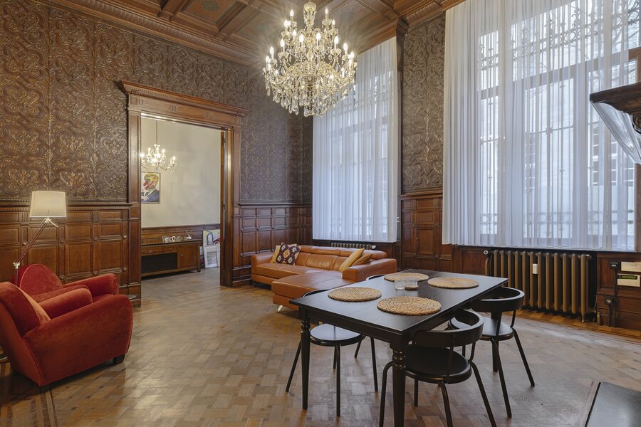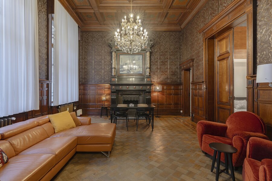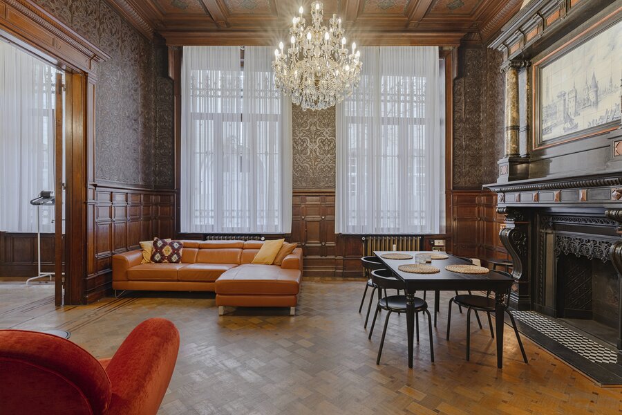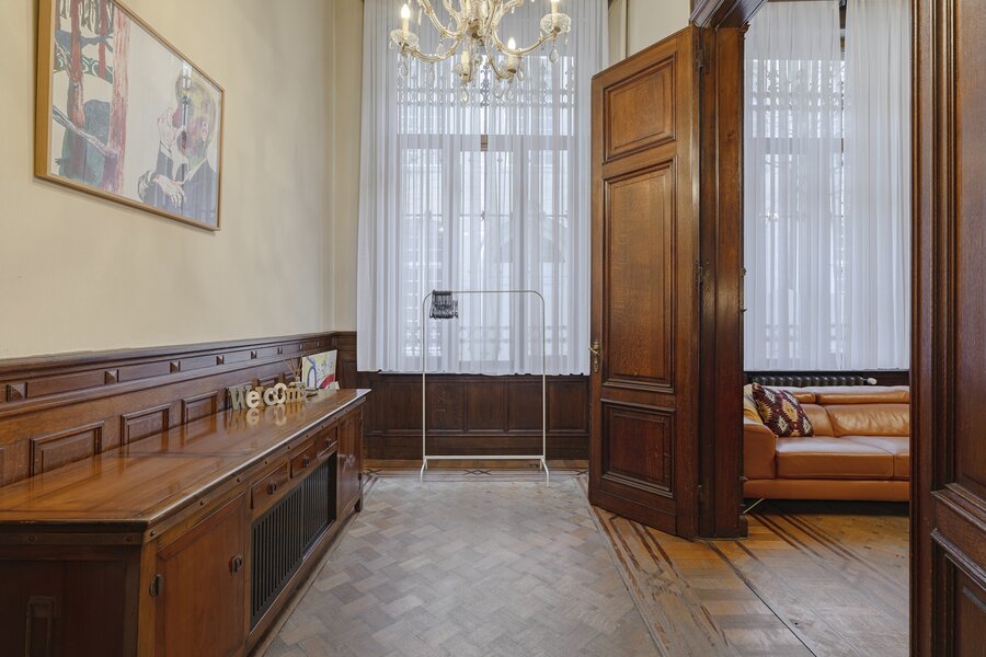 Appartement authentique meublé au rez-de-chaussée dans un palais urbain unique datant de 1892, situé au calme dans une rue sans issue, à côté de la magnifique Bourse rénovée, en plein centre historique d’Anvers, à deux pas du Meir.