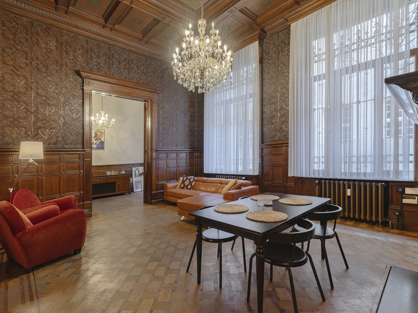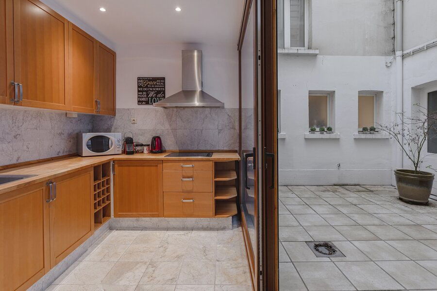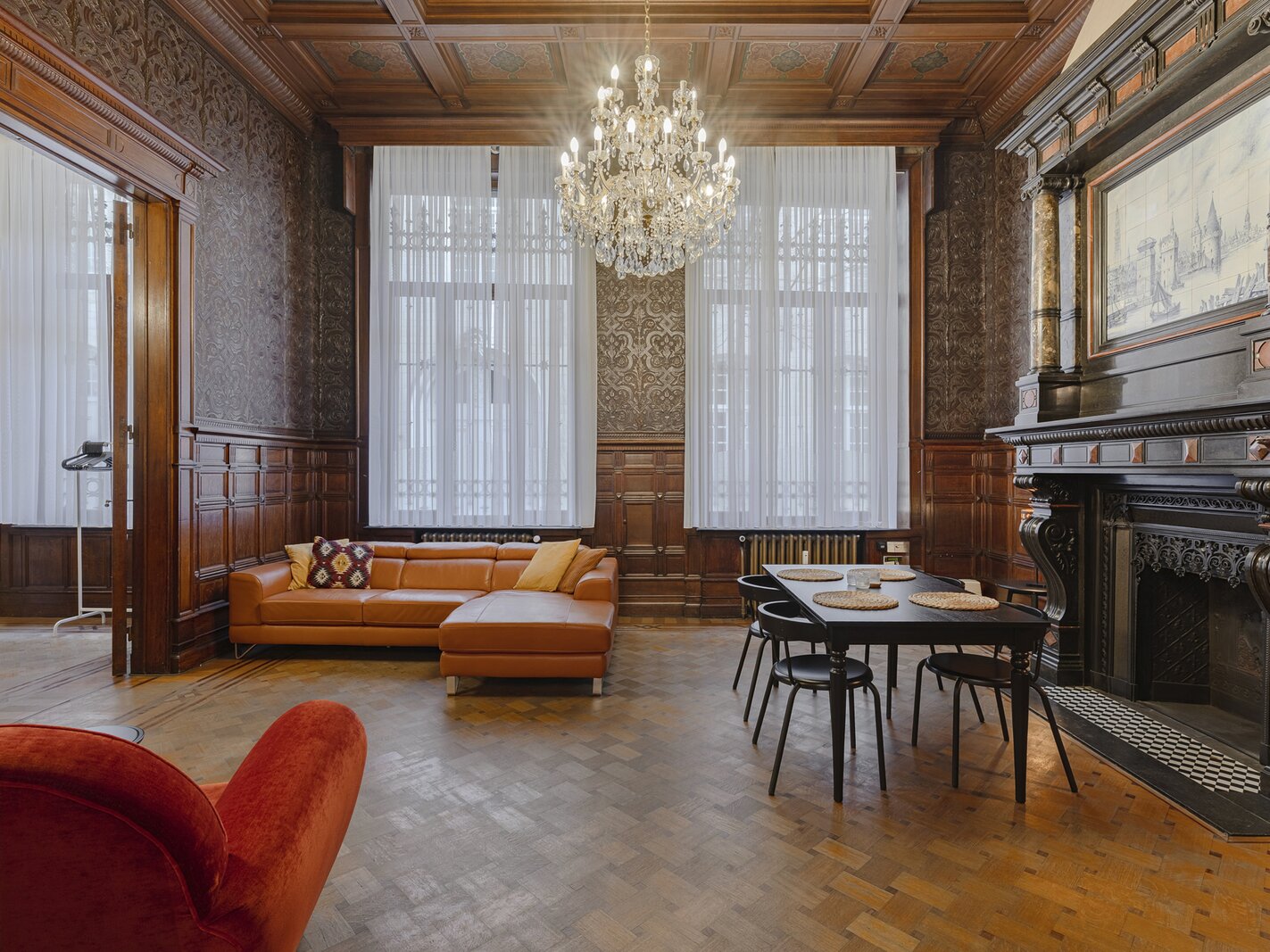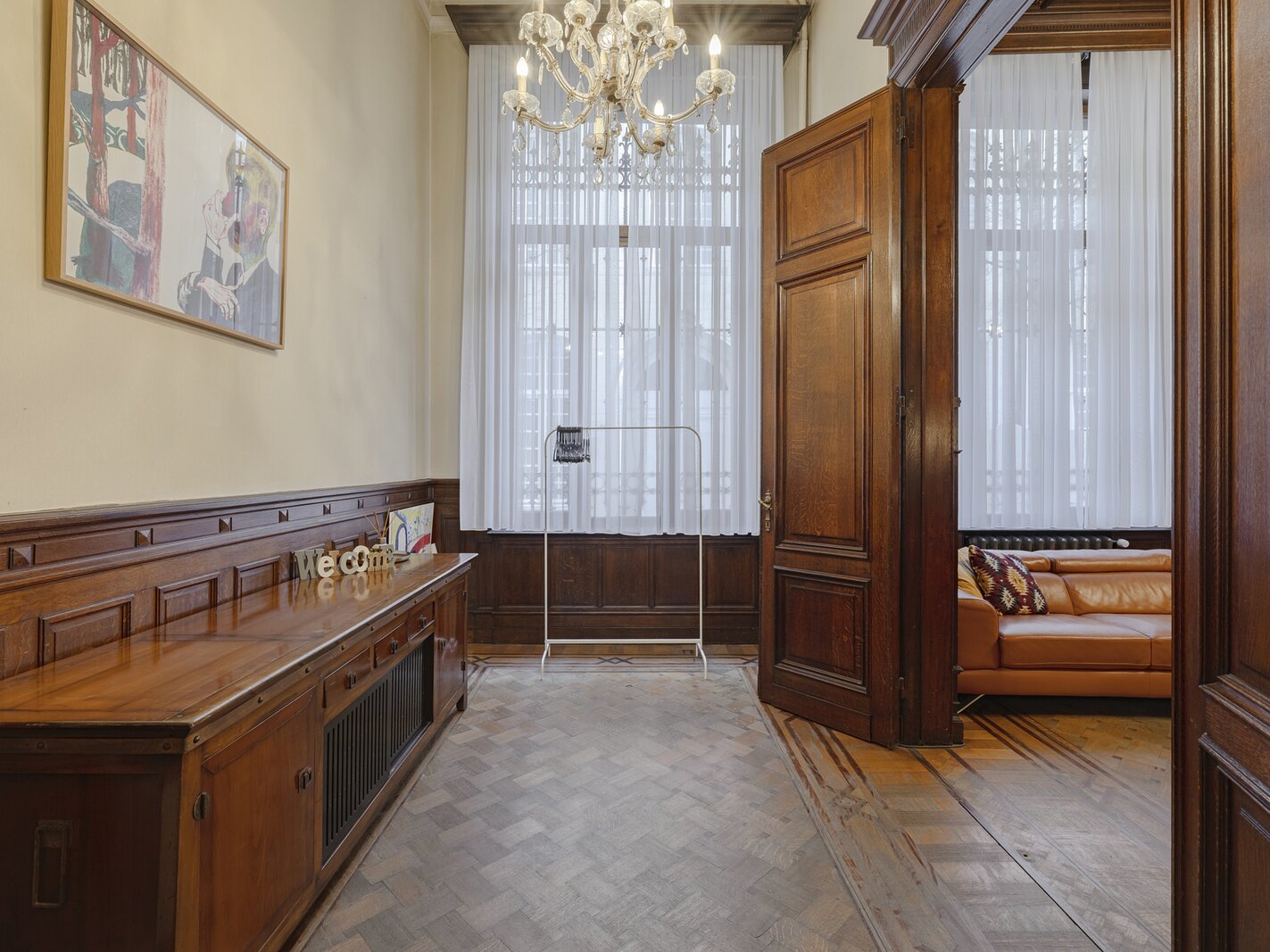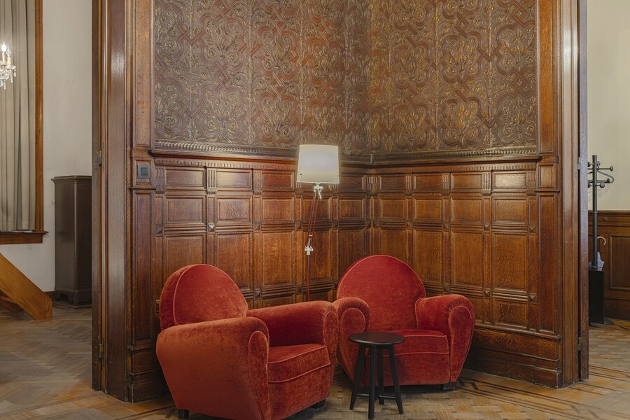 Appartement authentique meublé au rez-de-chaussée dans un palais urbain unique datant de 1892, situé au calme dans une rue sans issue, à côté de la magnifique Bourse rénovée, en plein centre historique d’Anvers, à deux pas du Meir.